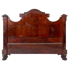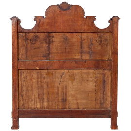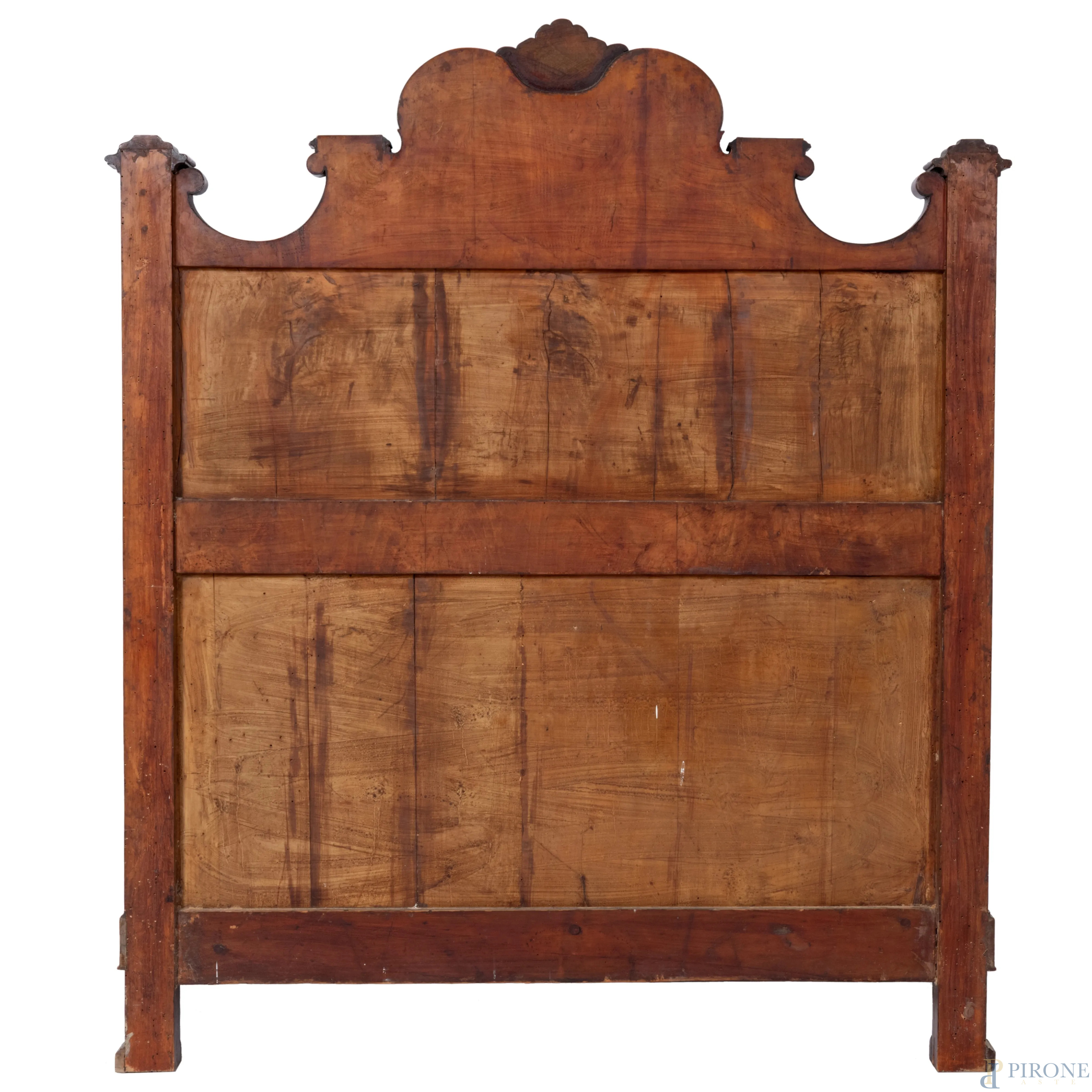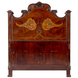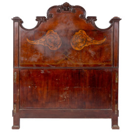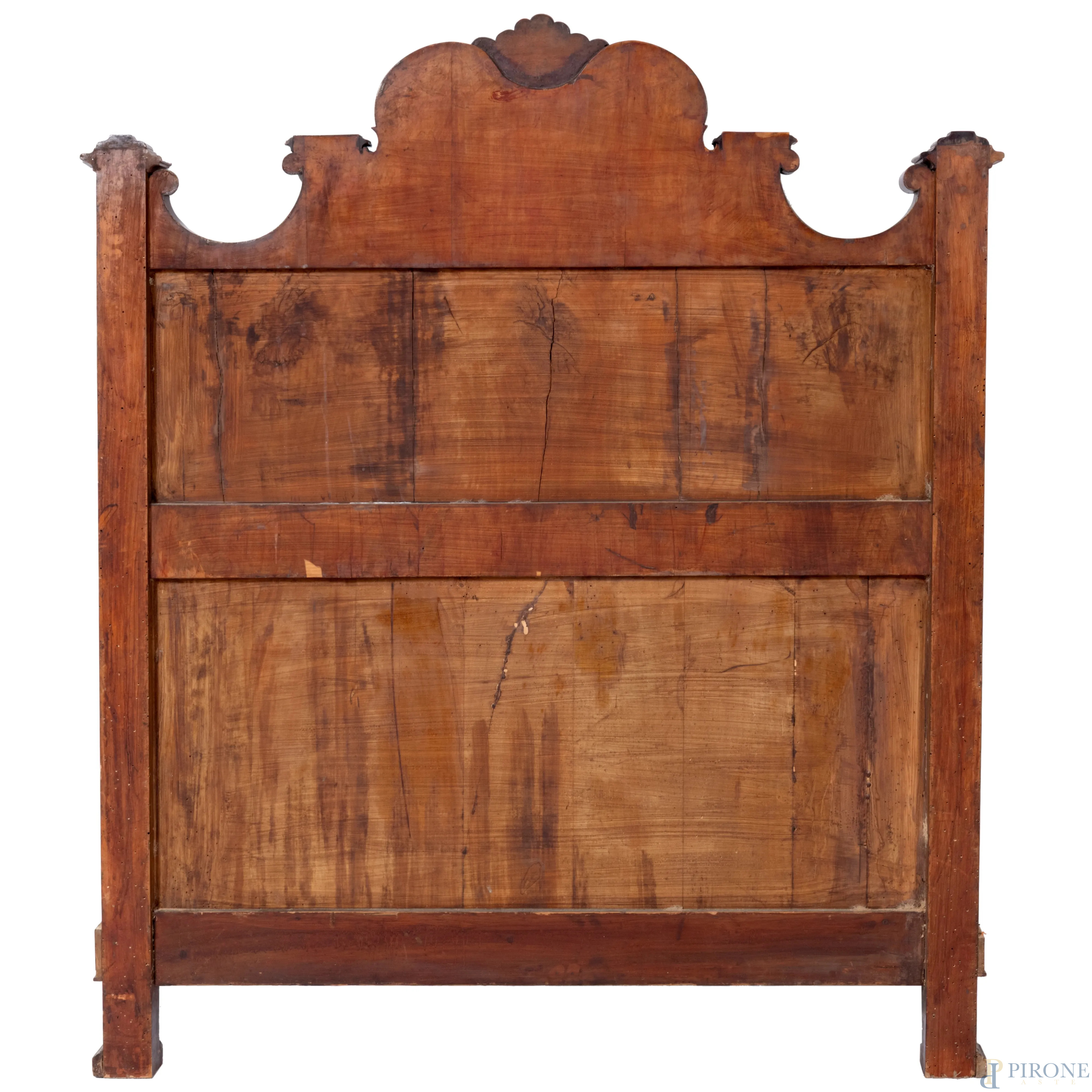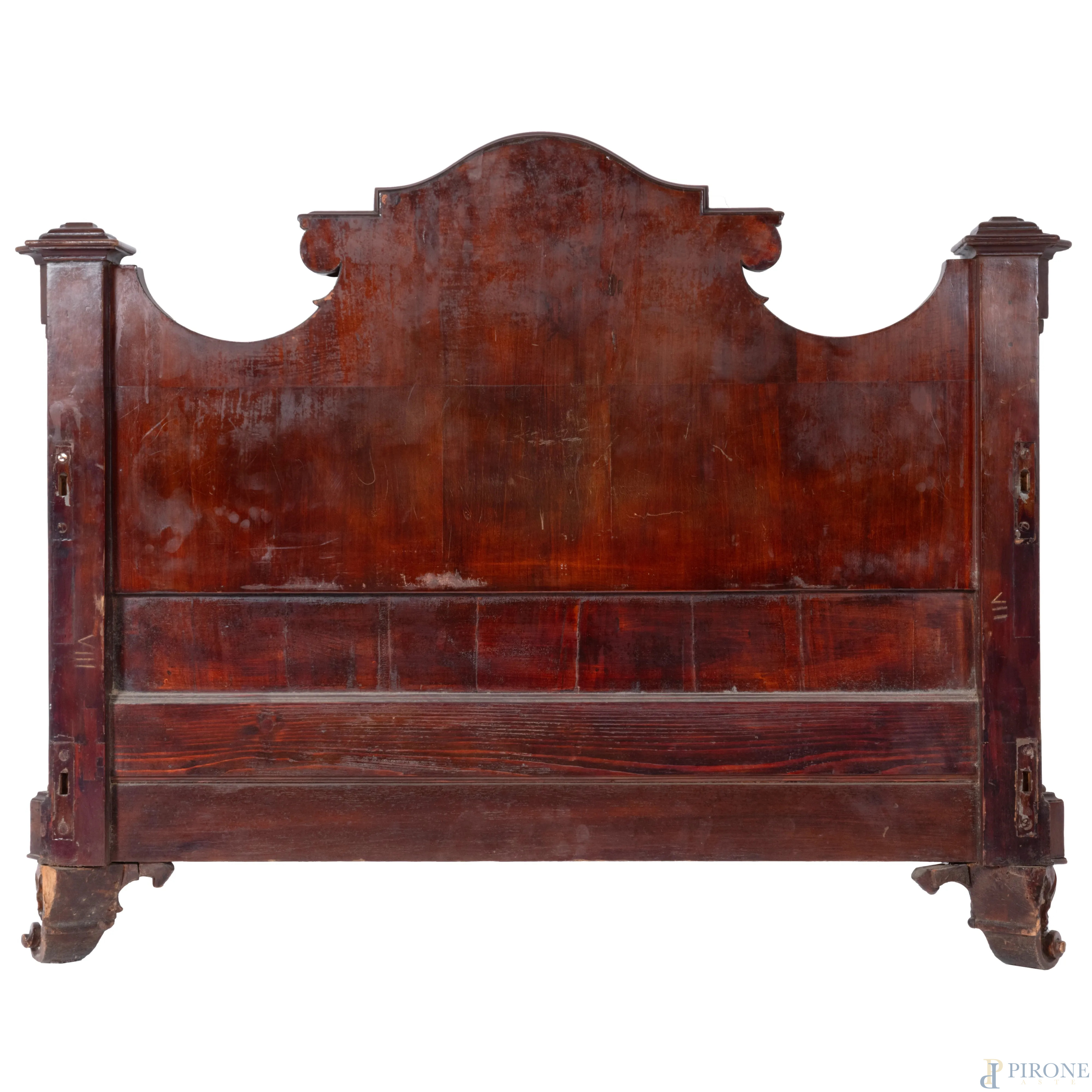 Coppia di giroletto singolo in noce impiallacciati e intasiati in varie essenze, XX secolo, testiera cm 130x110 (segni di usura, difetti)