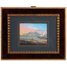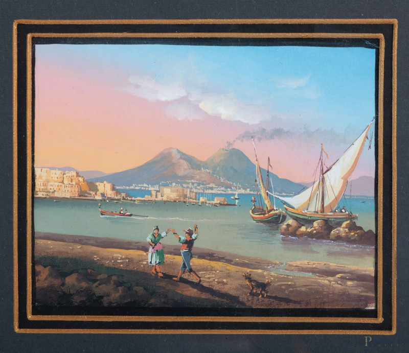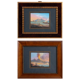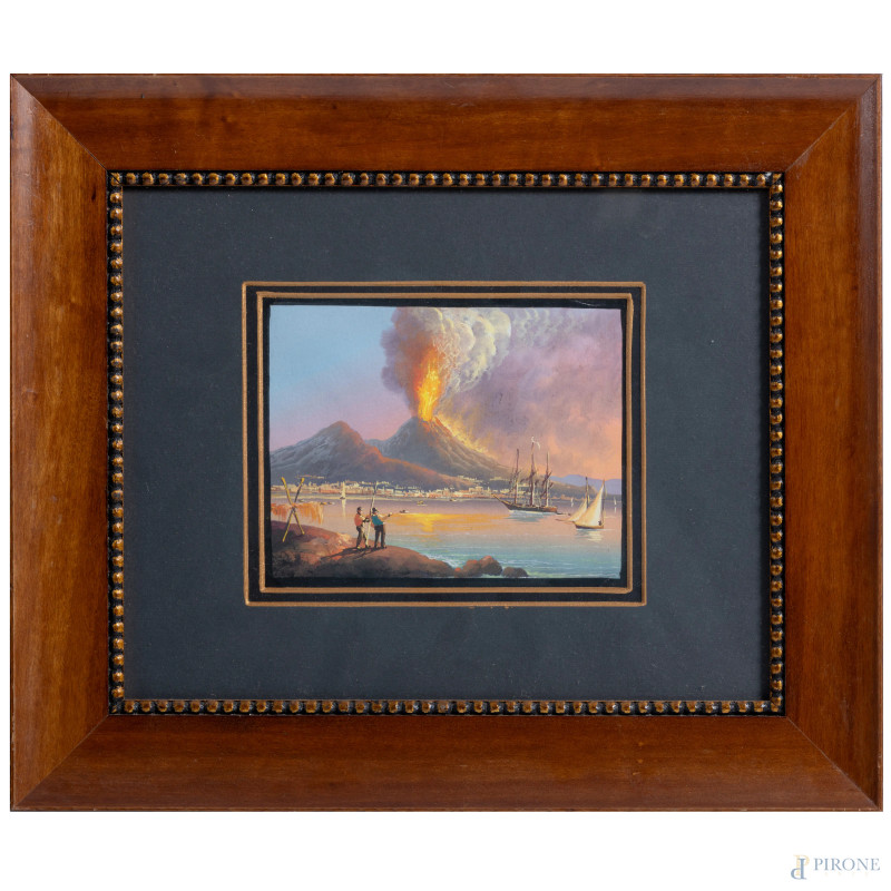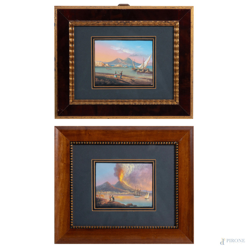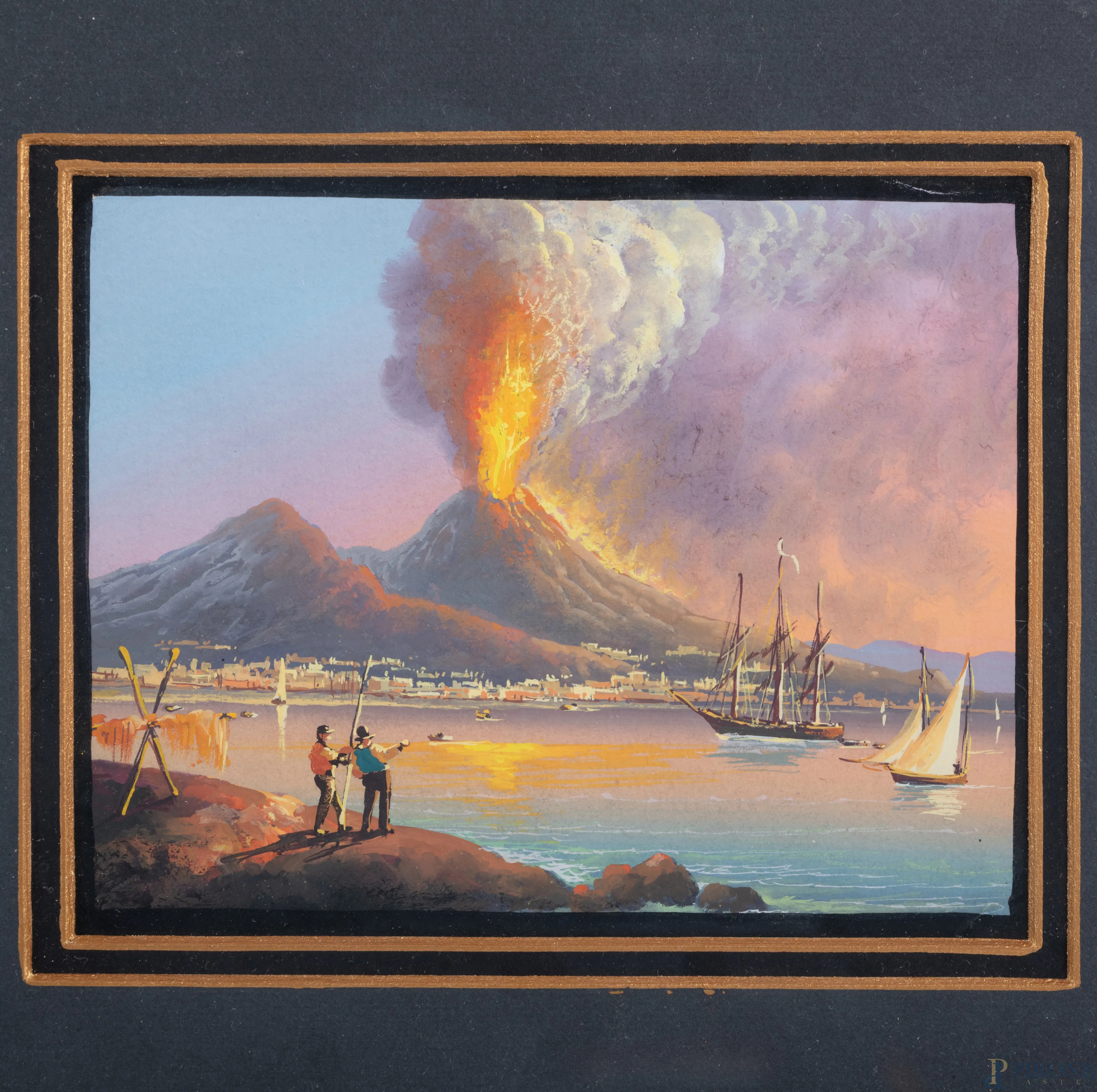 Coppia di gouaches raffiguranti vedute del Vesuvio, XX secolo, misure massime cm 19x24 compreso passepartout, entro cornice