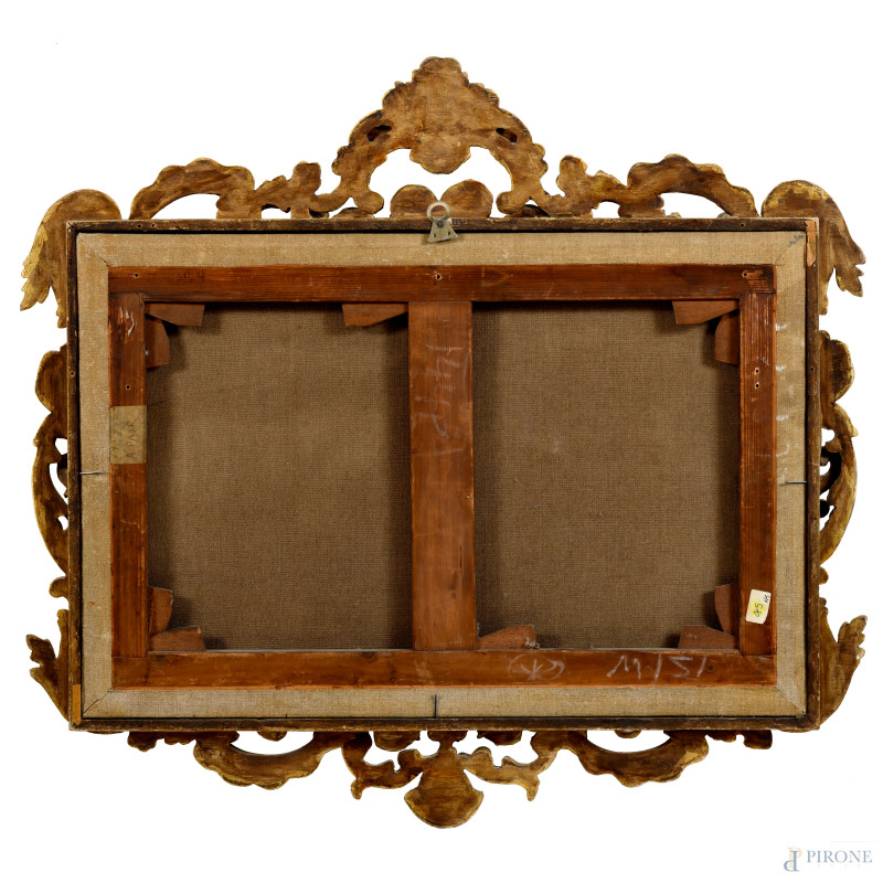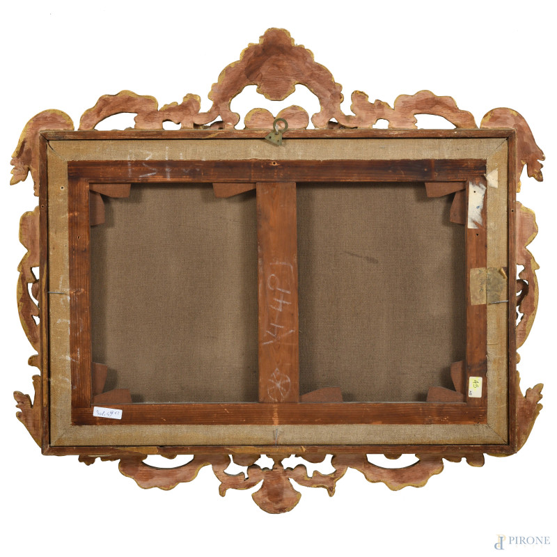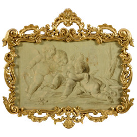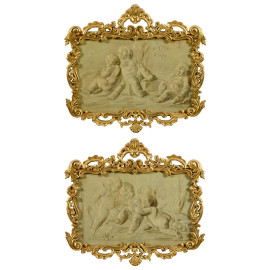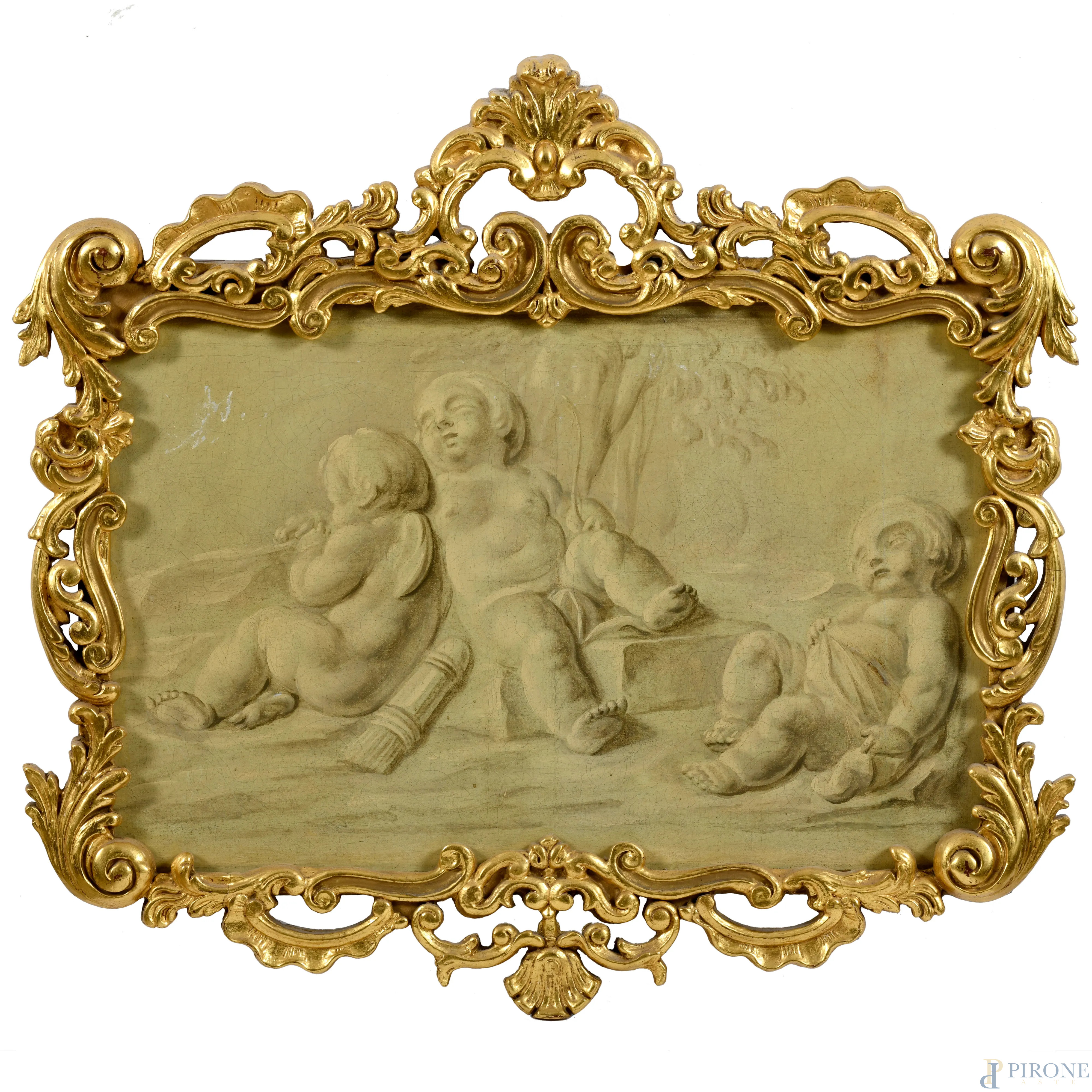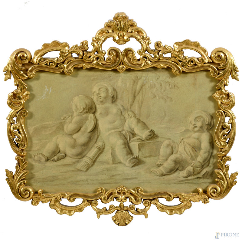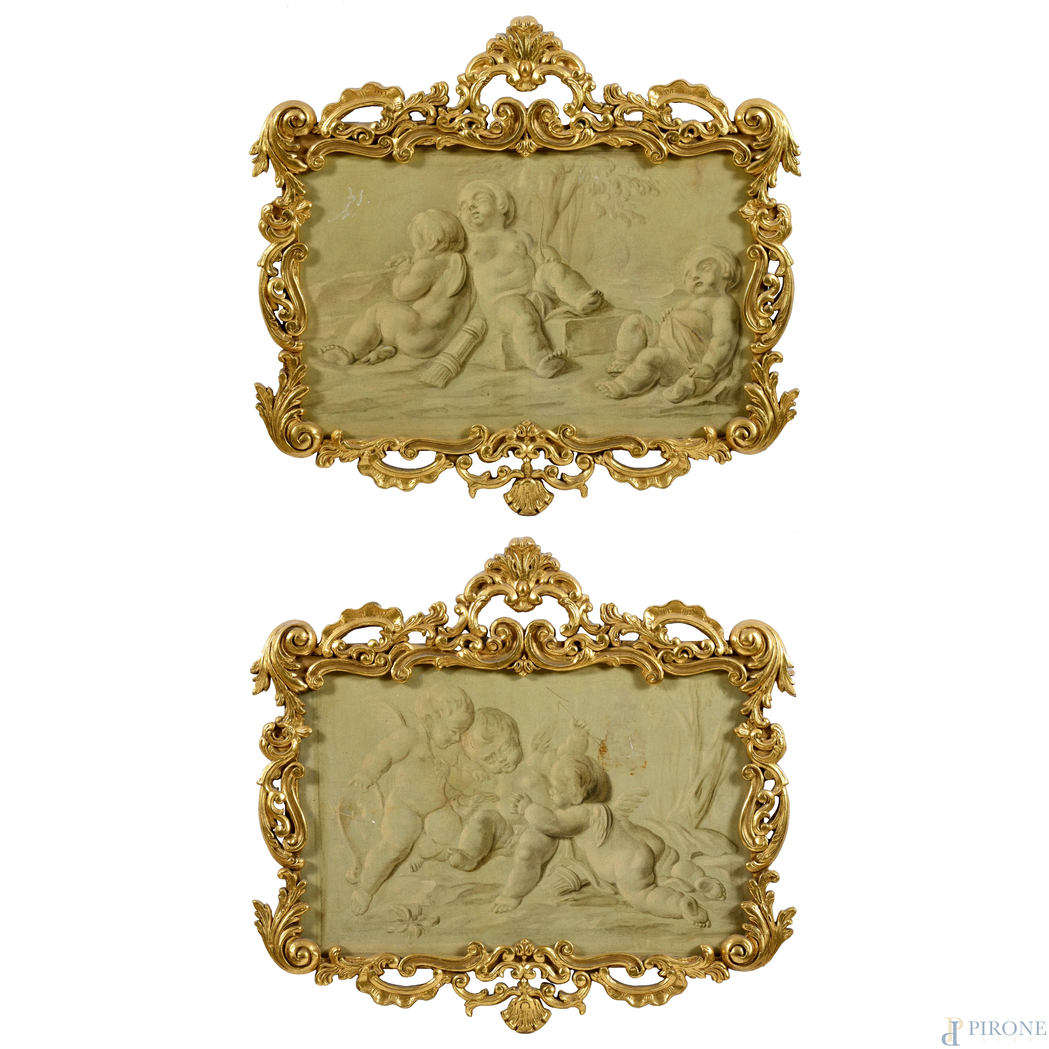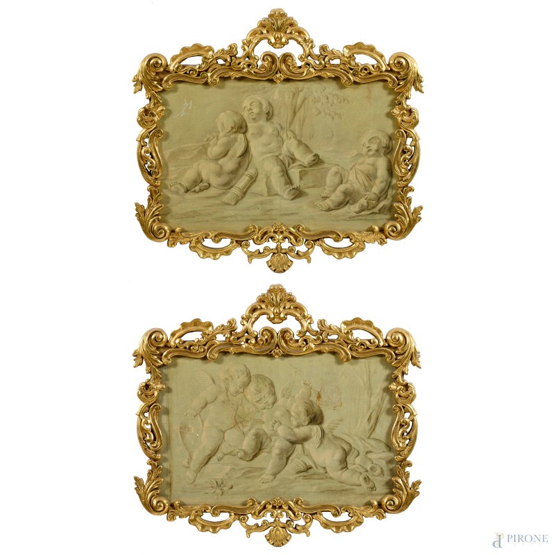 Coppia di grisailles raffiguranti putti, XIX secolo, cm 40x60, entro cornici, (craquelure)