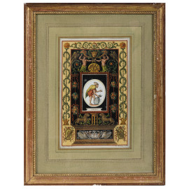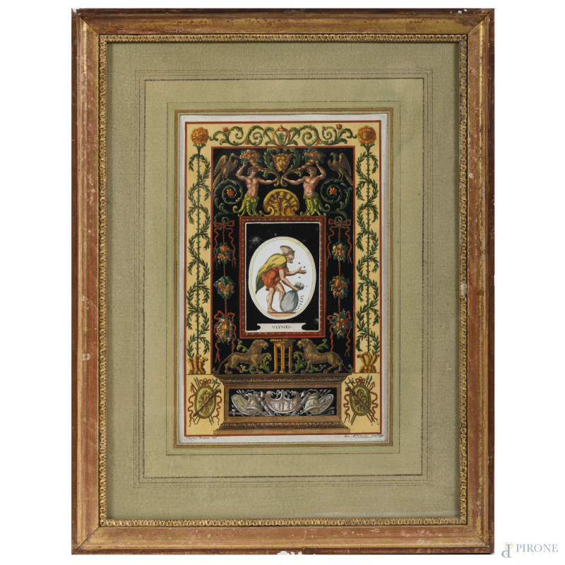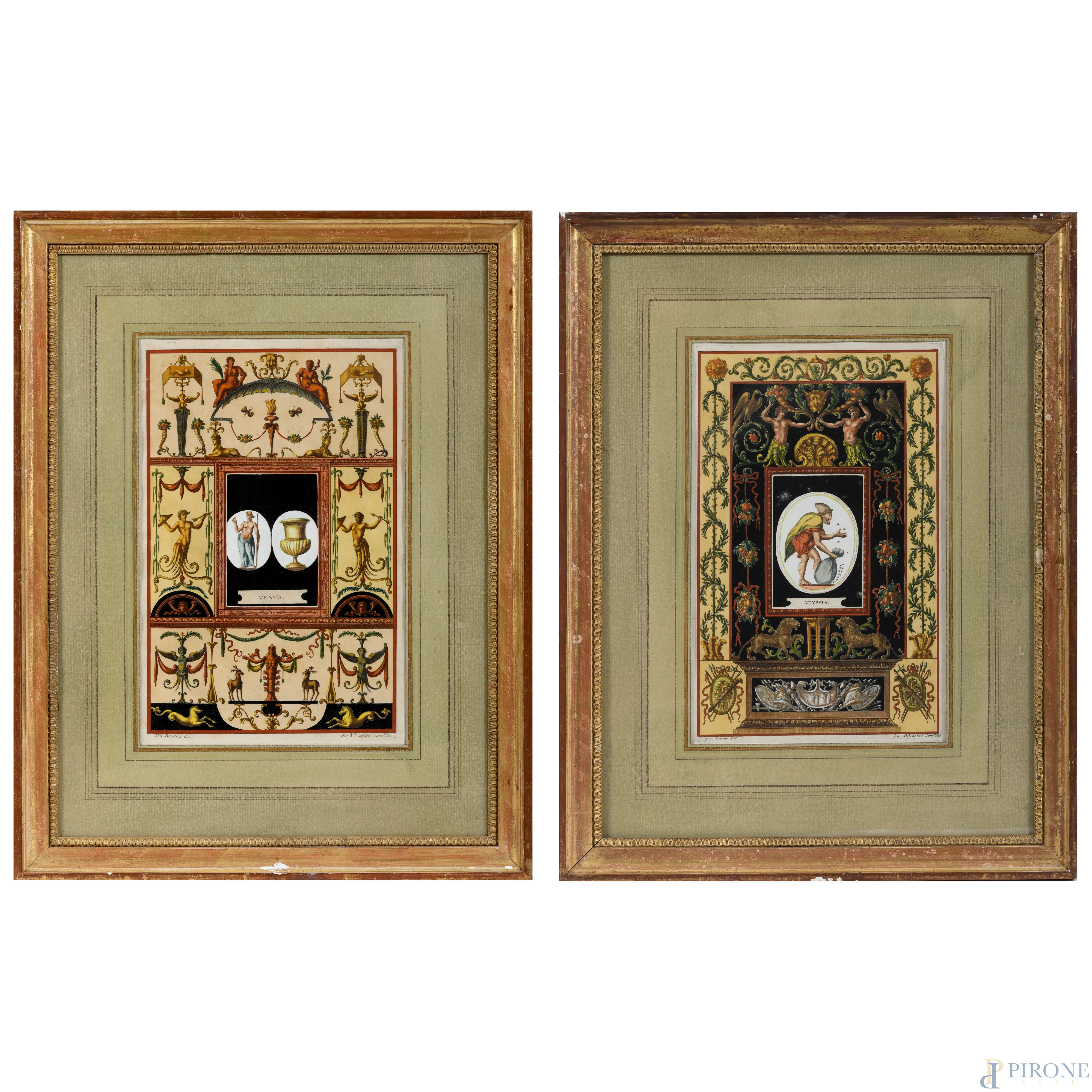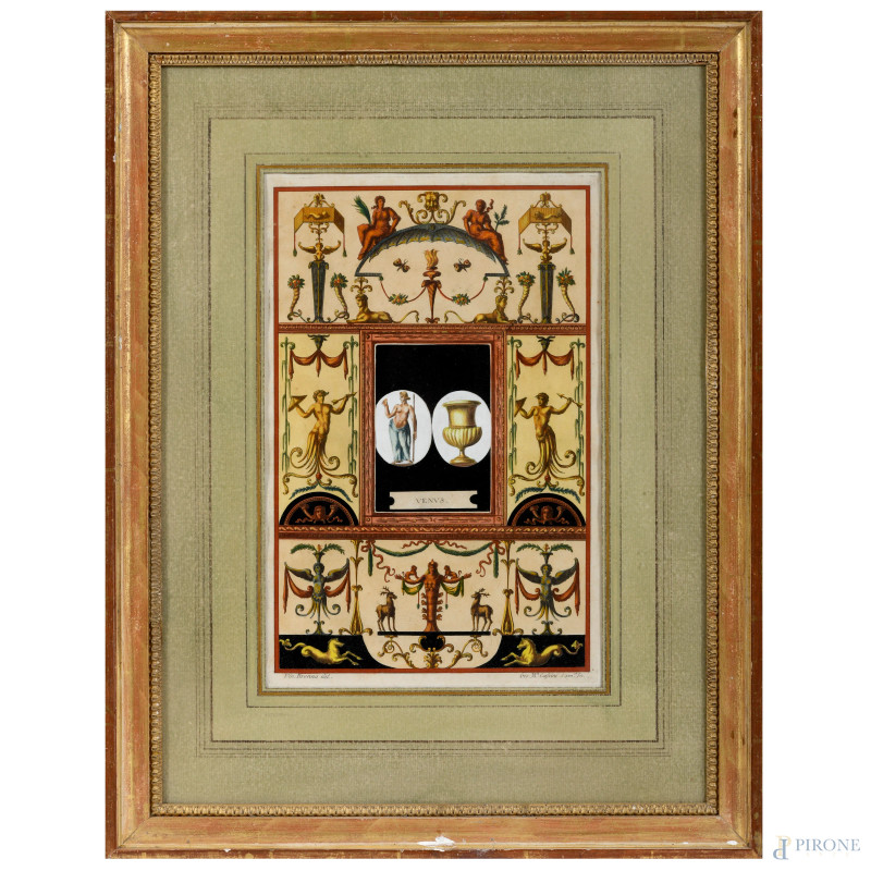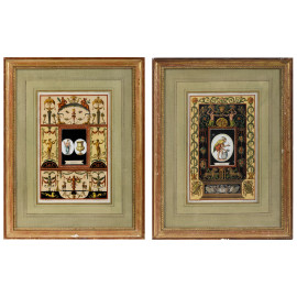 Coppia di incisioni acquerellate raffiguranti grottesche, cm 38x24, entro cornice