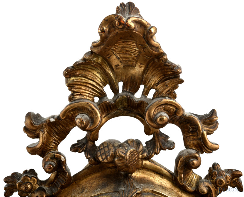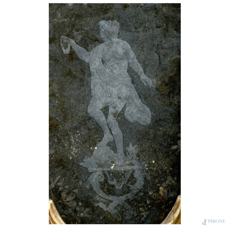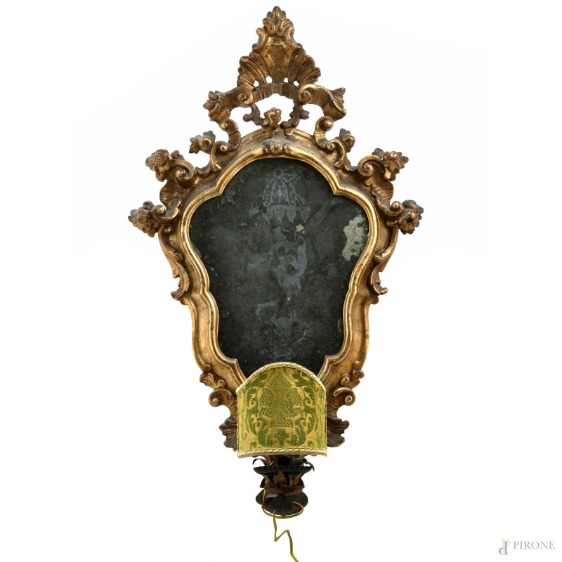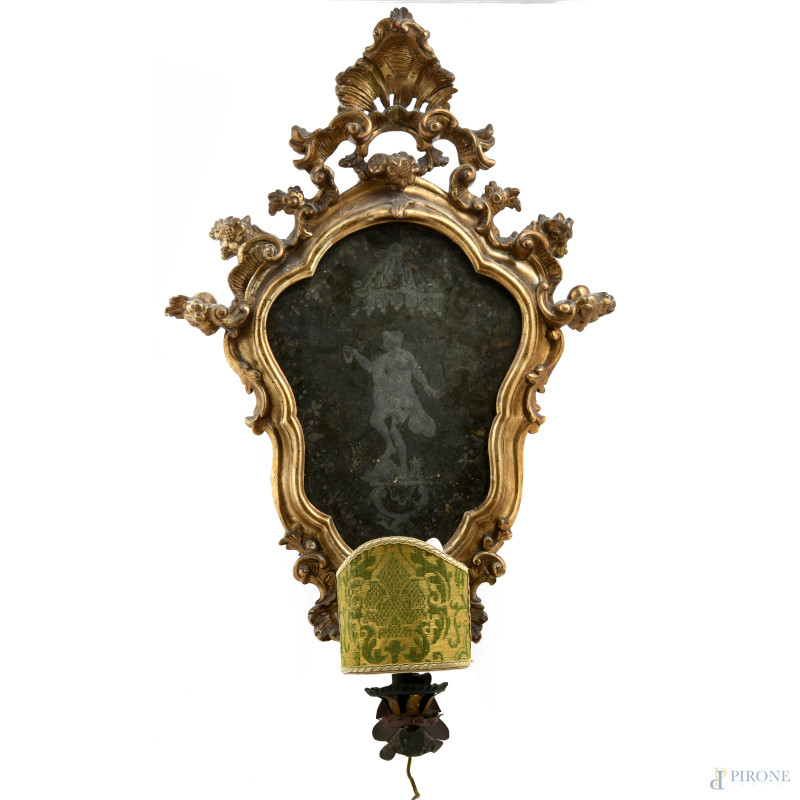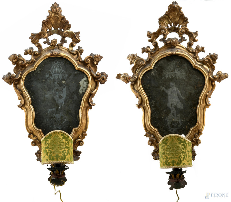 Coppia di lumiere in legno dorato e intagliato con specchi al mercurio e decori raffiguranti figura virile e femminile, XX secolo, cm 70x43 circa, (difetti, segni di usura, scalfiture, rotture, restauri)