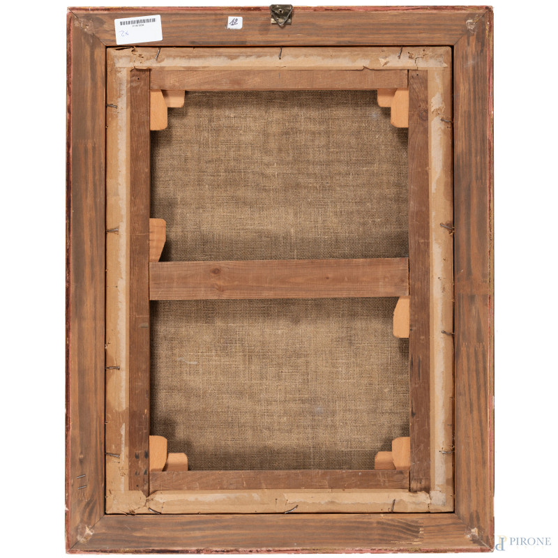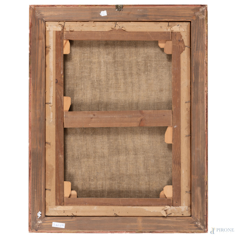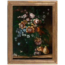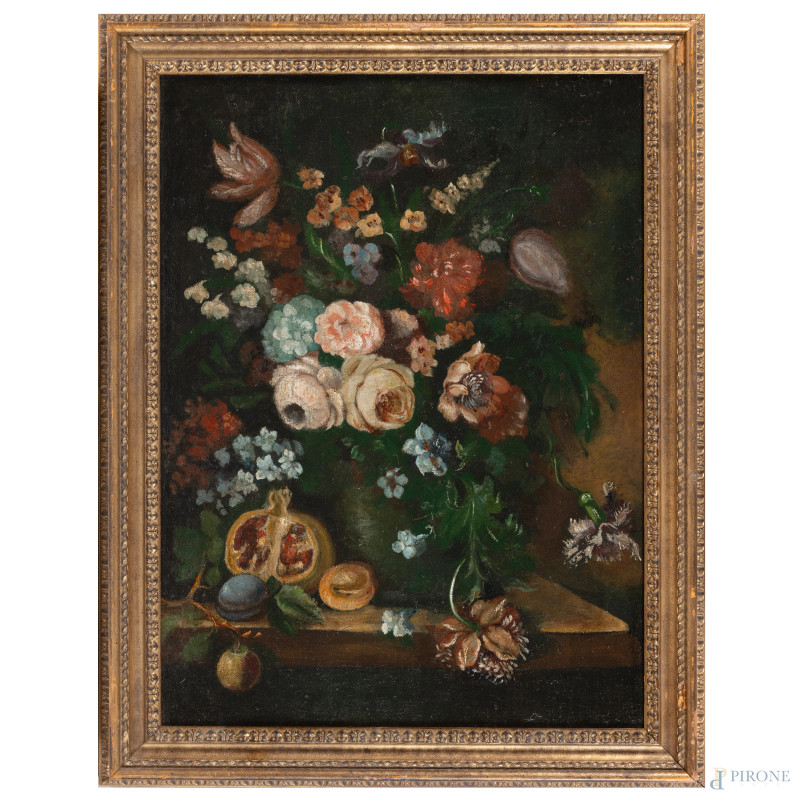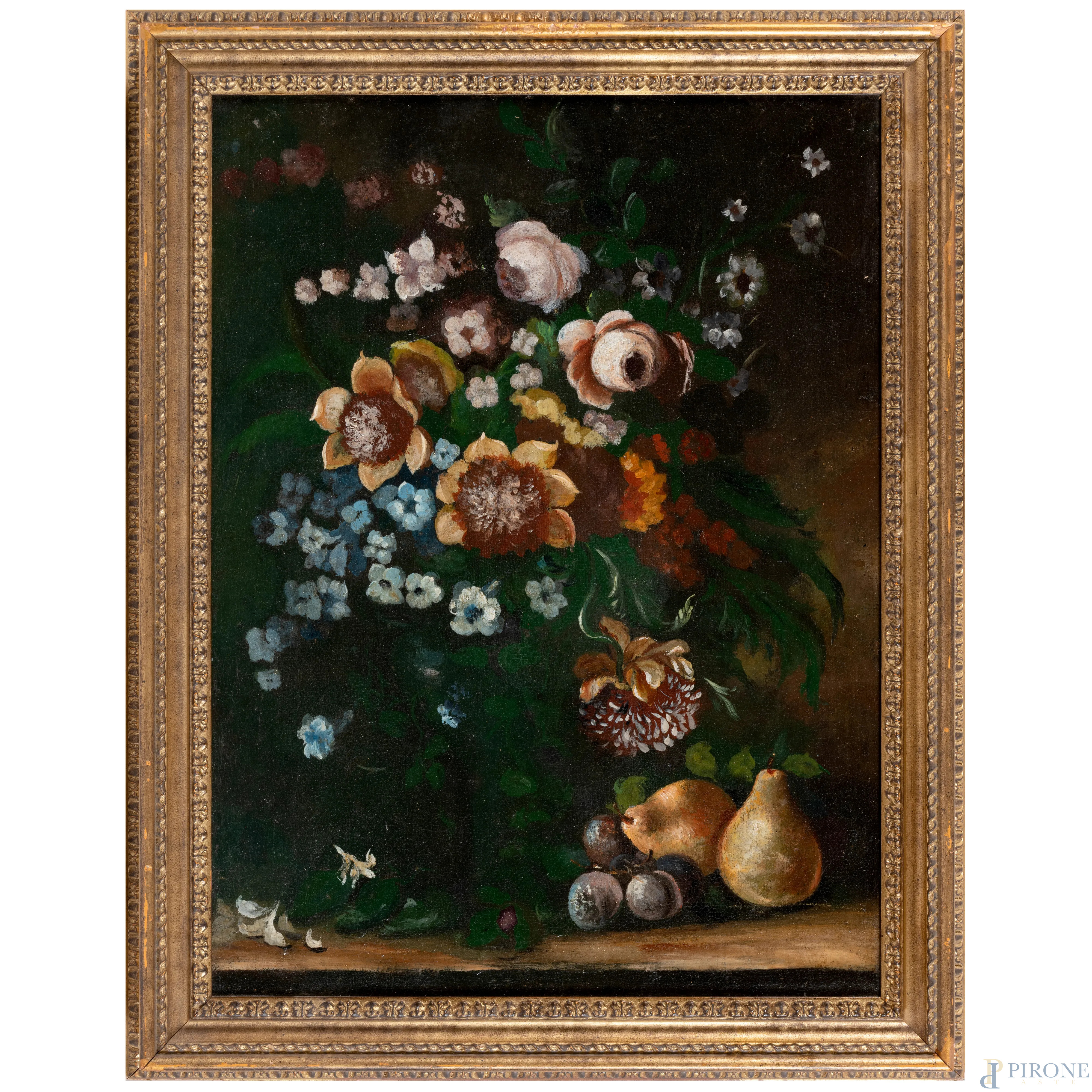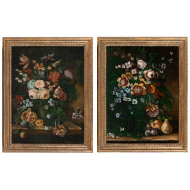 Coppia di nature morte di fiori e frutta, XIX secolo, olio su tela, cm 57,5x42,5, entro cornice