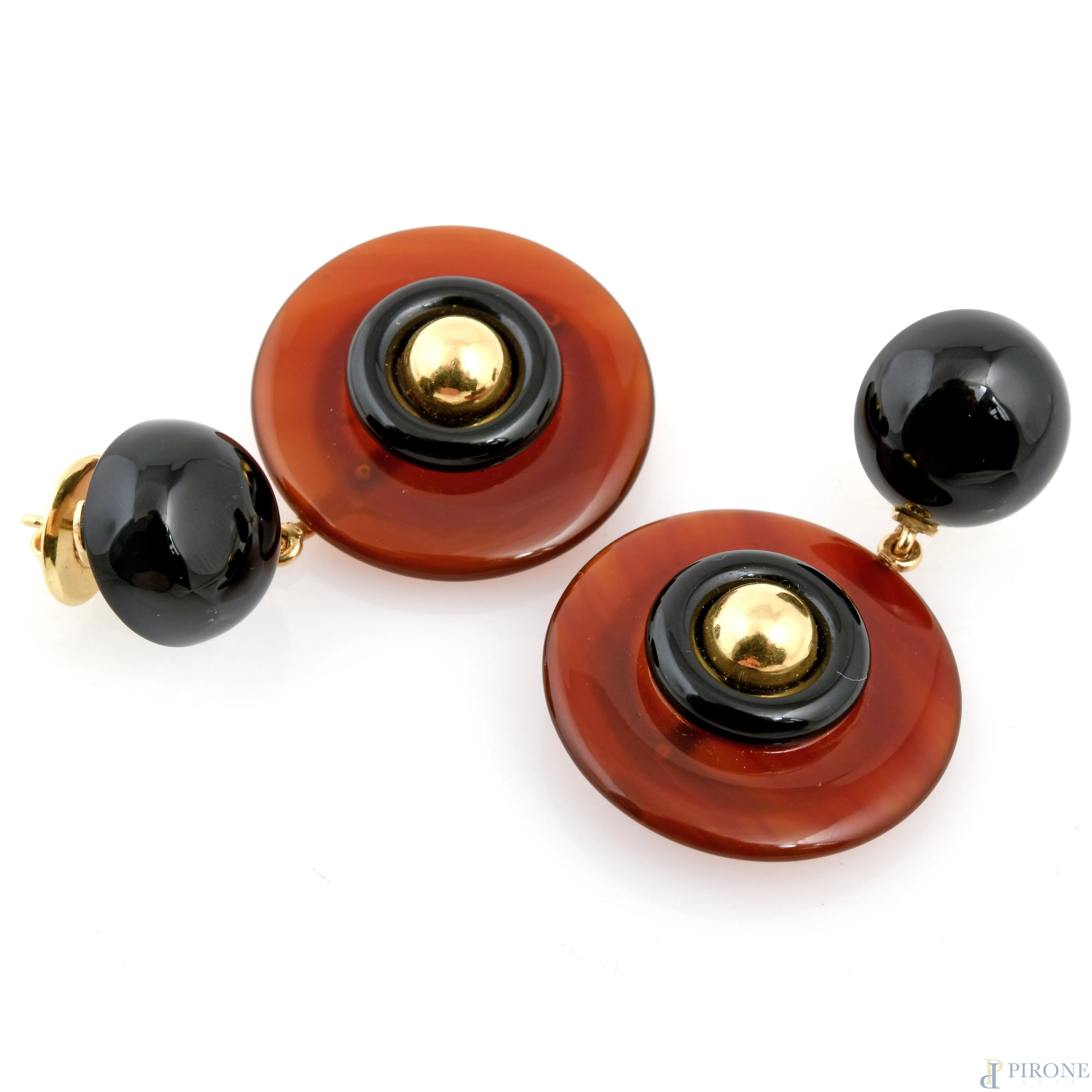 Coppia di orecchini Decò in oro e resina, cm 5, peso complessivo lordo gr 26,5