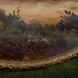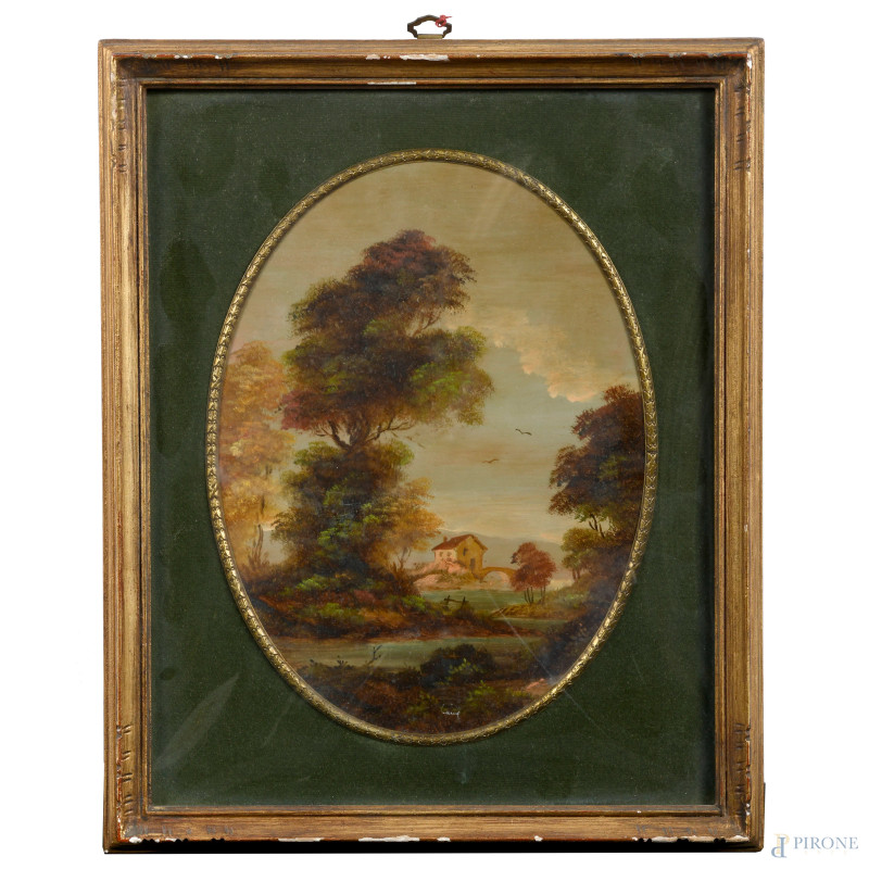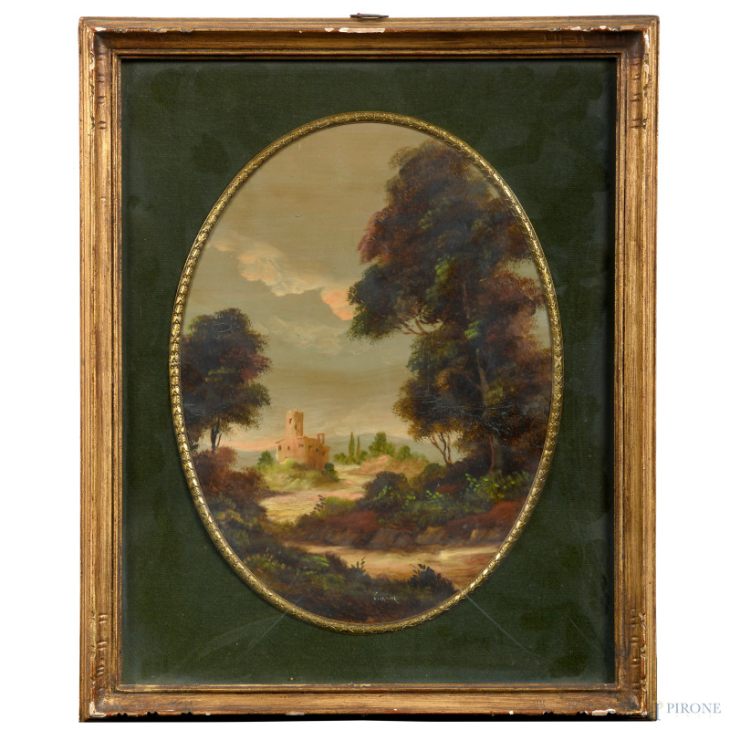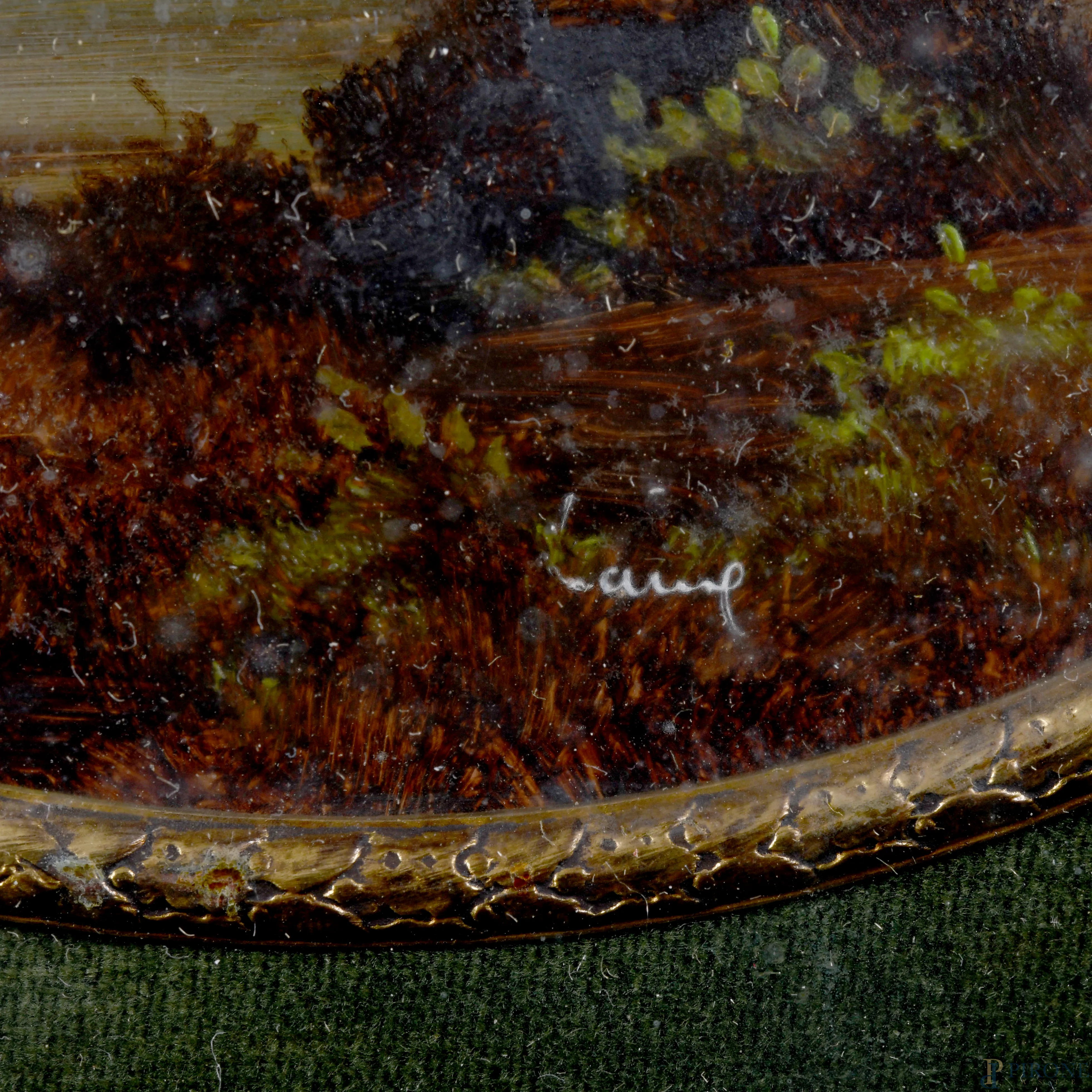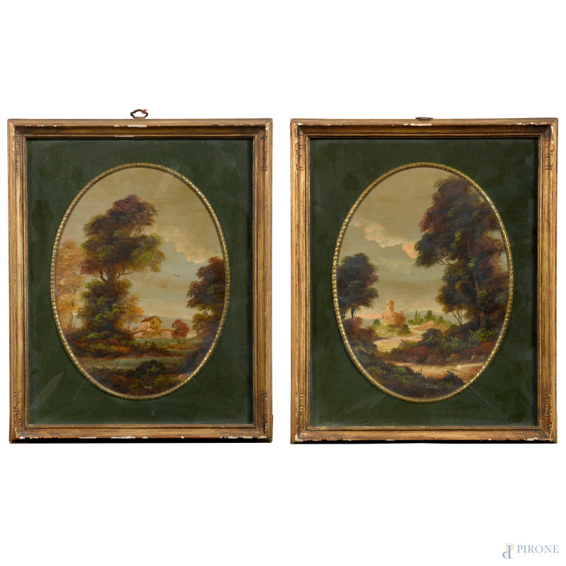 Coppia di paesaggi, XX secolo, olio su rame in serto ovale, cm 24x18, entro cornice