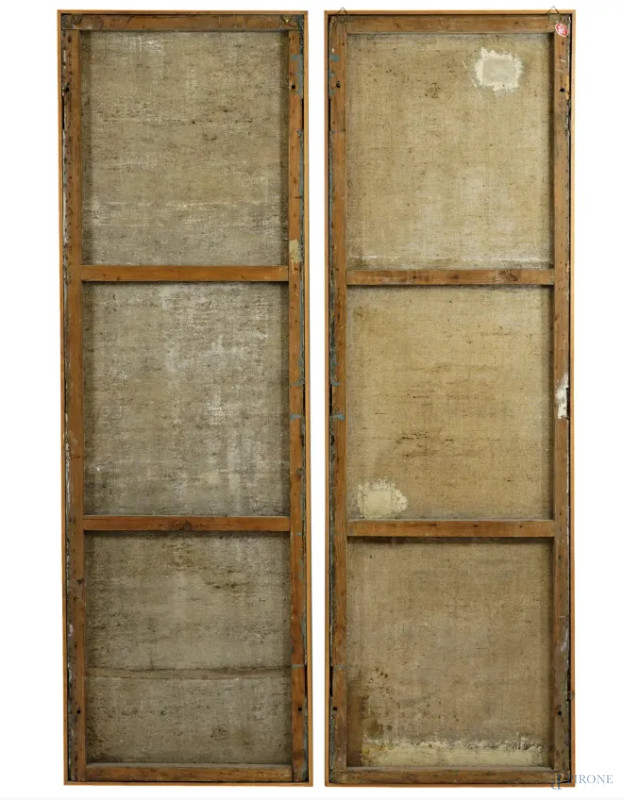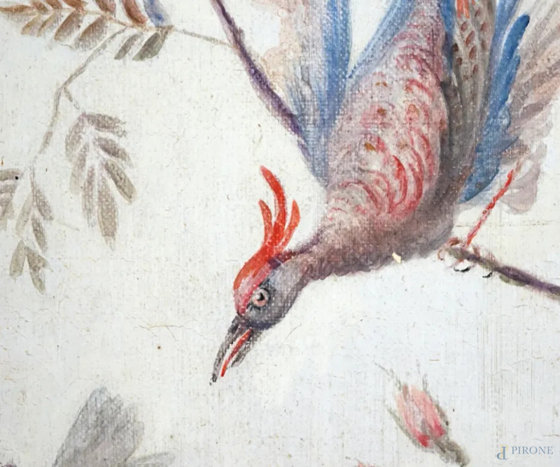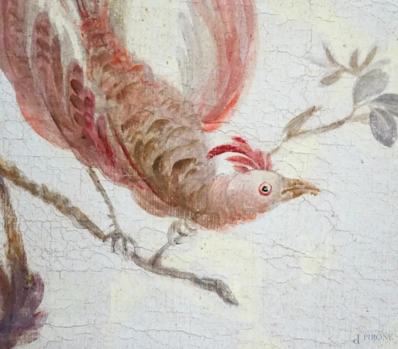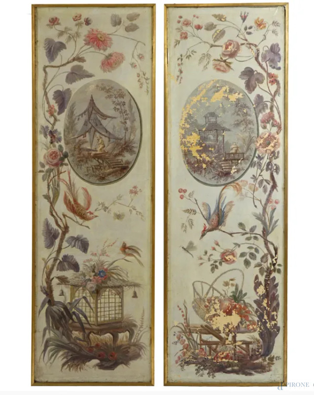 Coppia di pannelli decorati a cineseria con piante e volatili, XIX-XX secolo, olio su tela, cm 175x54,5, entro cornici, (segni di usura)