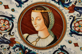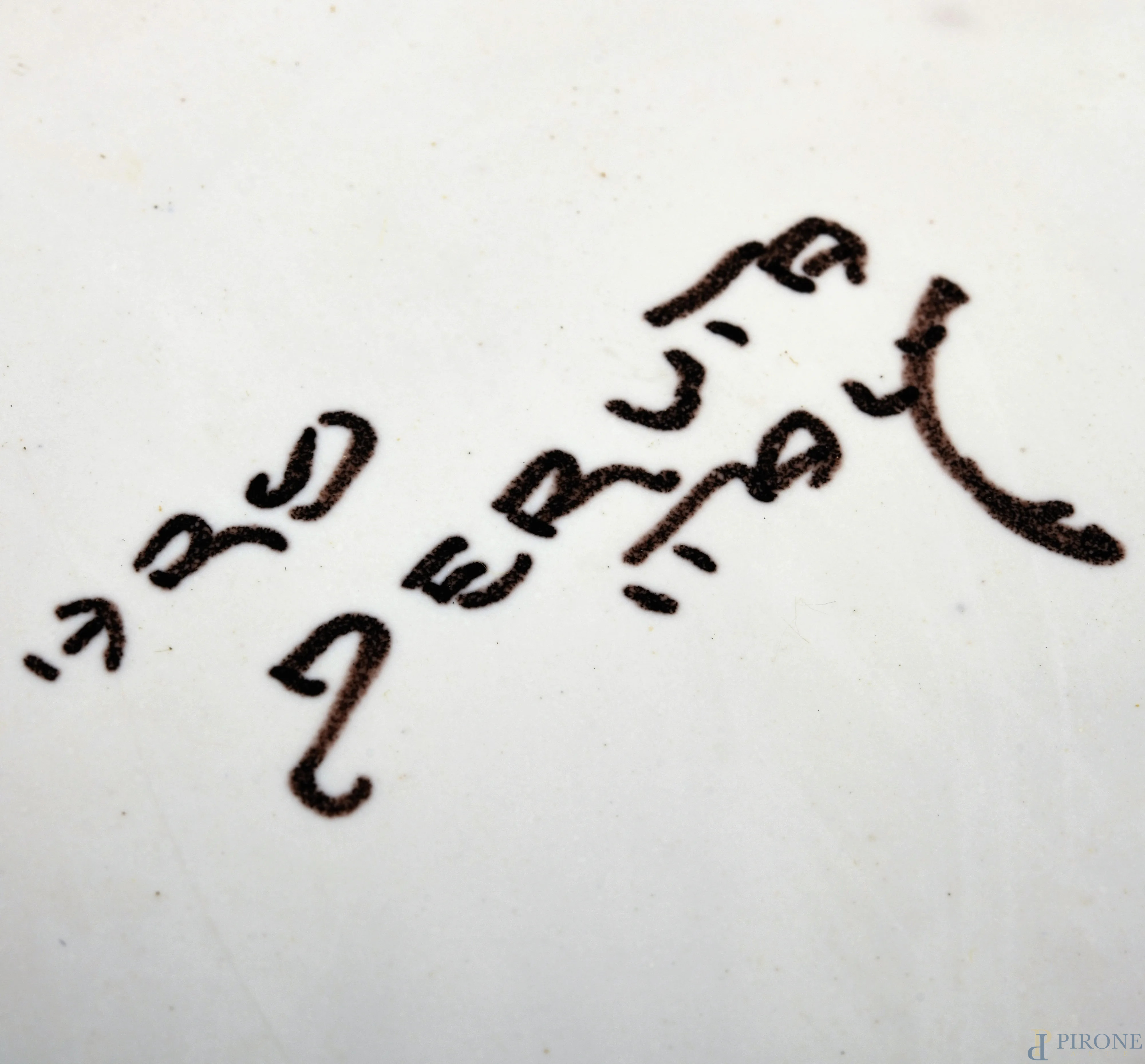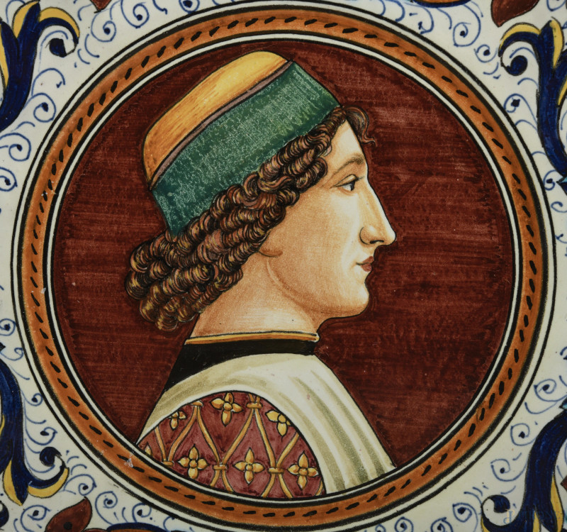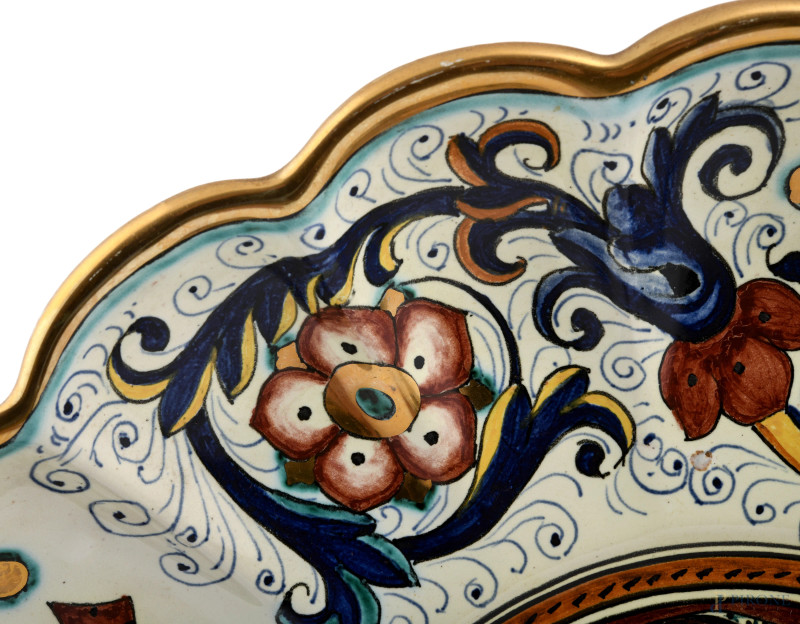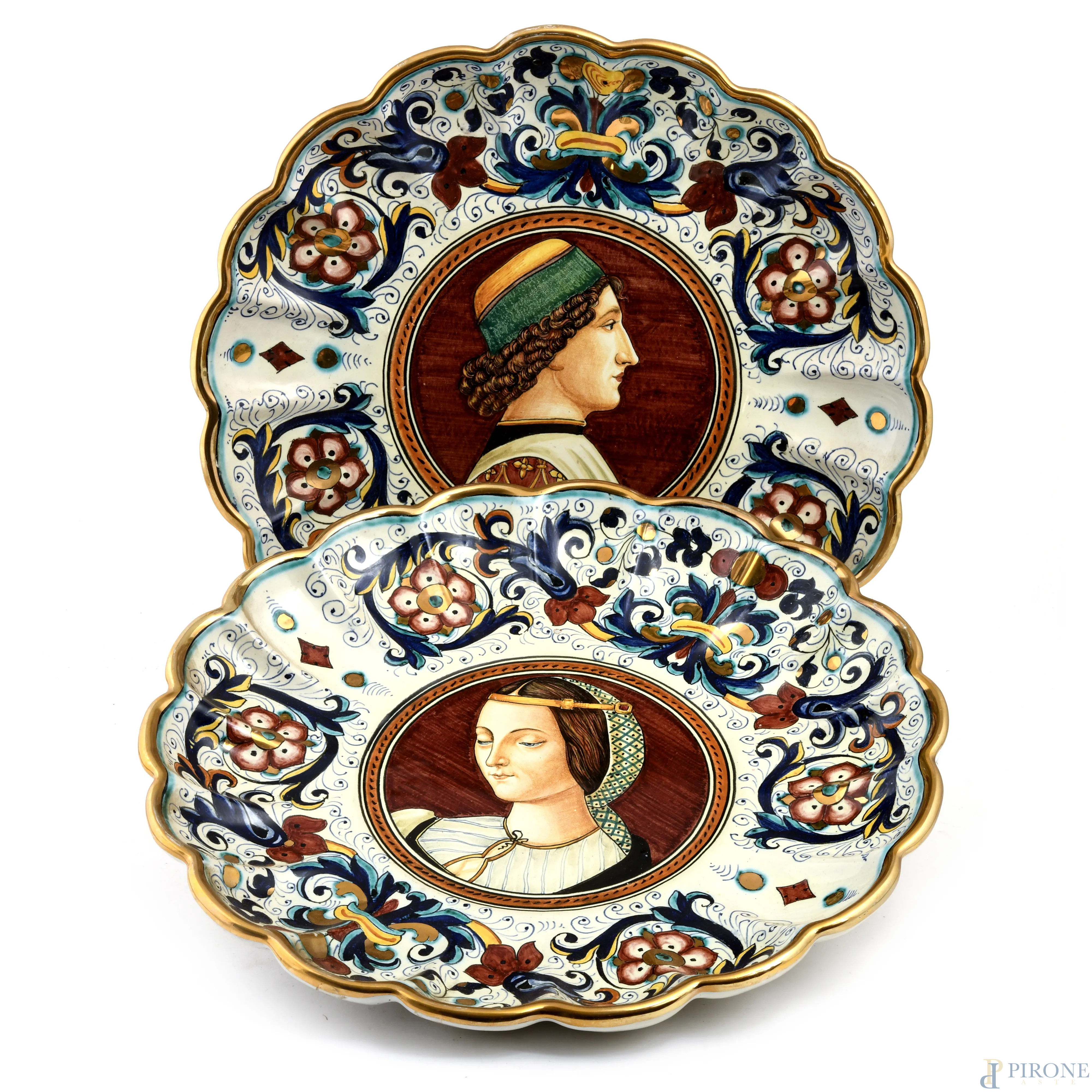 Coppia di piatti in maiolica di Deruta con orlo polilobato e profili al cavetto, XX secolo, diametro cm 39, (segni di usura, scalfiture, cadute di smalto)