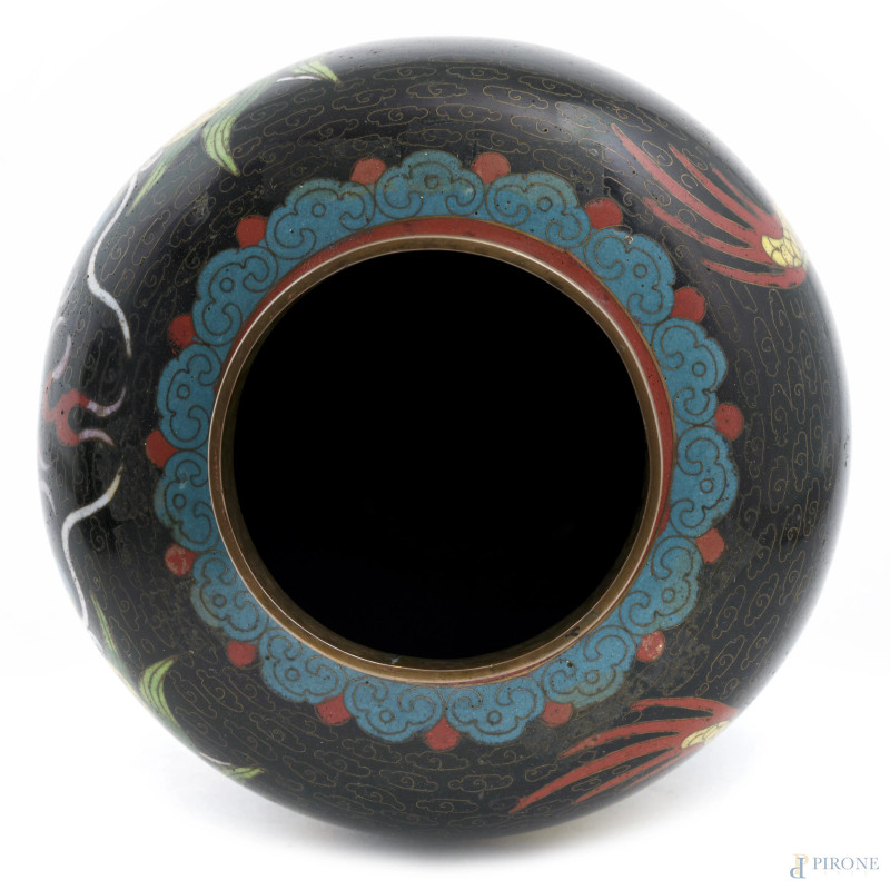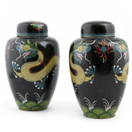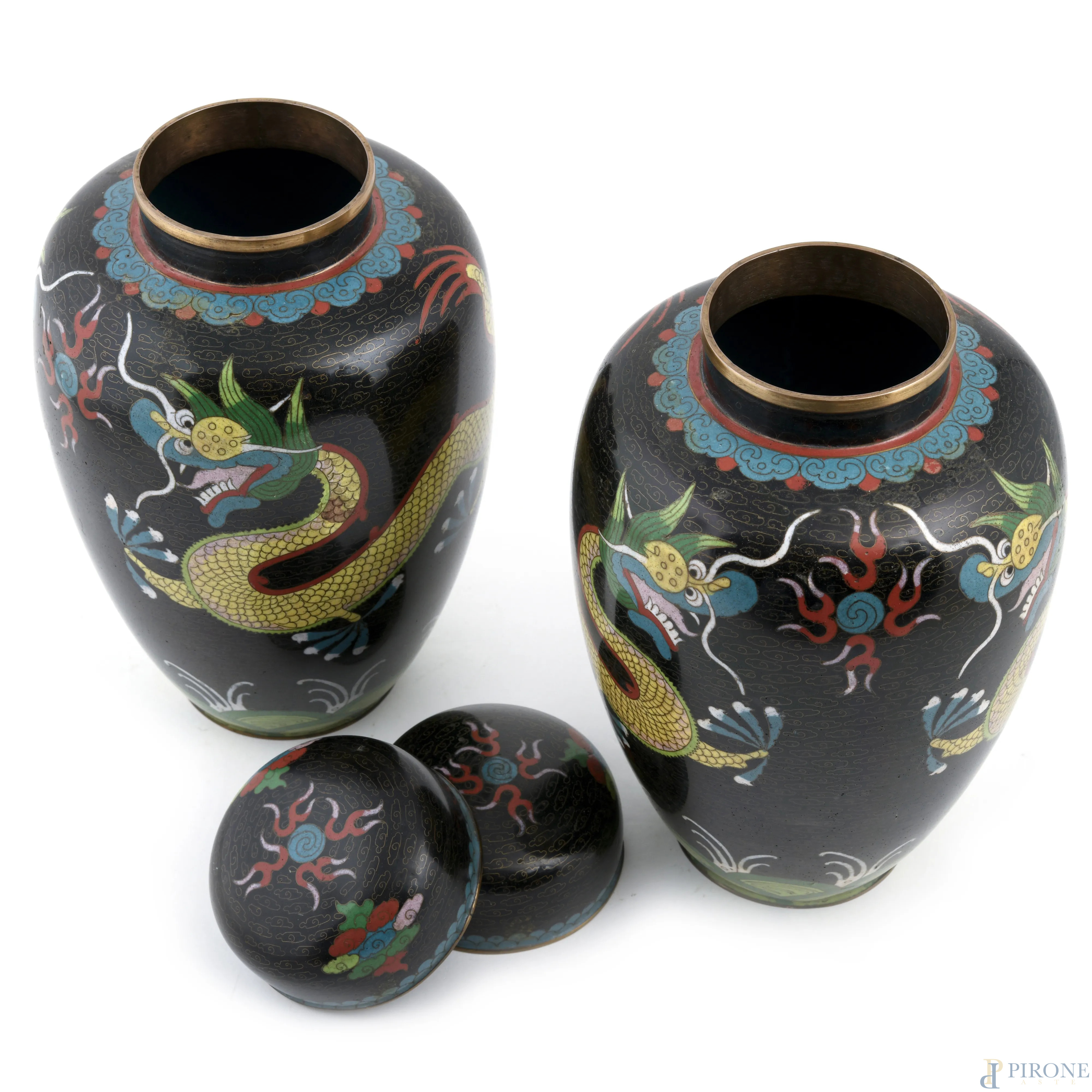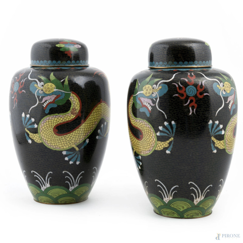 Coppia di potiche cloisonnè decorate con dragoni su fondo nero, XX secolo, altezza cm 25