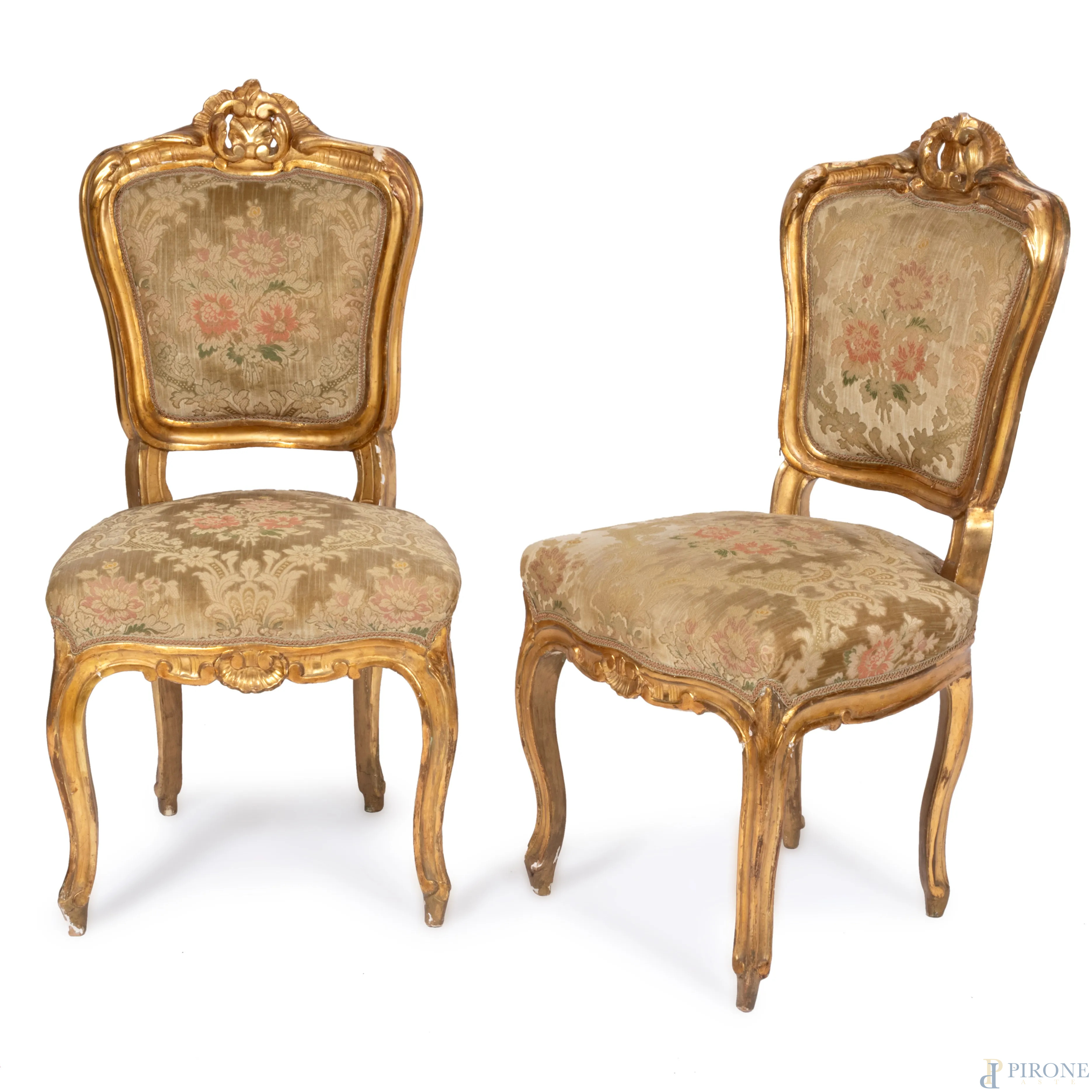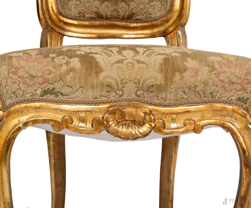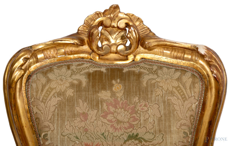 Coppia di sedie in legno intagliato e dorato, XIX-XX secolo. Seduta e schienale imbottiti e rivestiti, cm 95x47x46, (difetti, segni di usura, cadute di doratura, scalfiture)