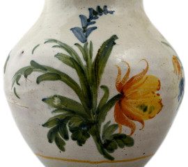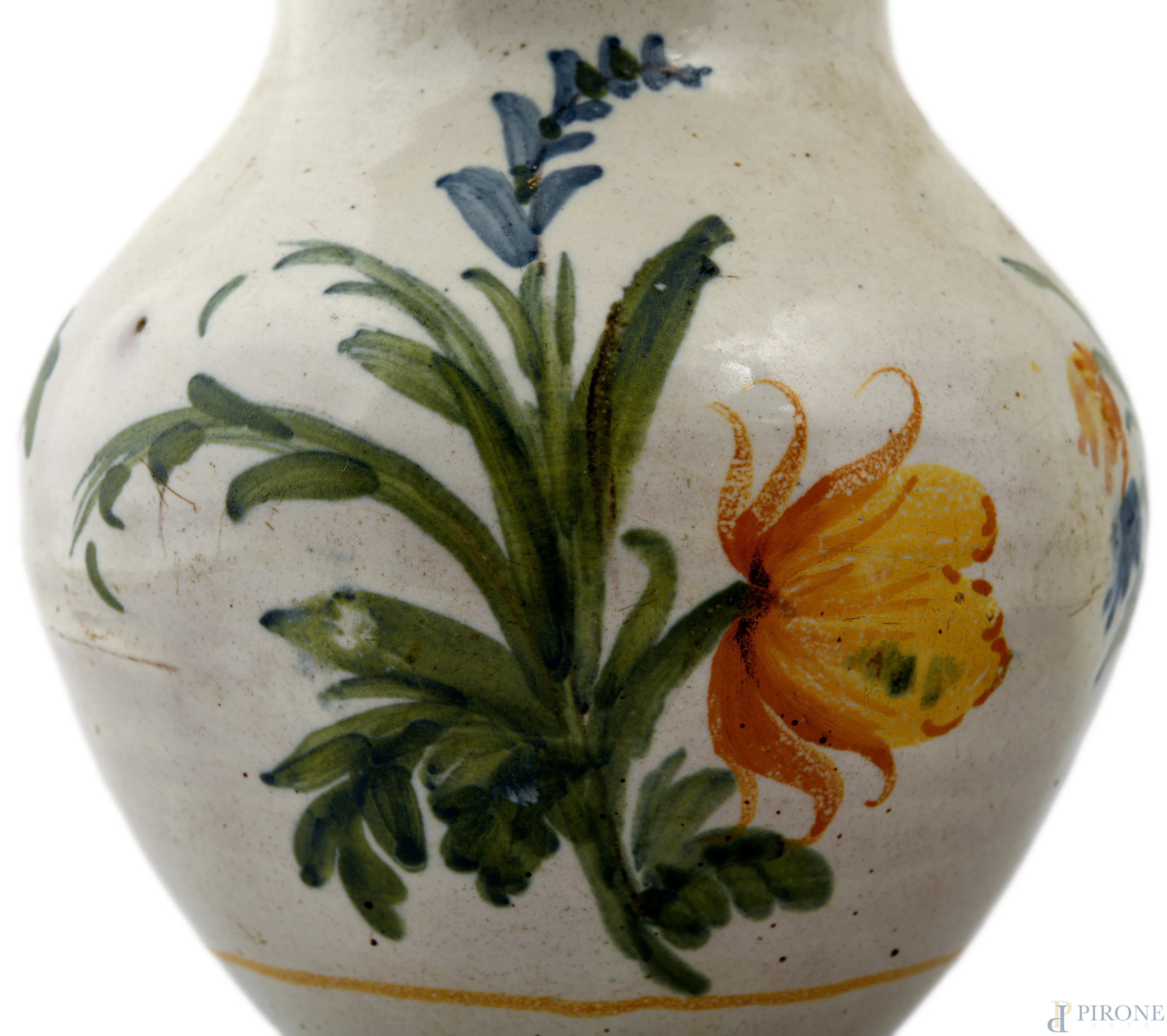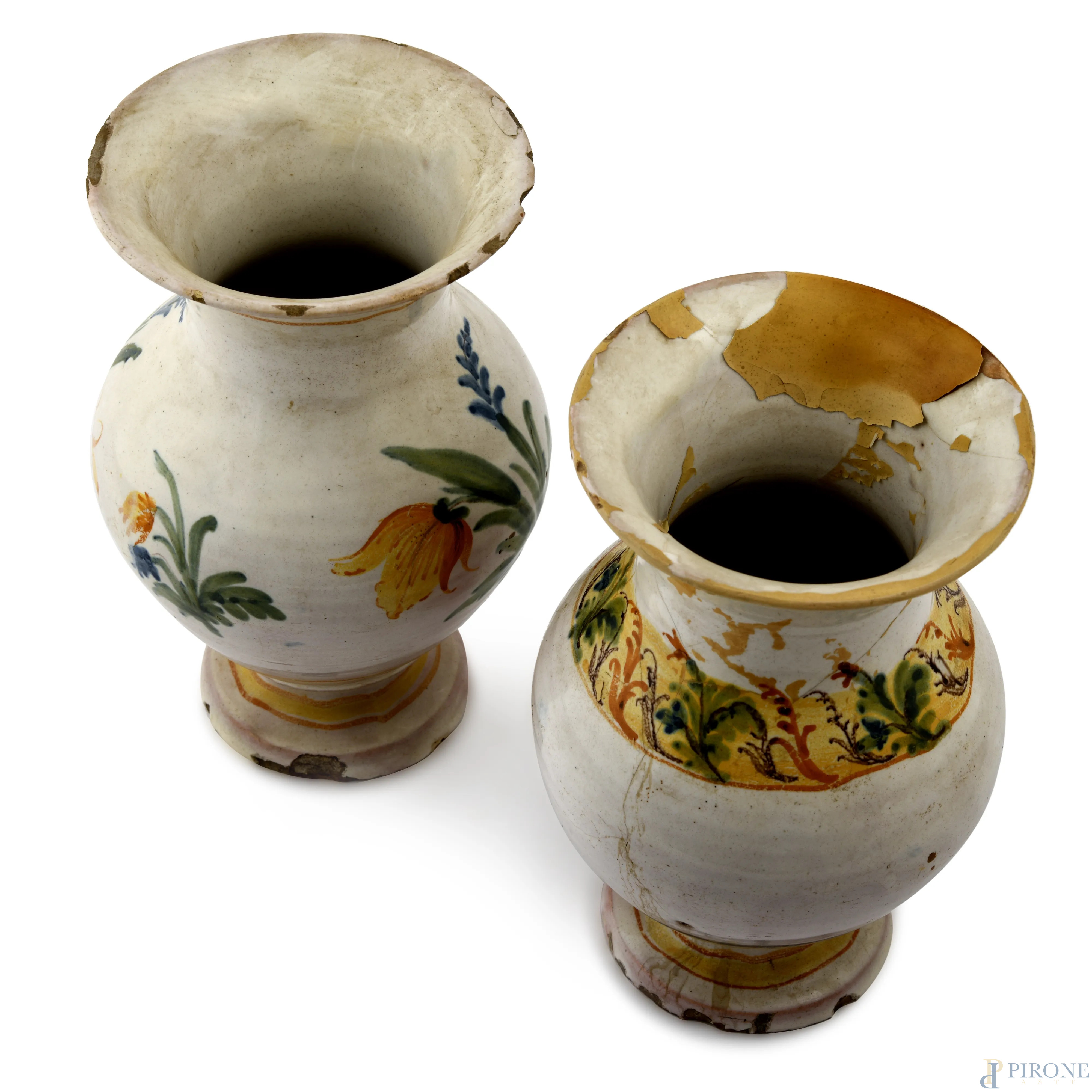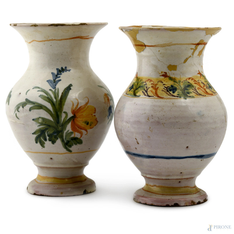 Coppia di vasetti in maiolica dipinta e smaltata, XX secolo, altezza cm 21 (sbeccature, scalfiture, cadute di smalto stannifero, restauri, mancanze)