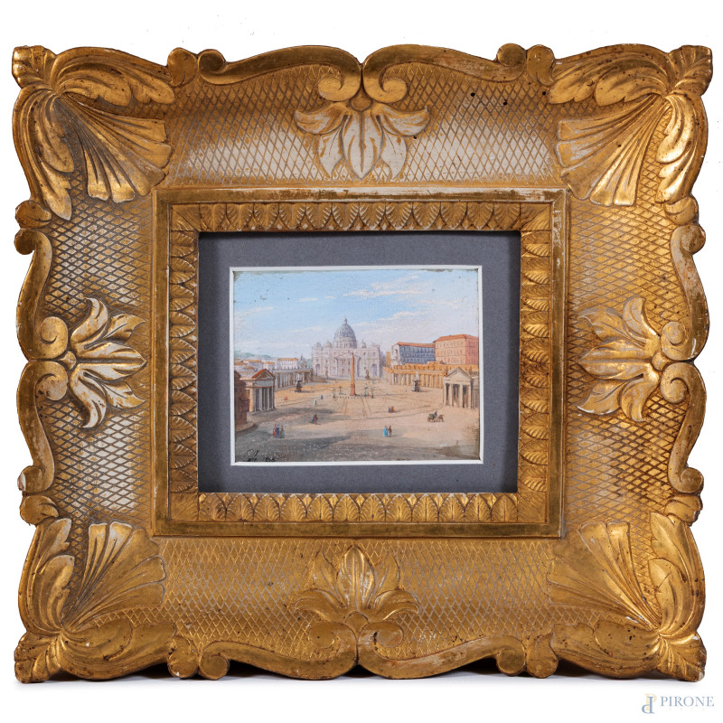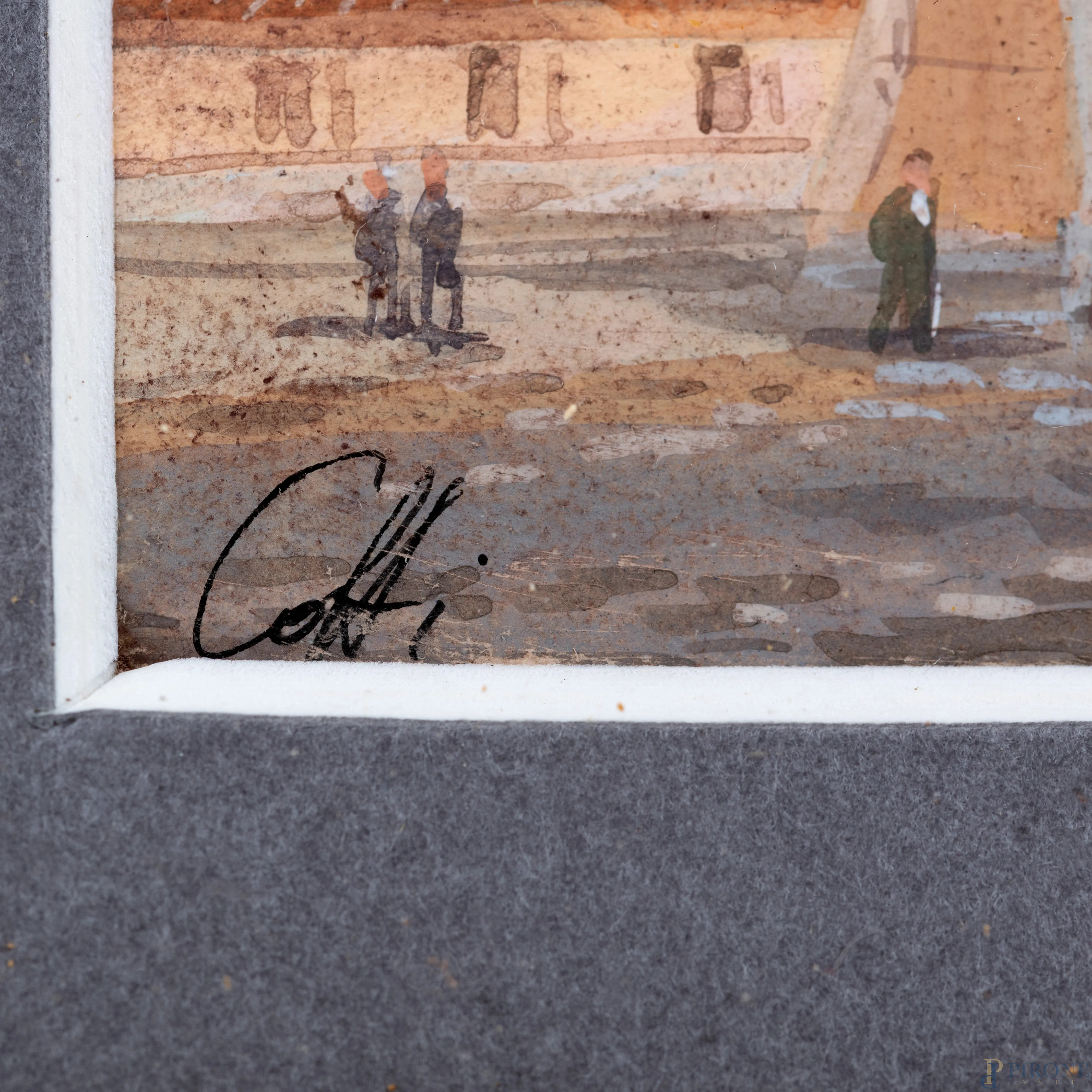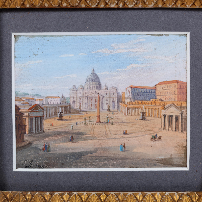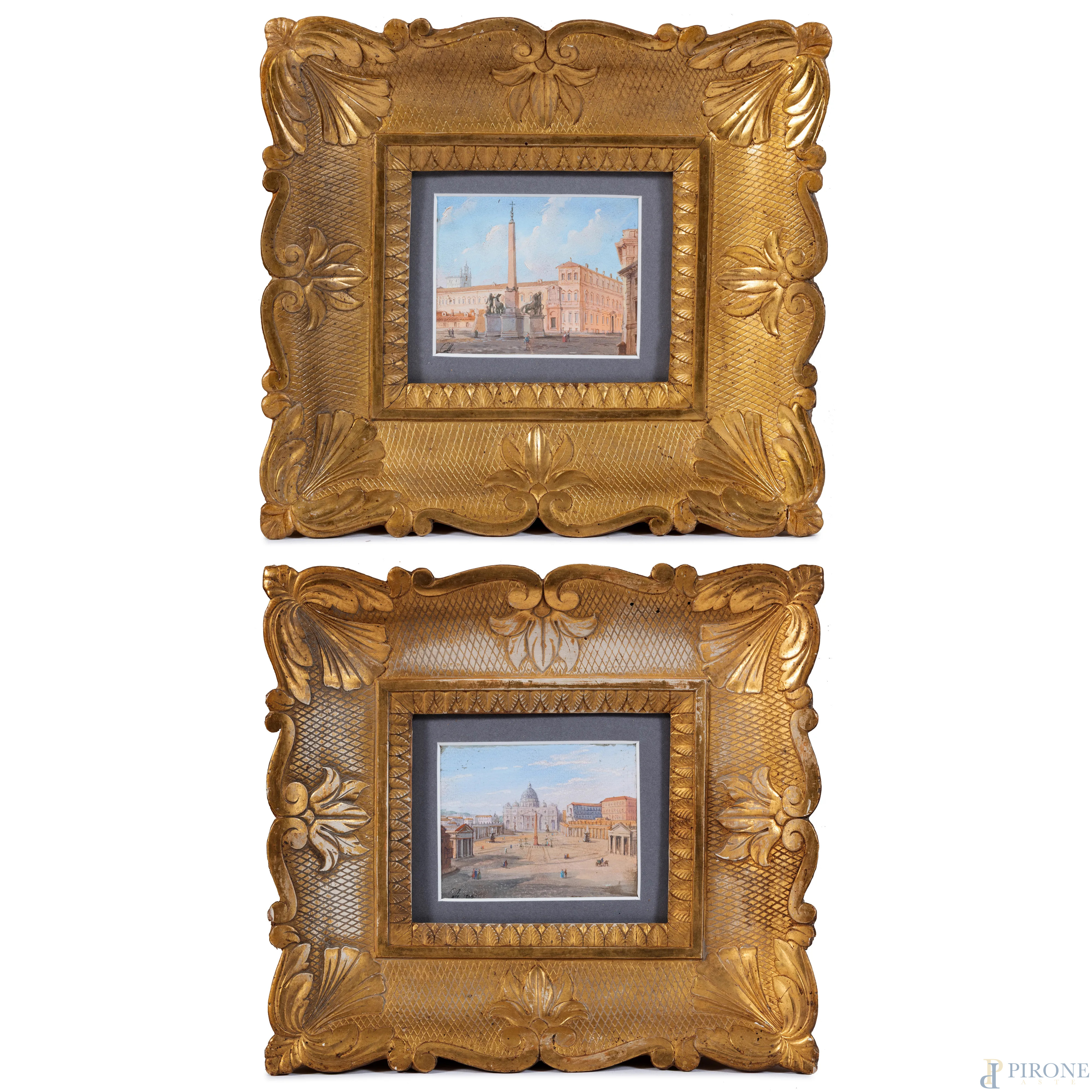 Coppia di vedute di Roma, tecnica mista su carta, cm 8x10, firmati in basso, entro cornice, (cadute di colore, tracce di umidità, segni di usura)
