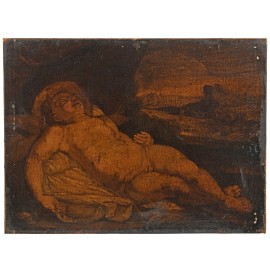 Cristo bambino dormiente, XVII-XVIII secolo, olio su tela, cm 57x67,5, (segni di usura, abrasioni, cadute di colore, lacerazioni)