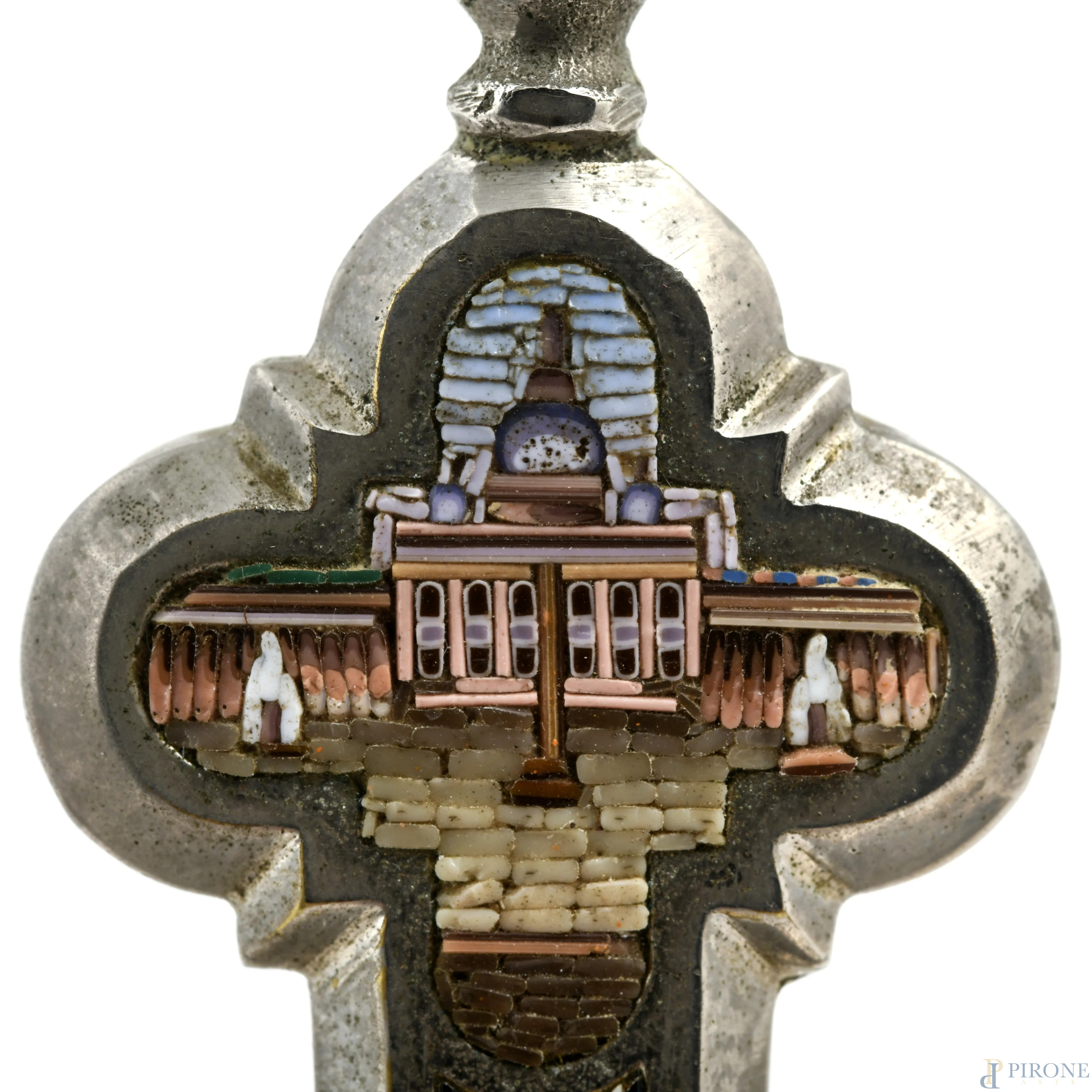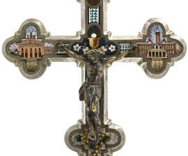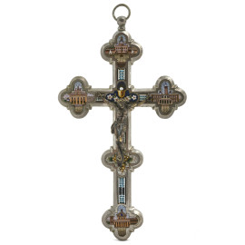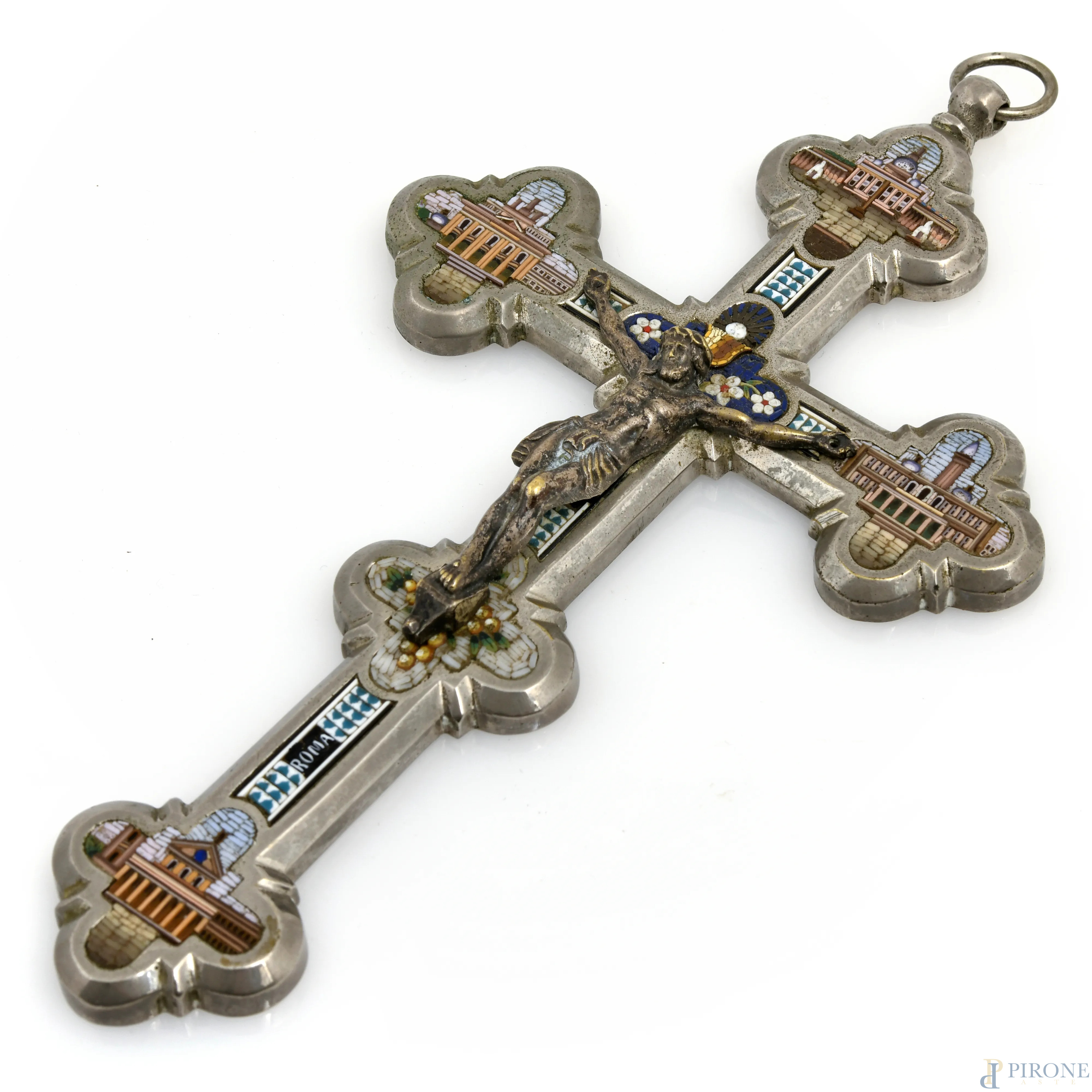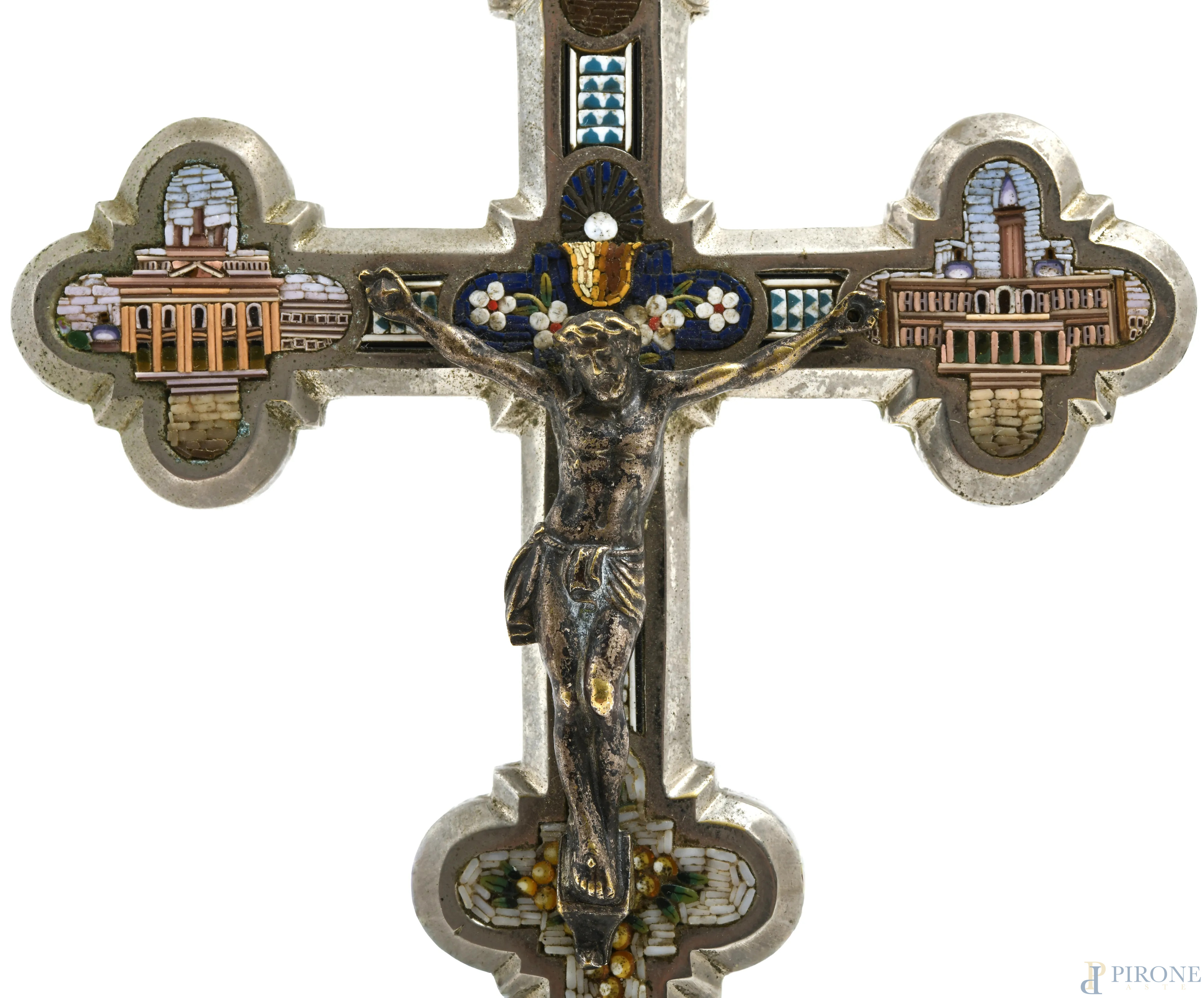Crocifisso con croce in metallo argentato e micromosaici e Cristo in argento, XX secolo, cm 18x10, (lievis egni di usura del tempo)