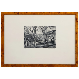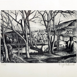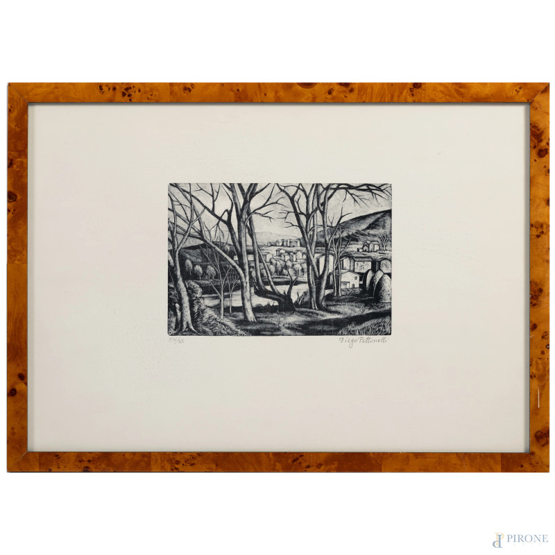 Diego Pettinelli (1897-1989), Case nella valle, xilografia, es. XIV/XX, cm foglio cm 40x50, firmata in basso a destra, entro cornice