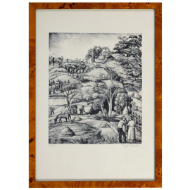 Diego Pettinelli (1897-1989), Contadini, xilografia, es. XIV/XX, foglio cm 50x40, firmata in basso a destra, entro cornice