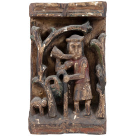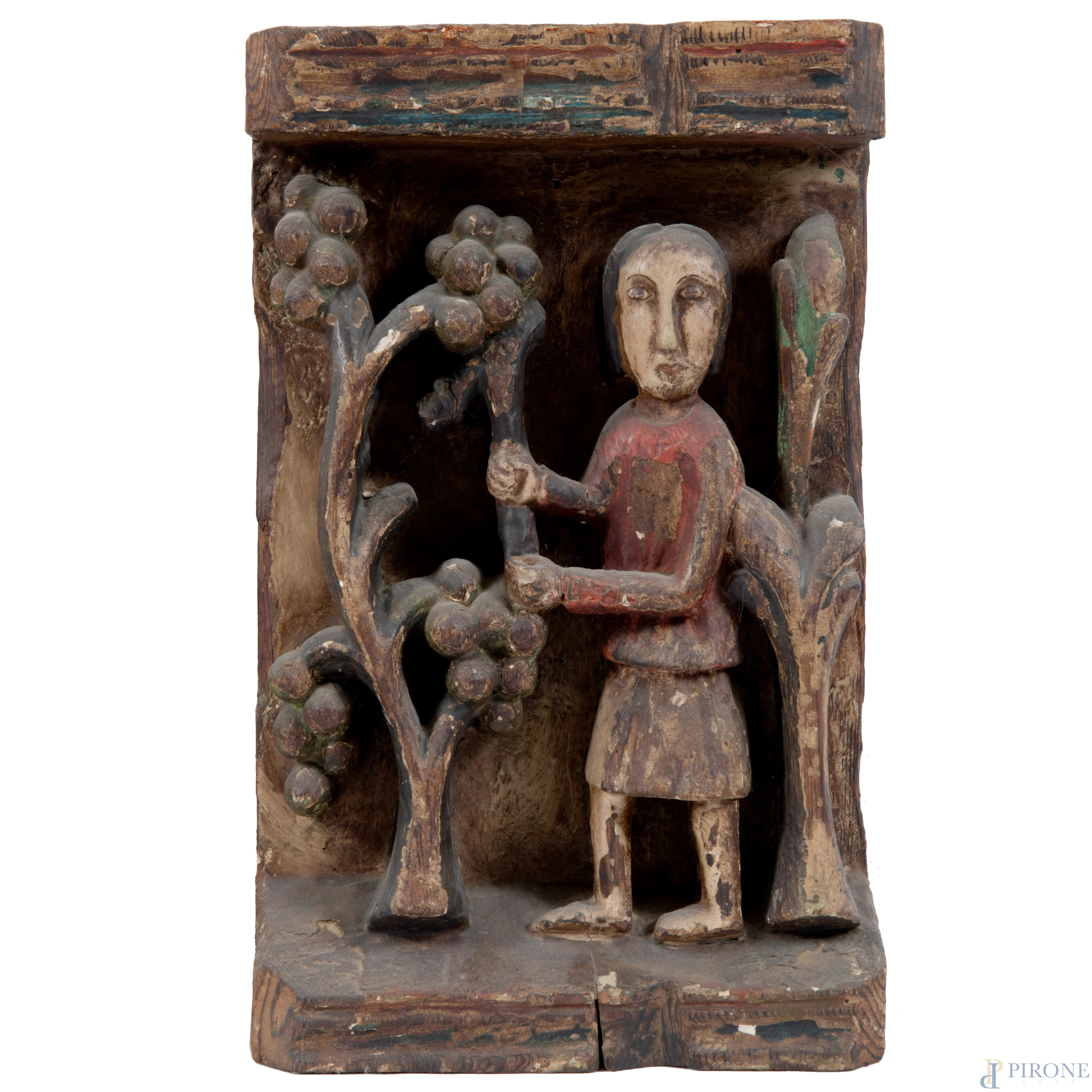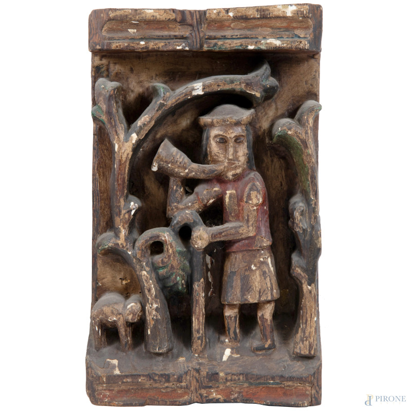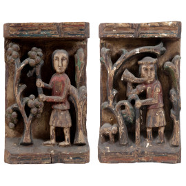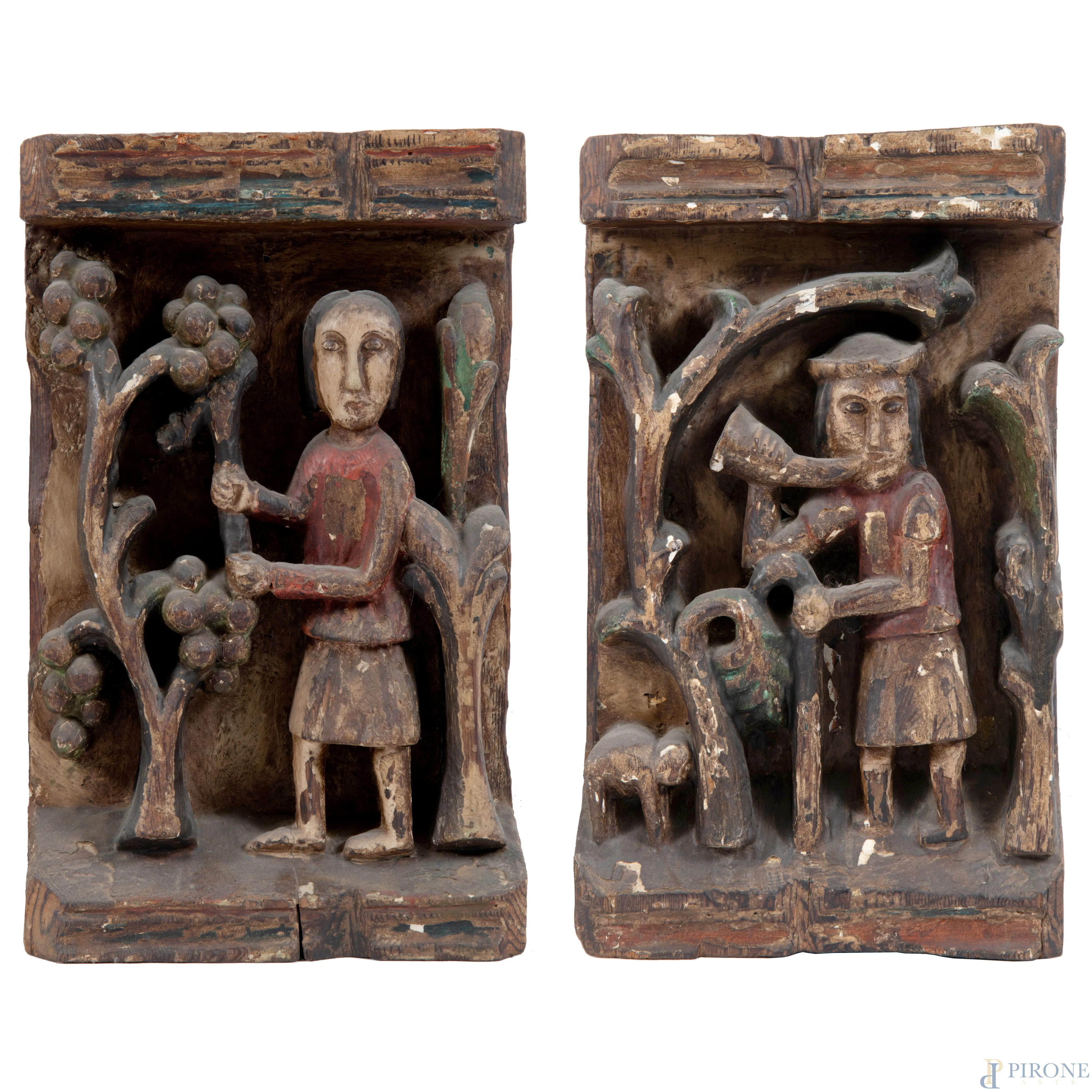 Due pannelli in legno intagliati e dipinti in policromia con figure al lavoro, XX secolo, cm 37x22x6,5, (scalfiture, mancanze, difetti, segni di usura)