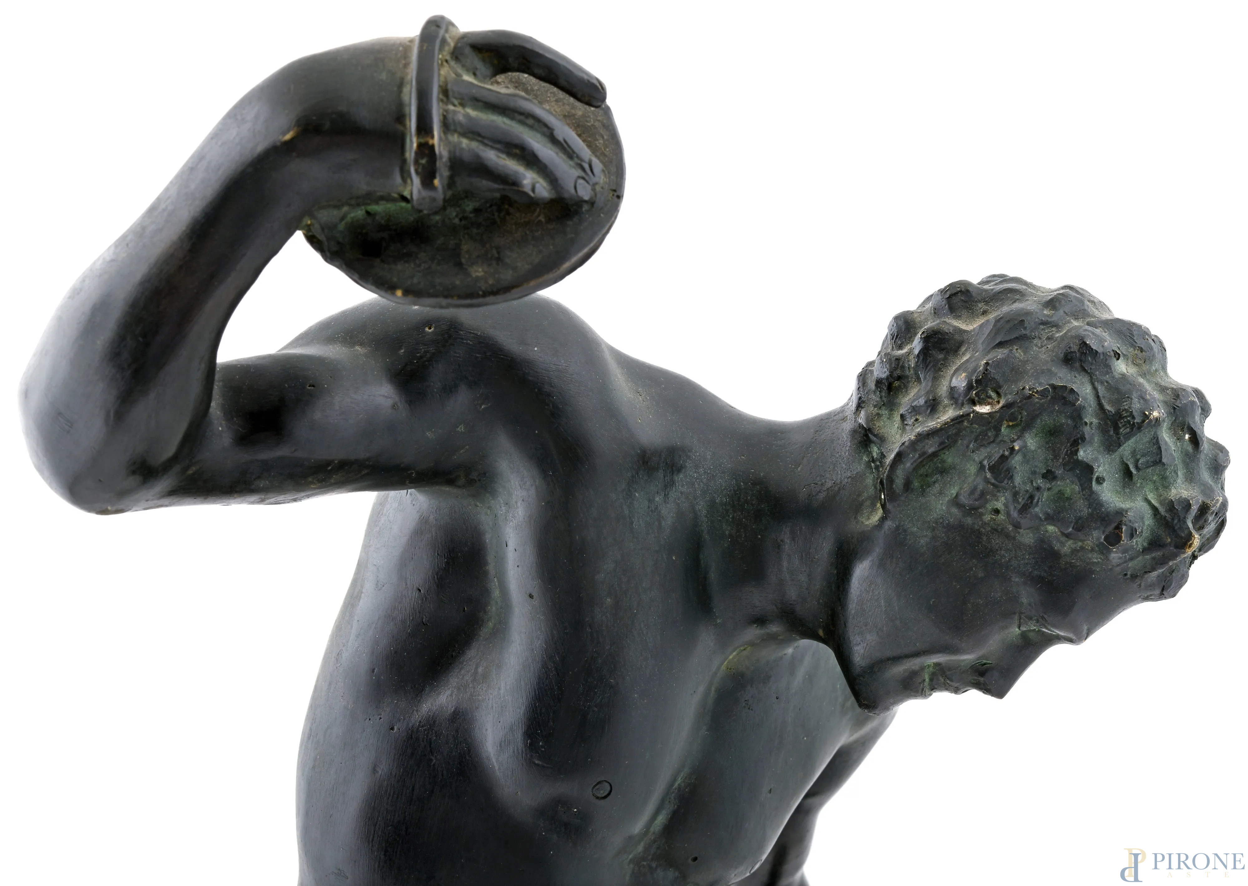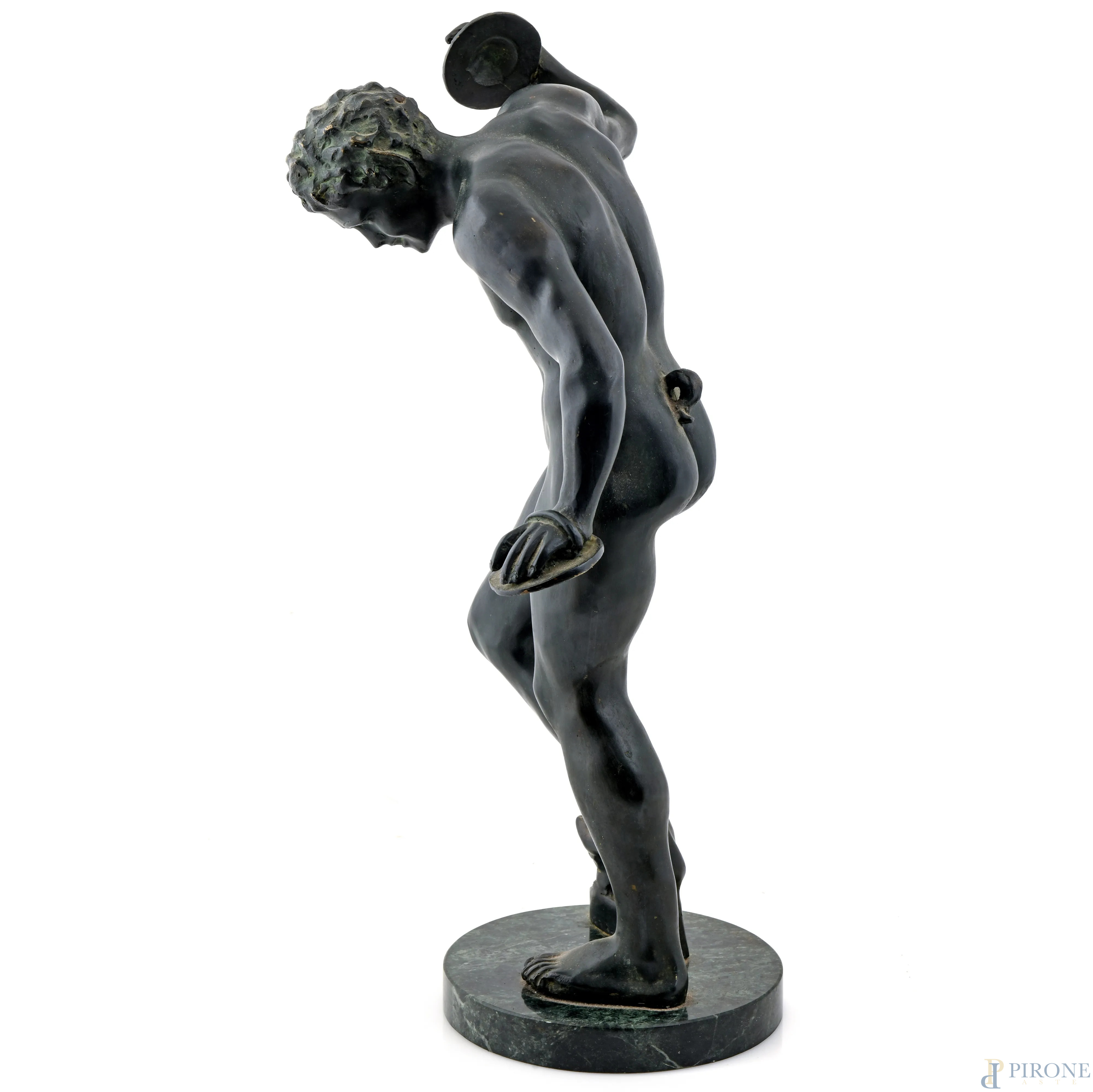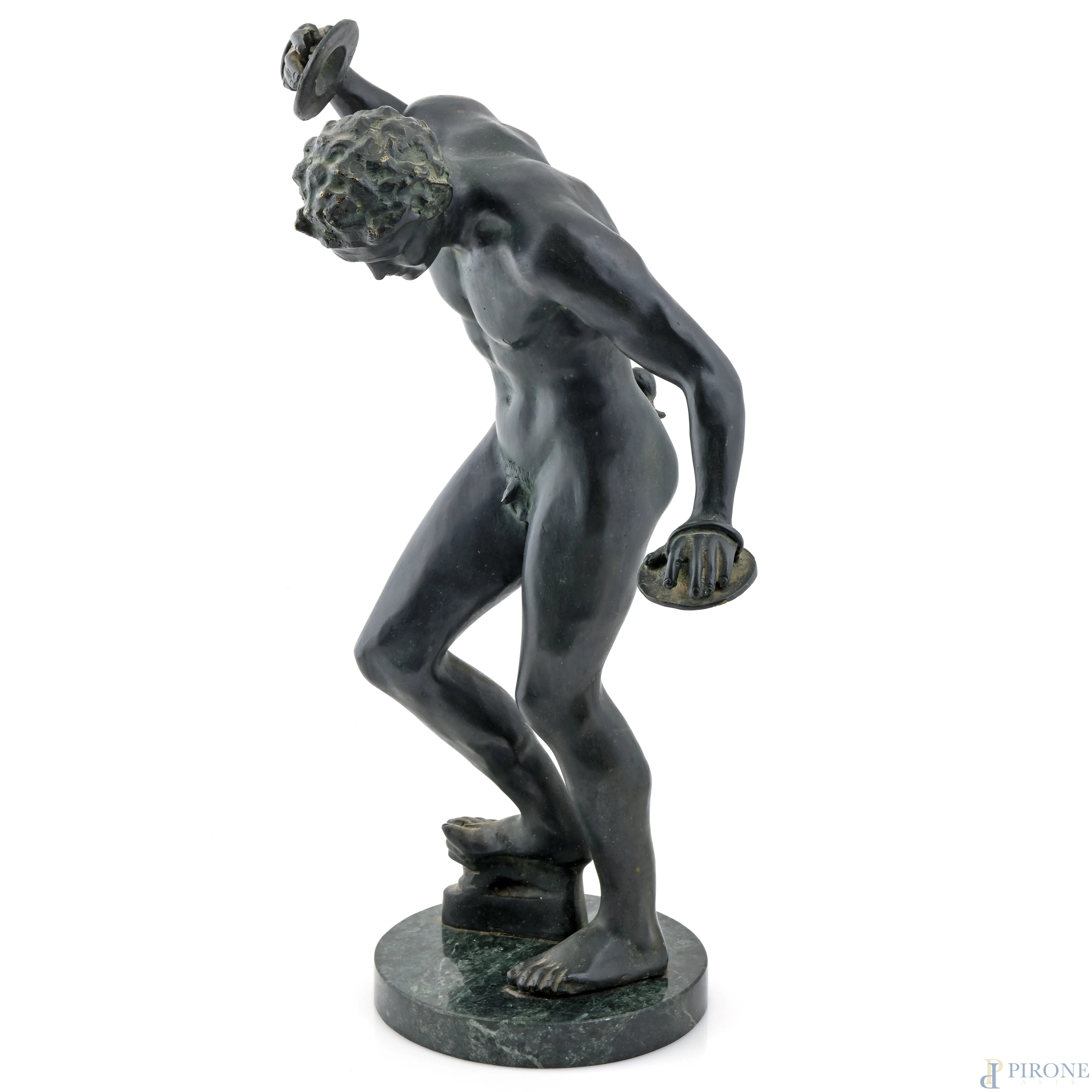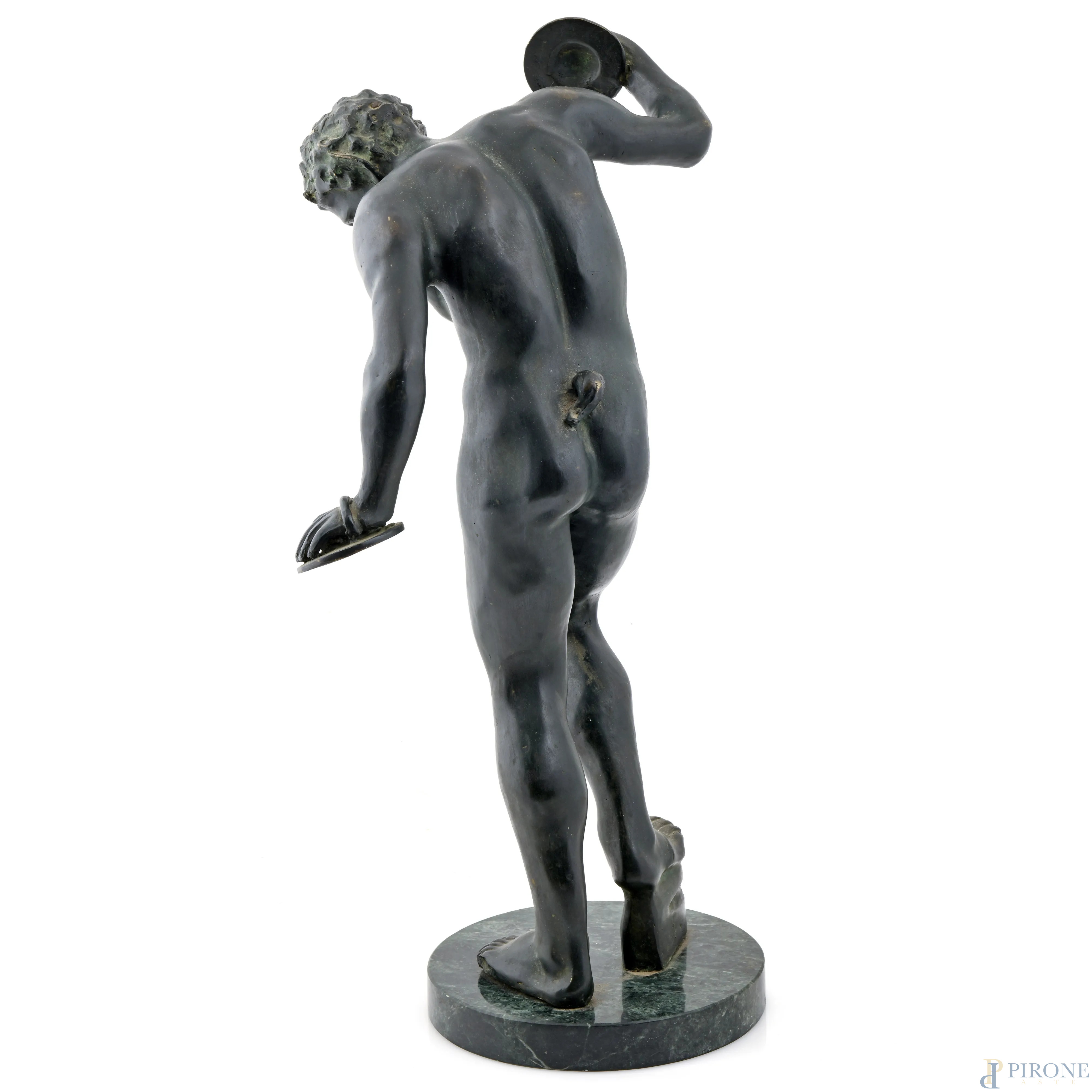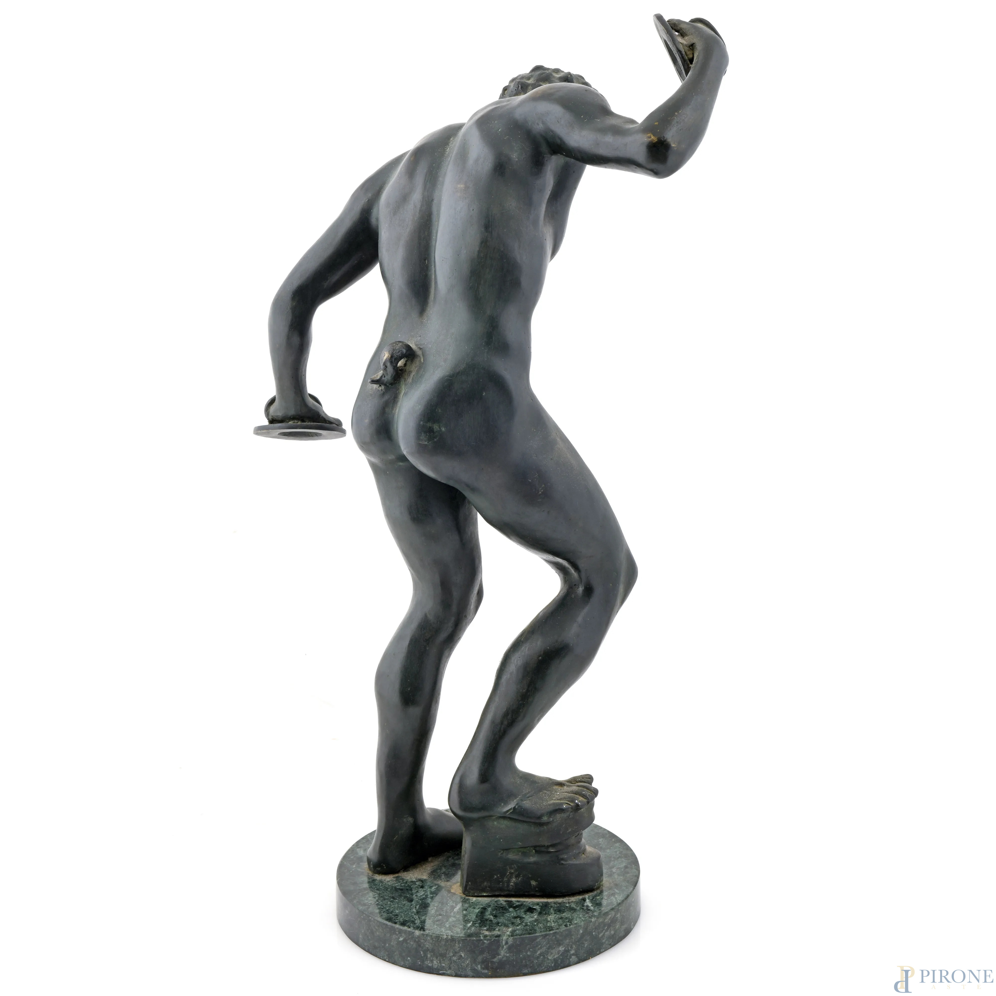 Fauno con piatti, XX secolo, scultura in bronzo su base in marmo, altezza cm 60,5