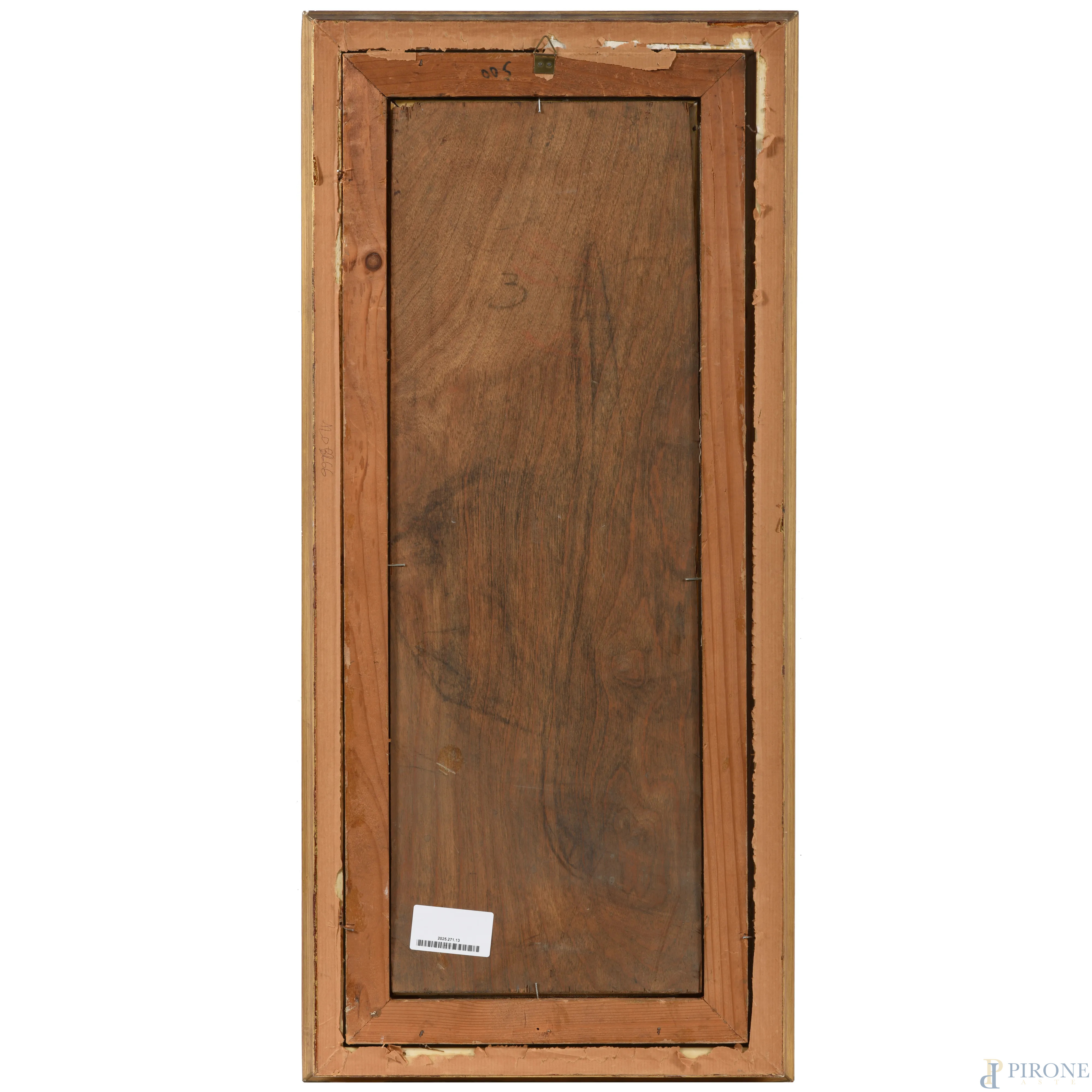 Figura femminile in rosso, XX secolo, olio su tavoletta, cm 63,5x21, entro cornice, (fessurazioni della tavola)