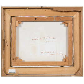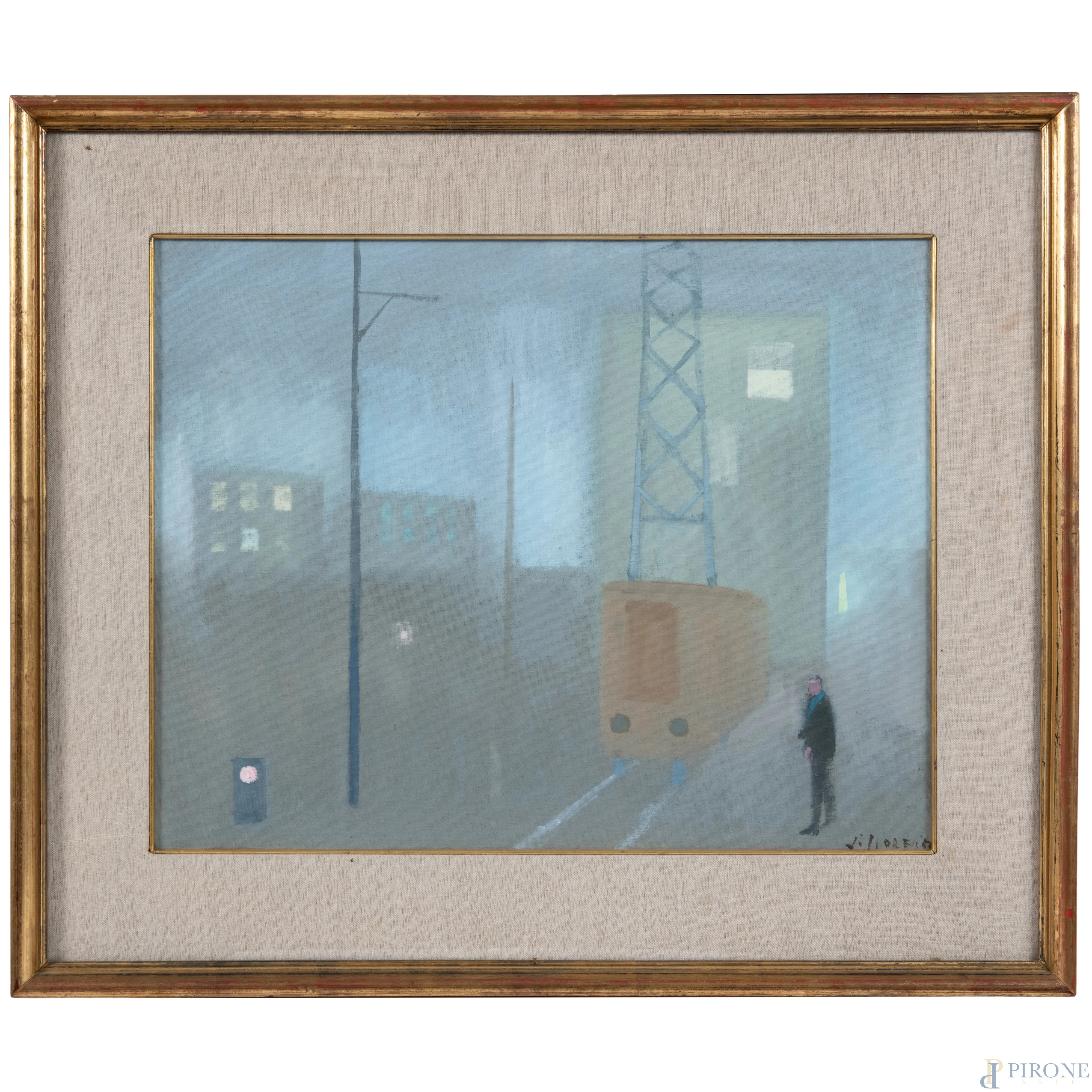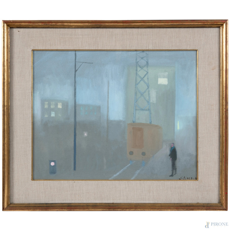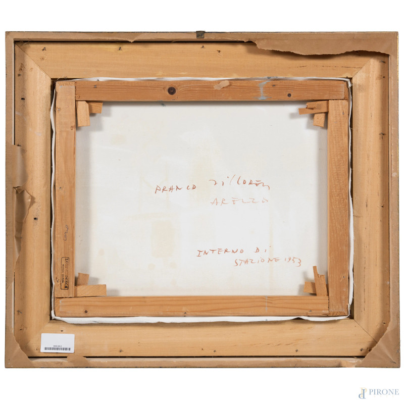 Franco Villoresi (1920-1975), Interno di stazione, olio su tela, cm 40x50, firmato in basso a destra, firmato, titolato e datato "1953" al retro, entro cornice