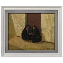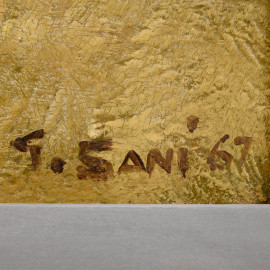 Giansebastiano Sani (1935-2014), Sull'uscio, olio su tavola, cm 38,5x49, firmato in basso a destra, entro cornice