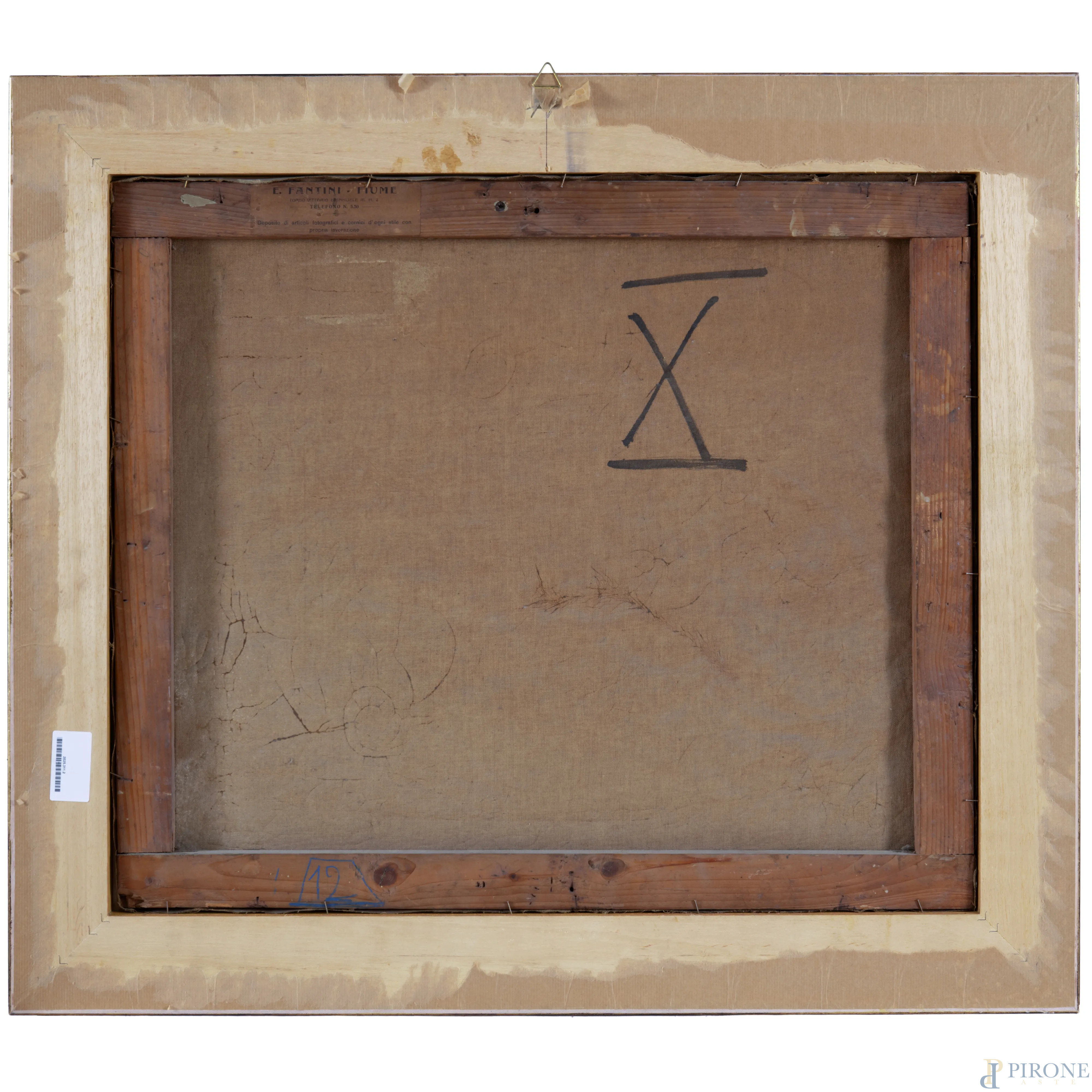 Gioco di ragazzi, XX secolo, olio su tela, cm 59x70, firmato in basso a destra, entro cornice, craquelure, sollevamenti e cadute di colore)