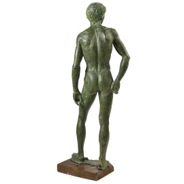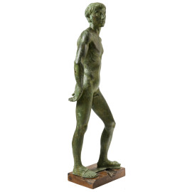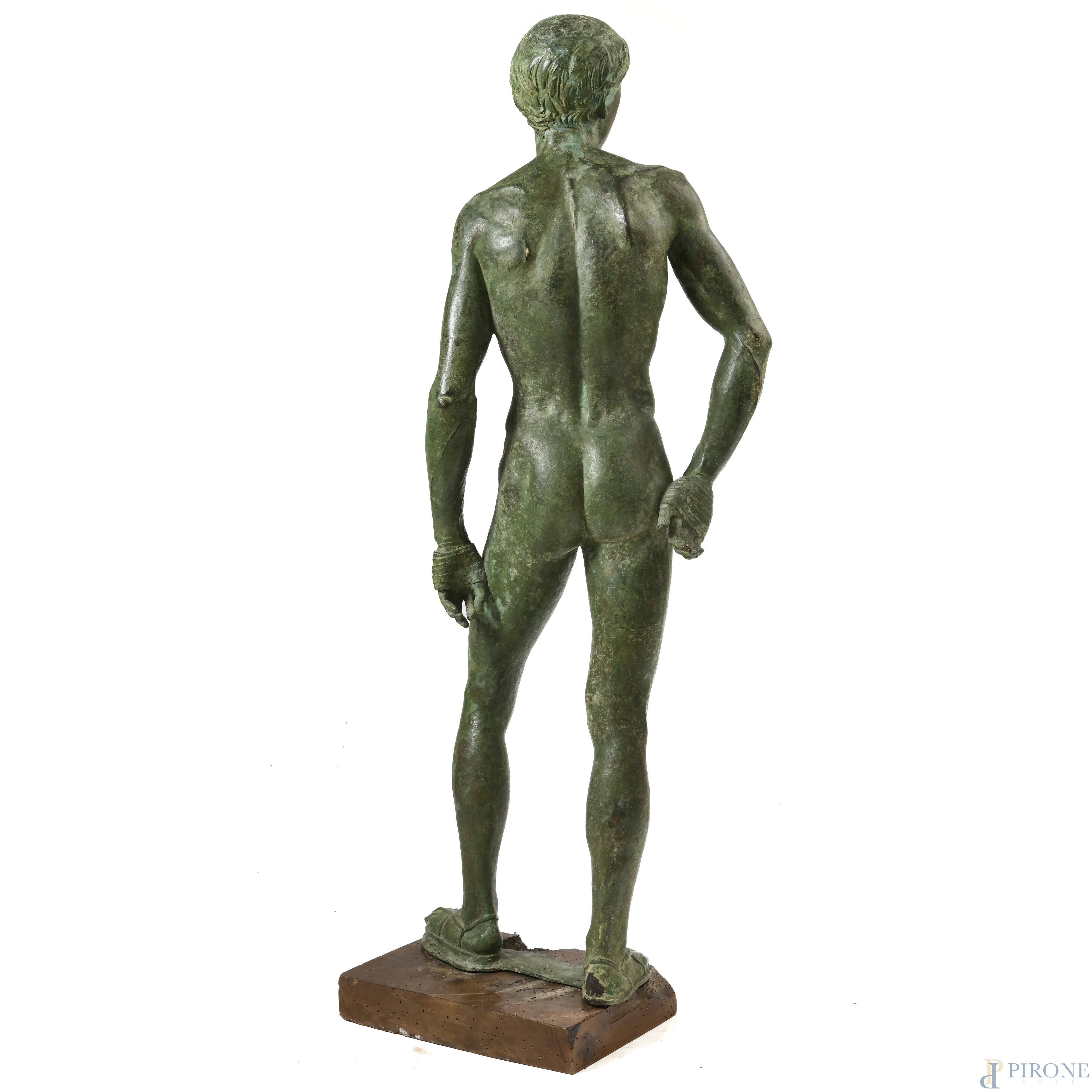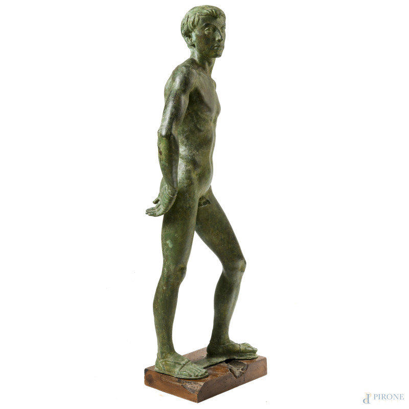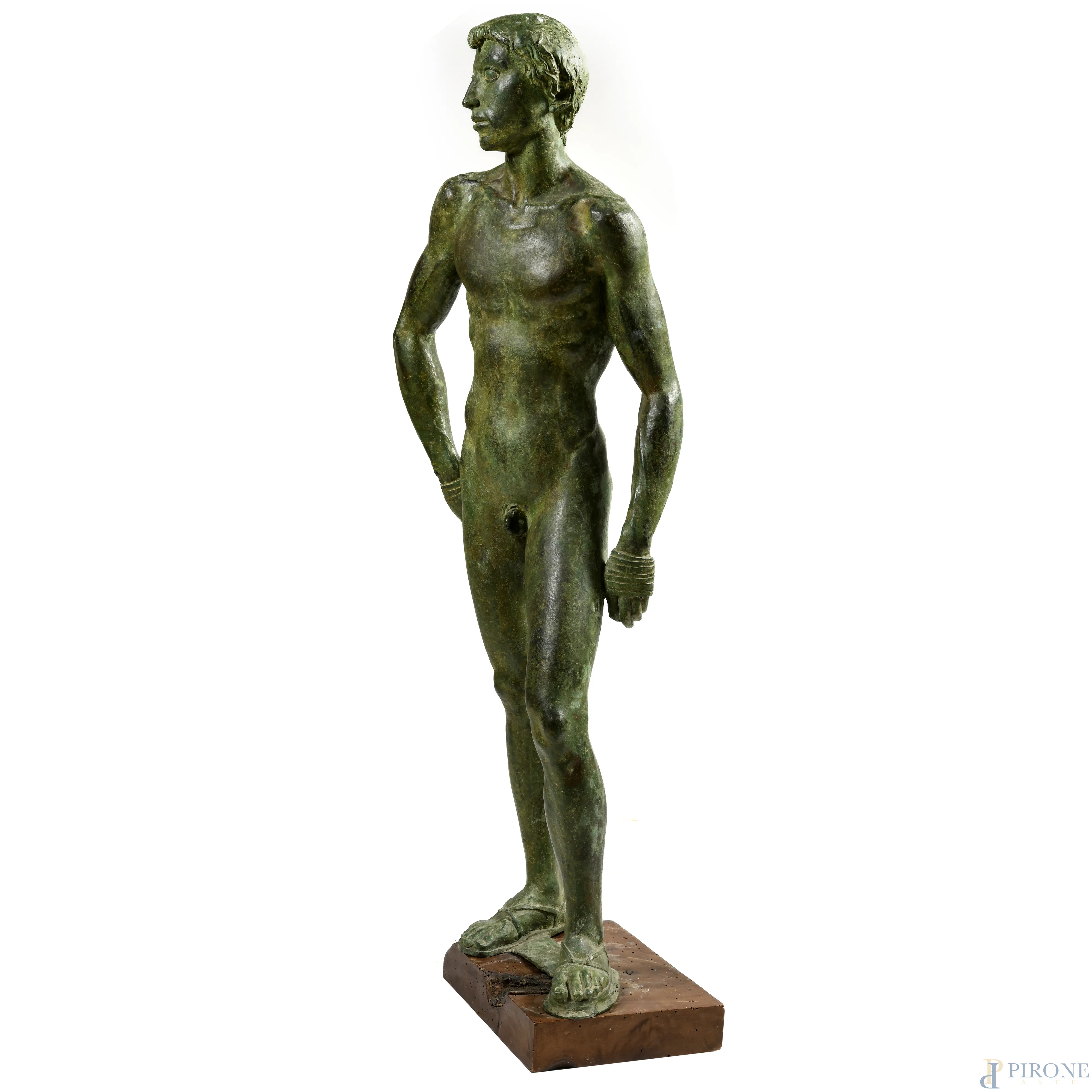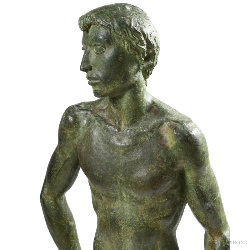 Giovane pugile, scultura in bronzo patinato su base in legno, xx secolo, altezza cm 110, monogramma e firma alla base, (segni di usura, difetti, fori di tarlo alla base)