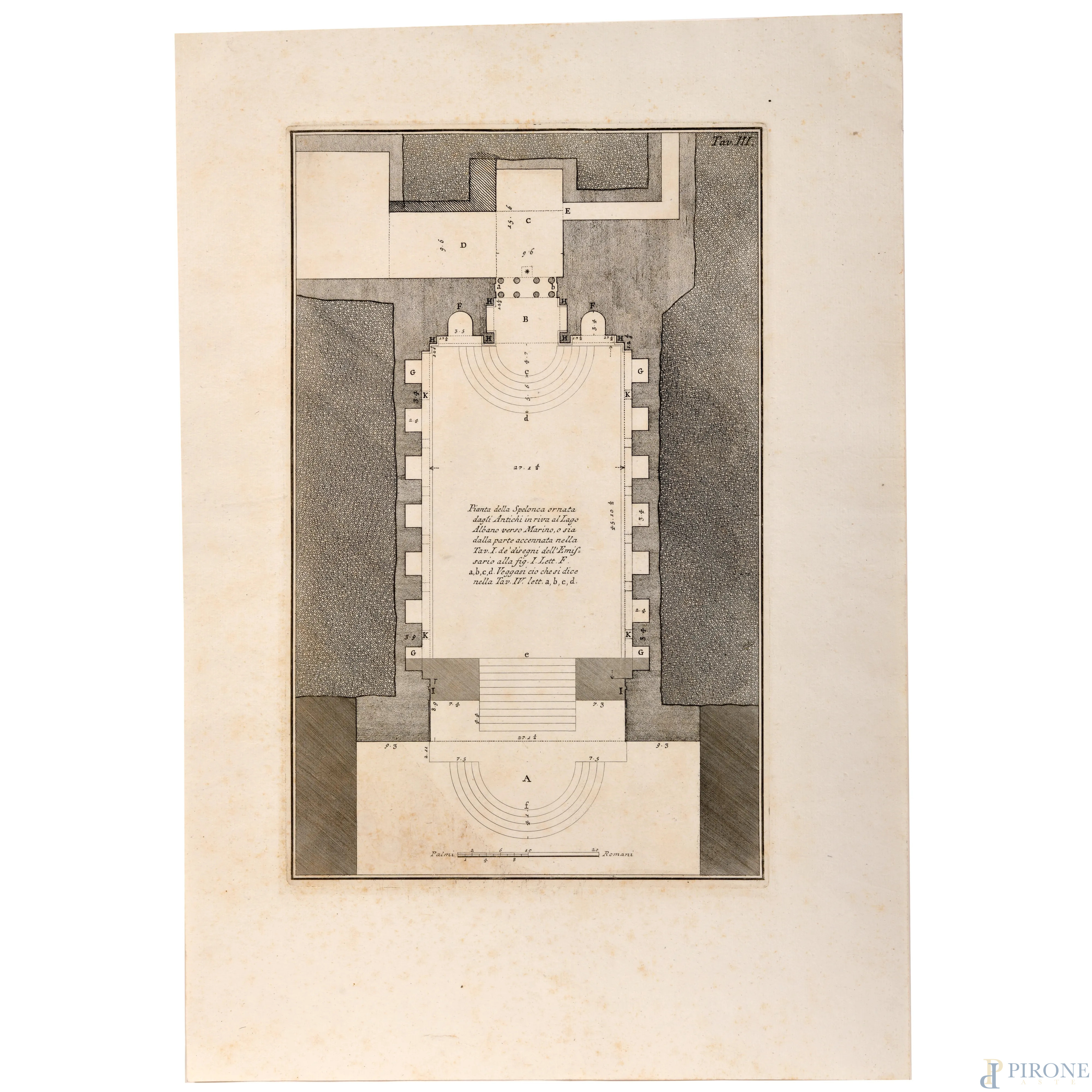 Giovanni Battista Piranesi (1720 – 1778) Incisione I stato, Pianta della Spelunca ornata dagli antichi in riva al lago di Albano, foglio cm 52,5x36, (segni di usura, tracce di umidità)
