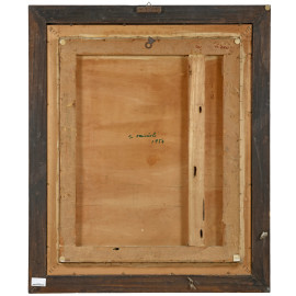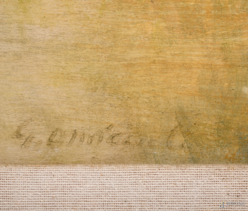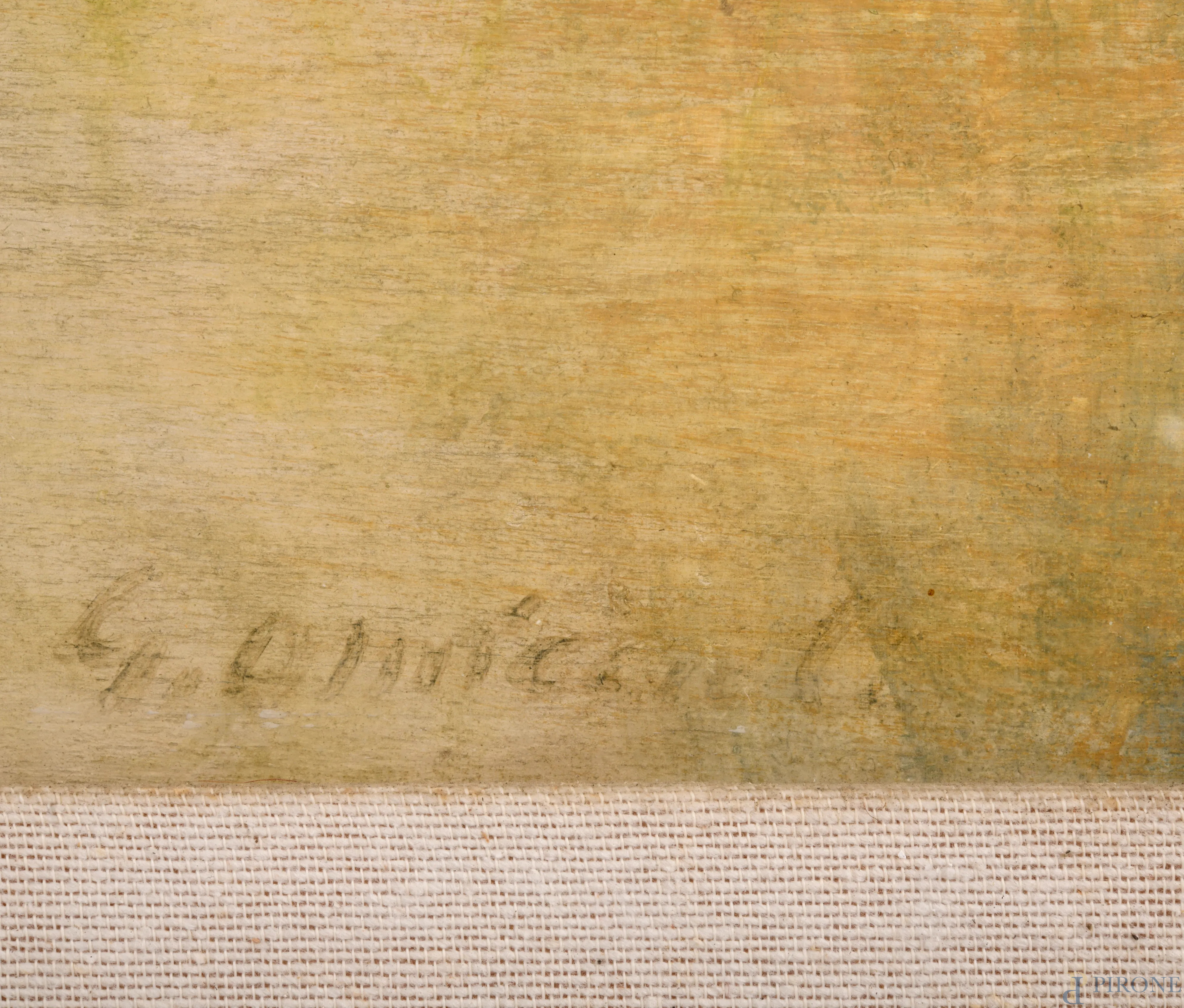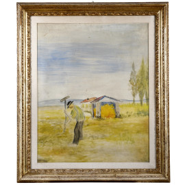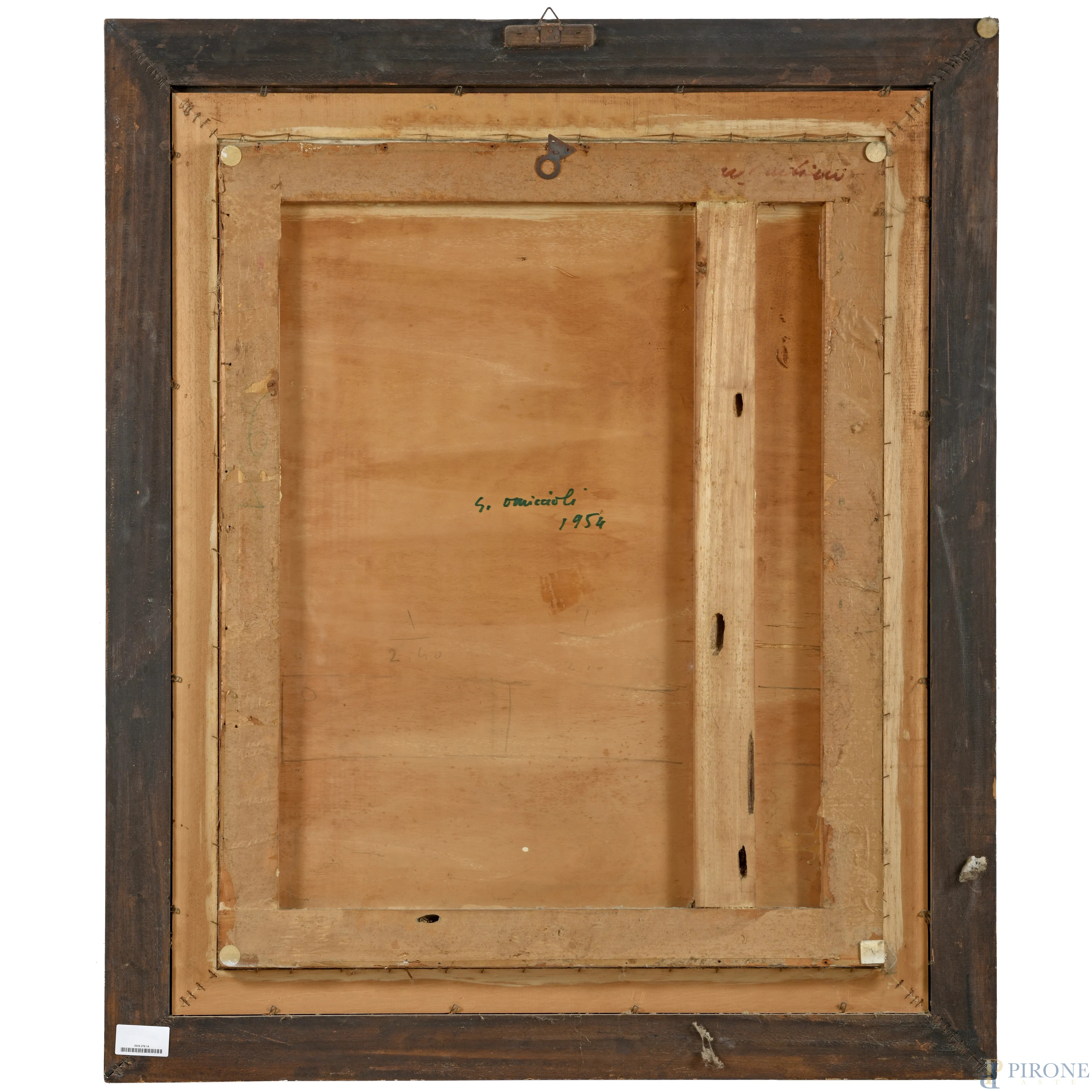 Giovanni Omiccioli (1901 - 1975), Contadino, tecnica mista su compensato, firmato in basso a destra, firmato e datato al retro "1954", cm 87,5x71, entro cornice