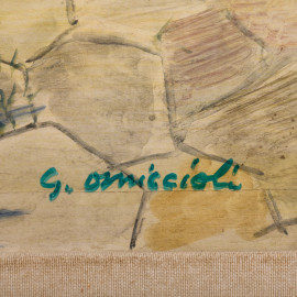 Giovanni Omiccioli (1901 - 1975), Le cucitrici , tecnica mista su compensato, firmato in basso a destra, firmato e datato al retro "1954", cm 87,5x107,5, entro cornice