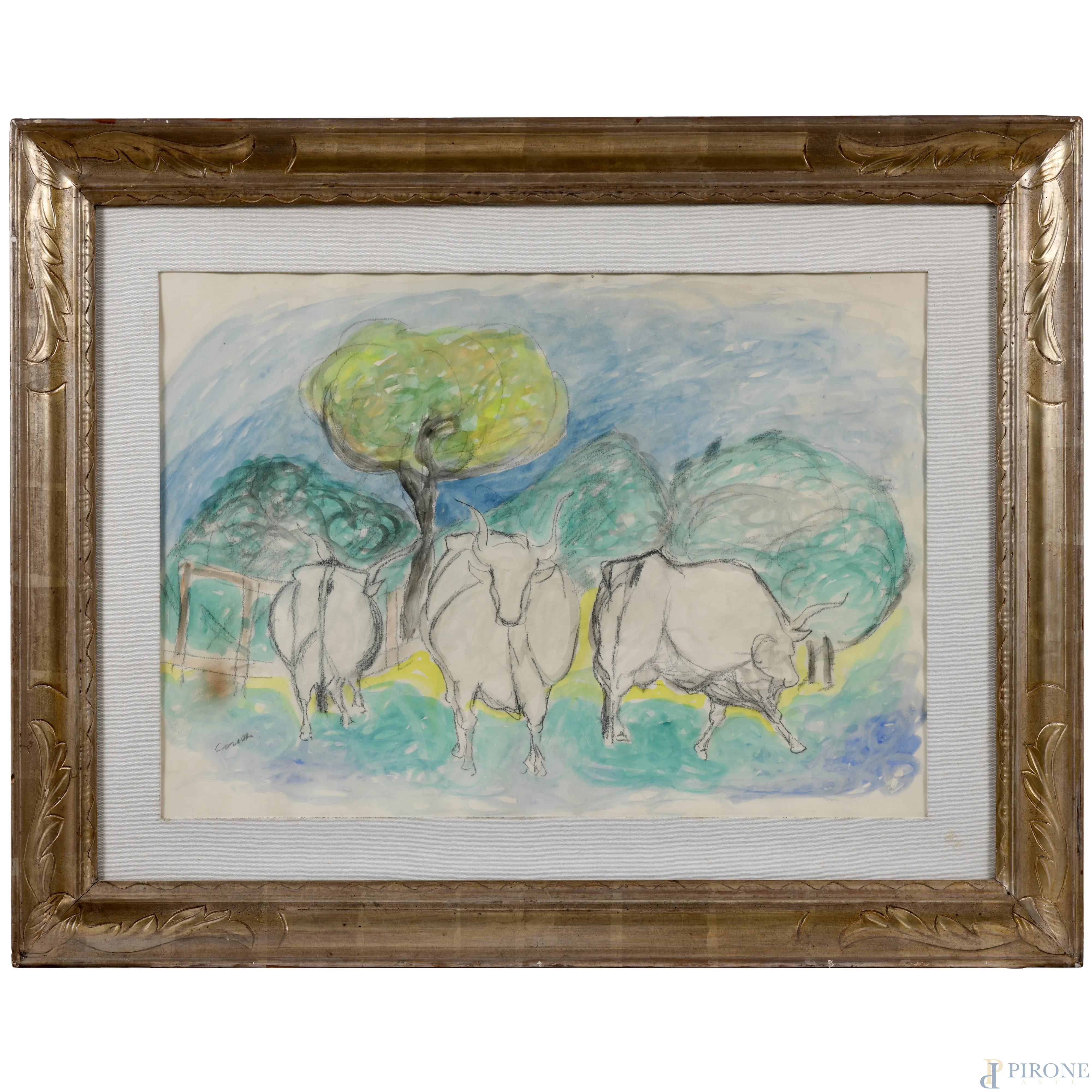 Giuseppe Cesetti (1902-1990), Mucche, tecnica mista su carta, cm 59x79, compreso passepartout, firmato in basso a sinistra, entro cornice(umidità, ondulazioni della carta)