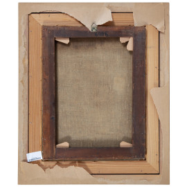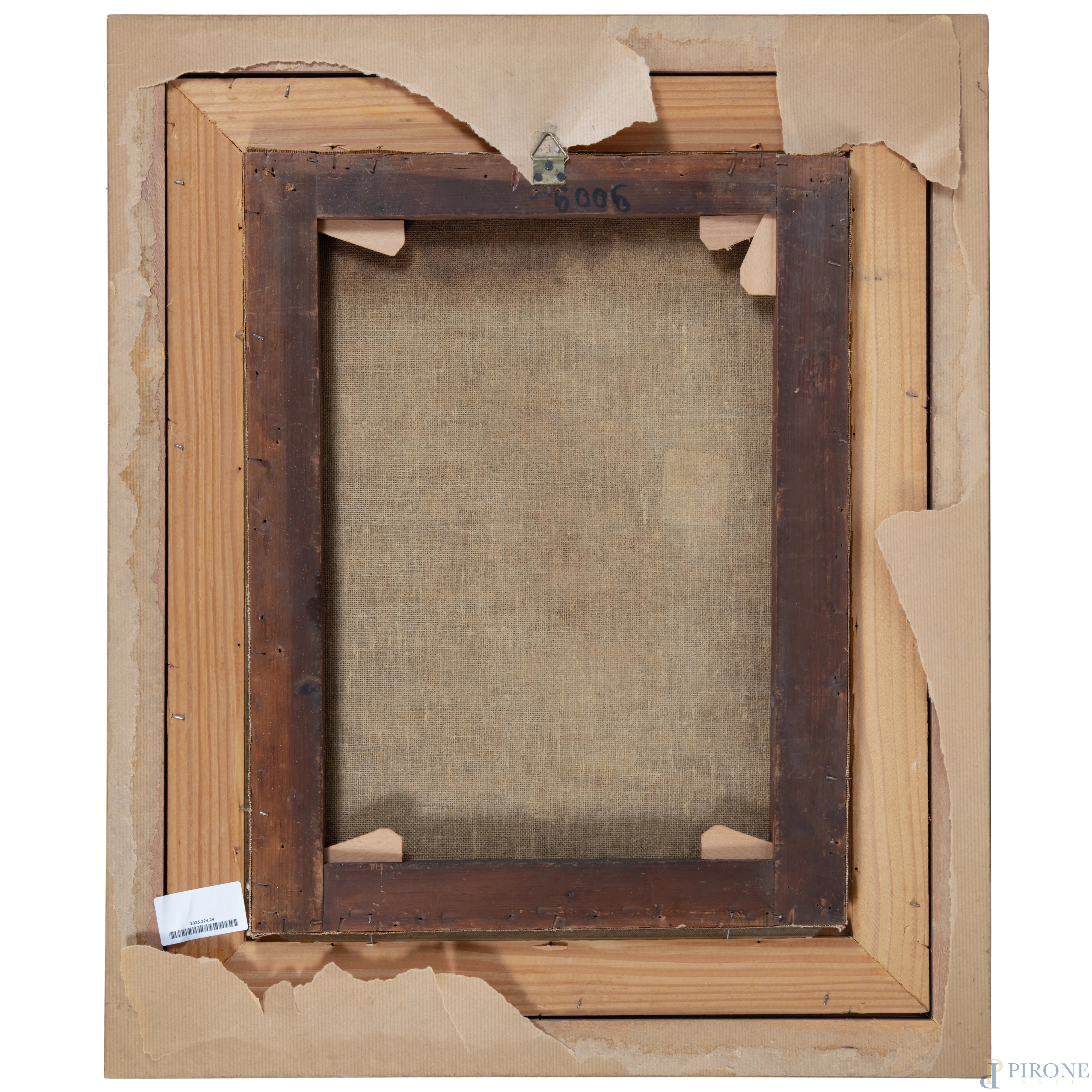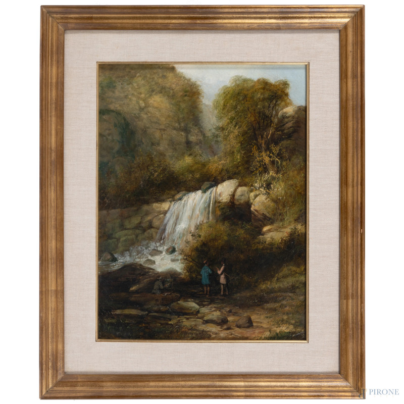 Gli artisti alla cascata, XIX secolo, olio su tela, cm 51x39,5, siglato in basso a sinistra, entro cornice (craquelure)