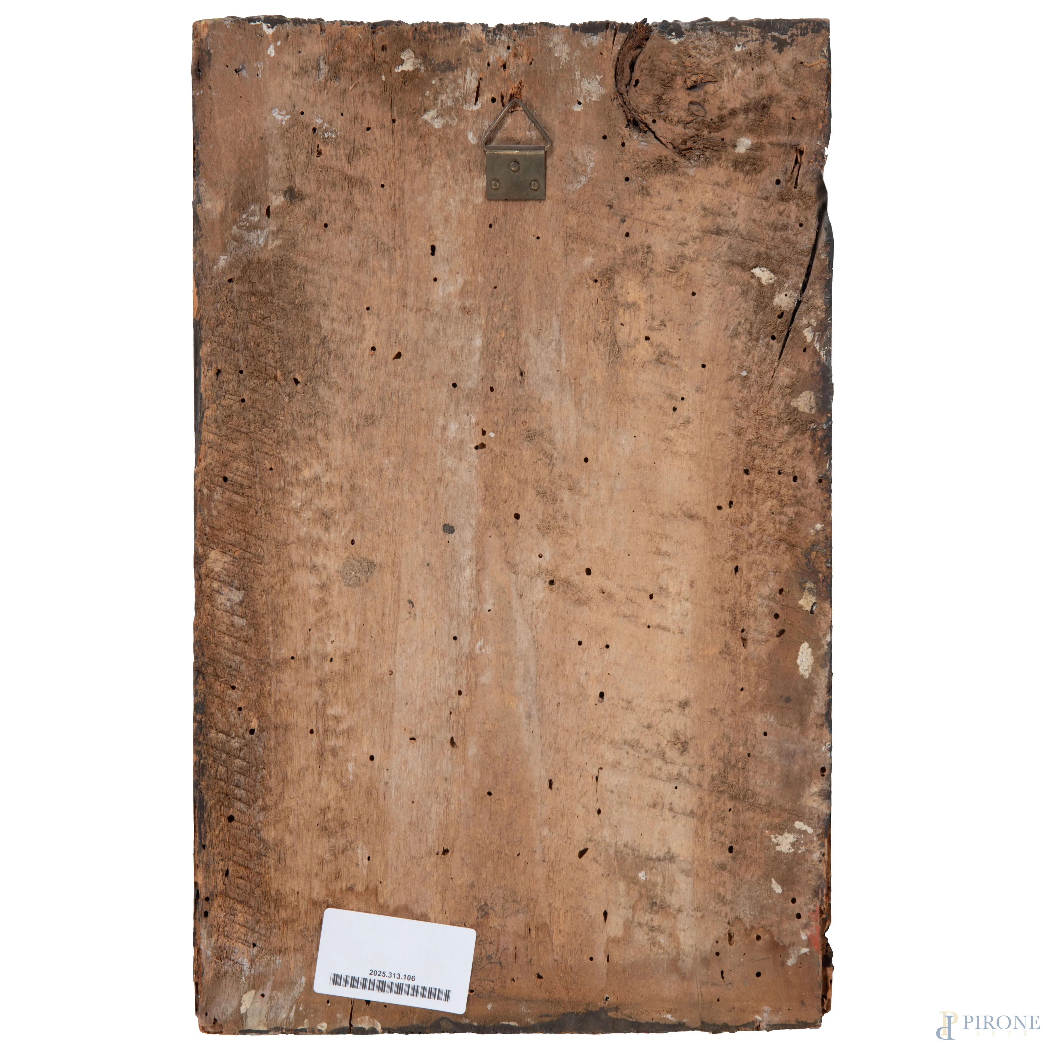 Icona raffigurante Madonna con Bambino, XIX secolo, tempera su tavola, cm 38,5x24, (cadute di colore, scalfiture, graffi, fori di tarlo)