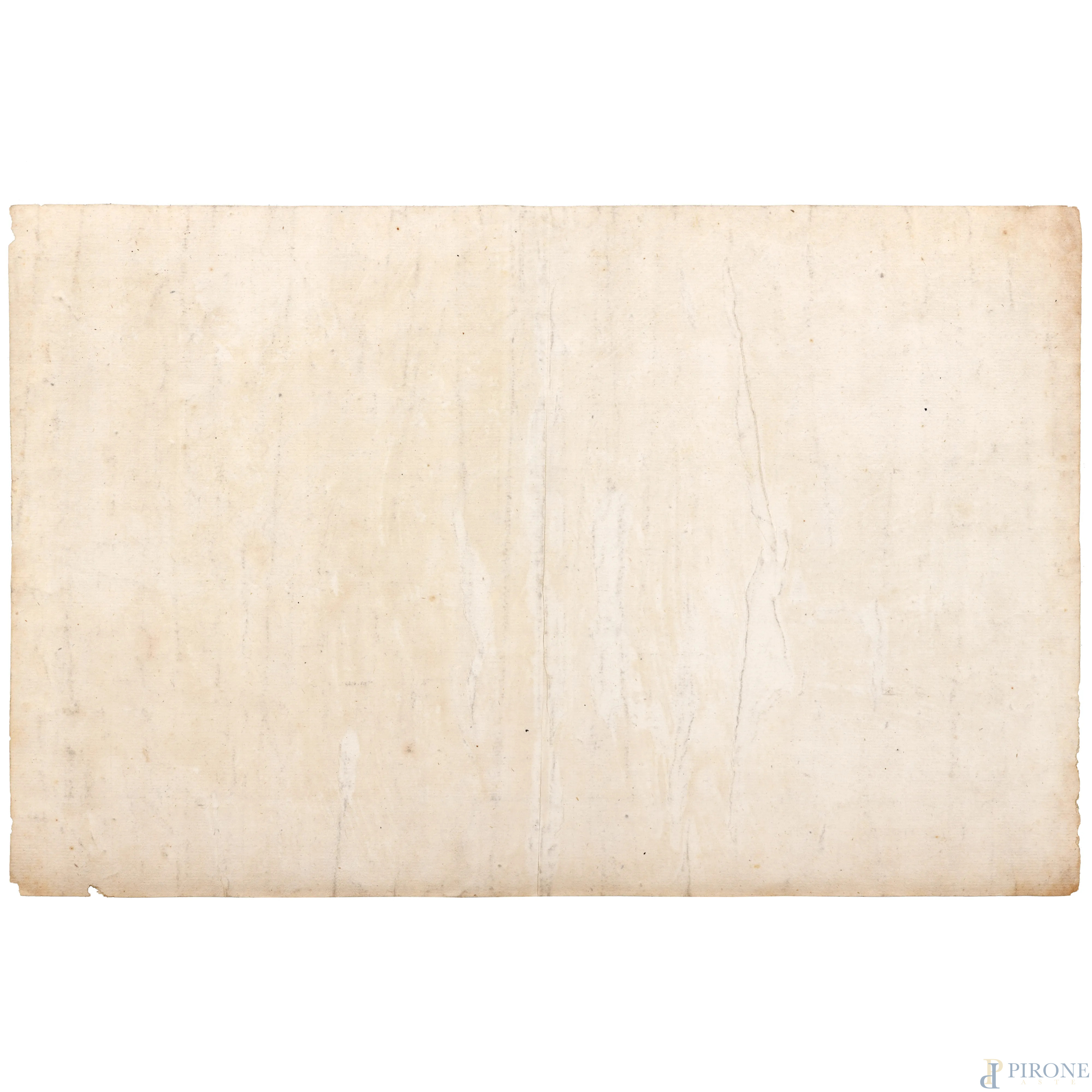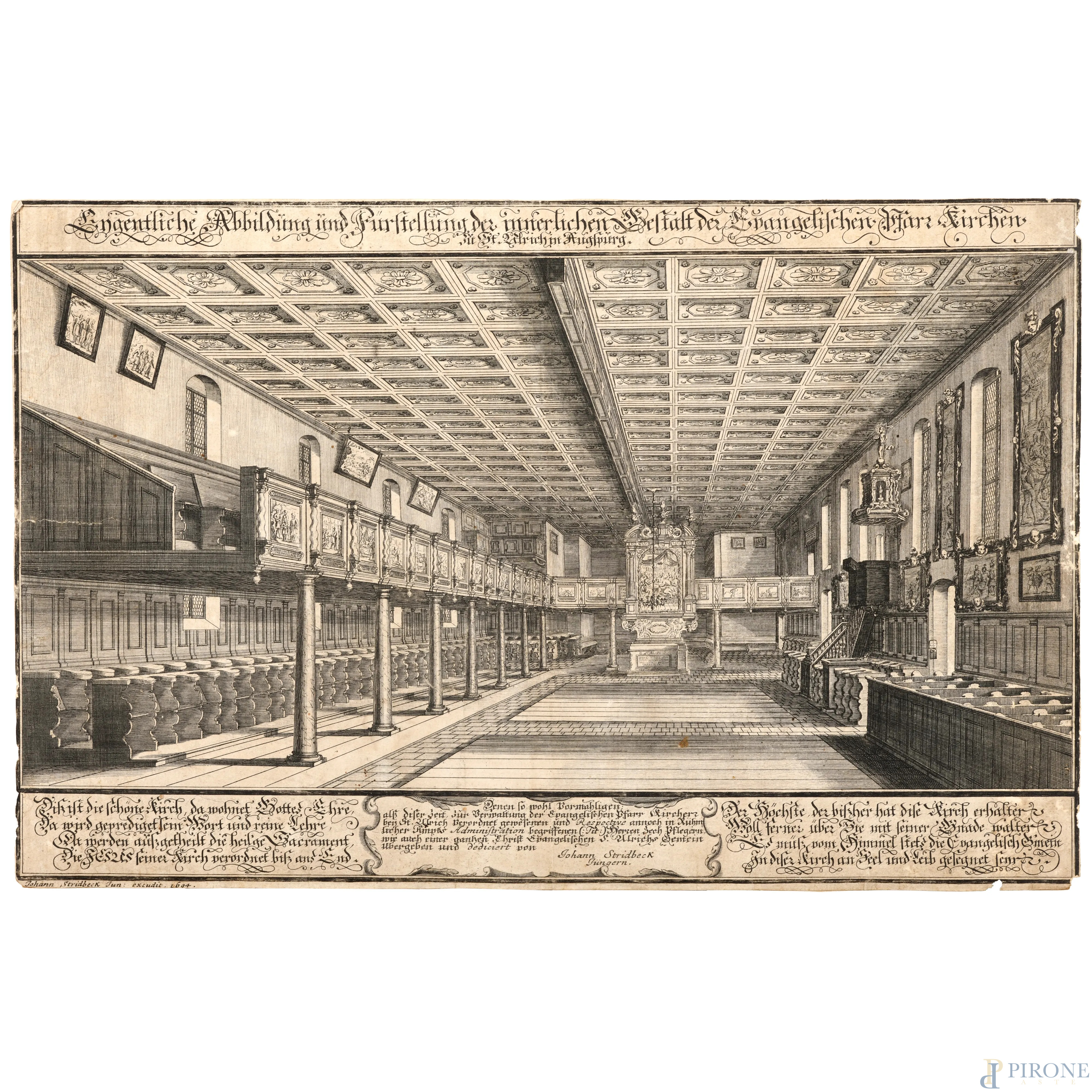 Incisione raffigurante interno di chiesa, cm 25x38,5, iscritto in basso "Johann Stridbeck excudit 1694" (piegature, strappi, difetti)