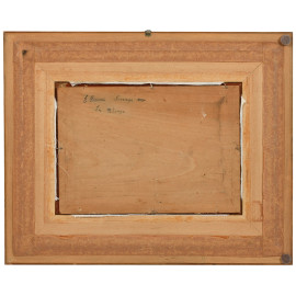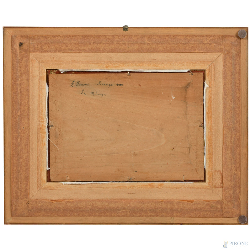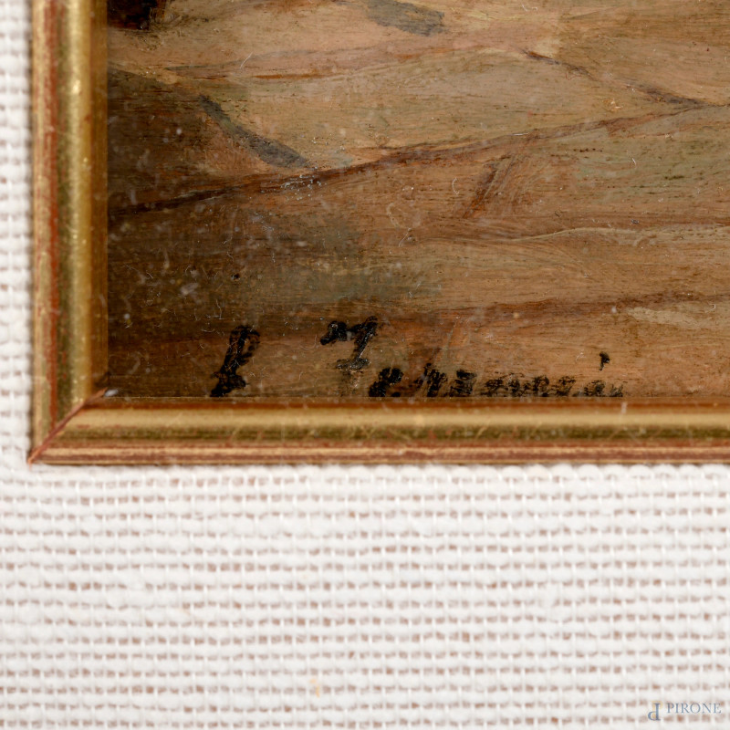 Interno di camera da letto, XX secolo, olio su compensato, cm 19x27, firmato in basso a sinistra, entro cornice