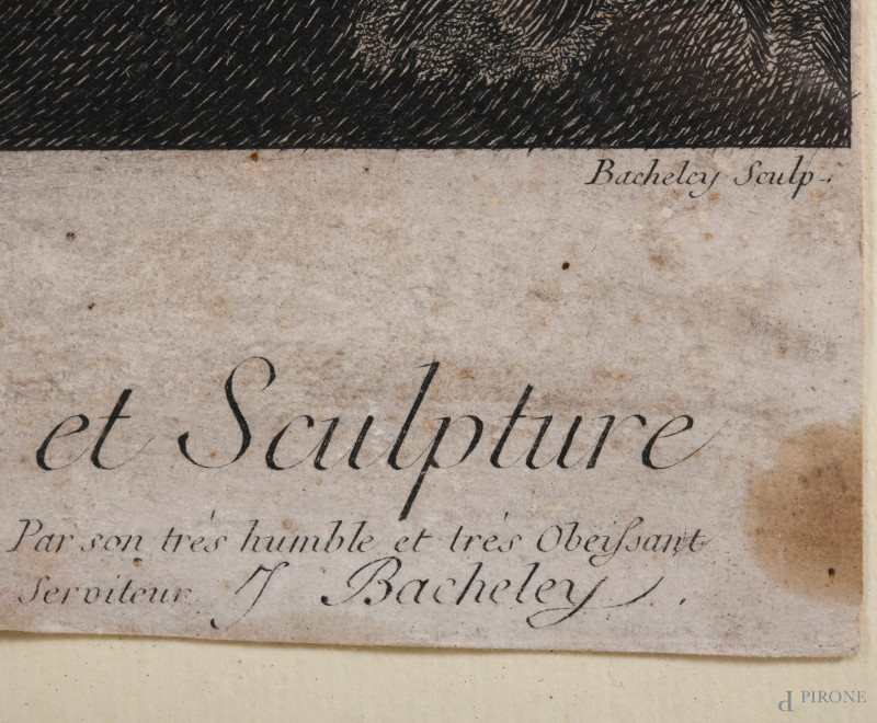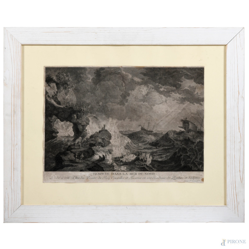 Jacques Bacheley (1712-1781), "Tempete dans la Mer du Nord" da Horace Vernet, acquaforte, foglio cm 38,5x52, entro cornice, (segni di usura, tracce di umidità, segni di piegatura della carta e piccoli fori)