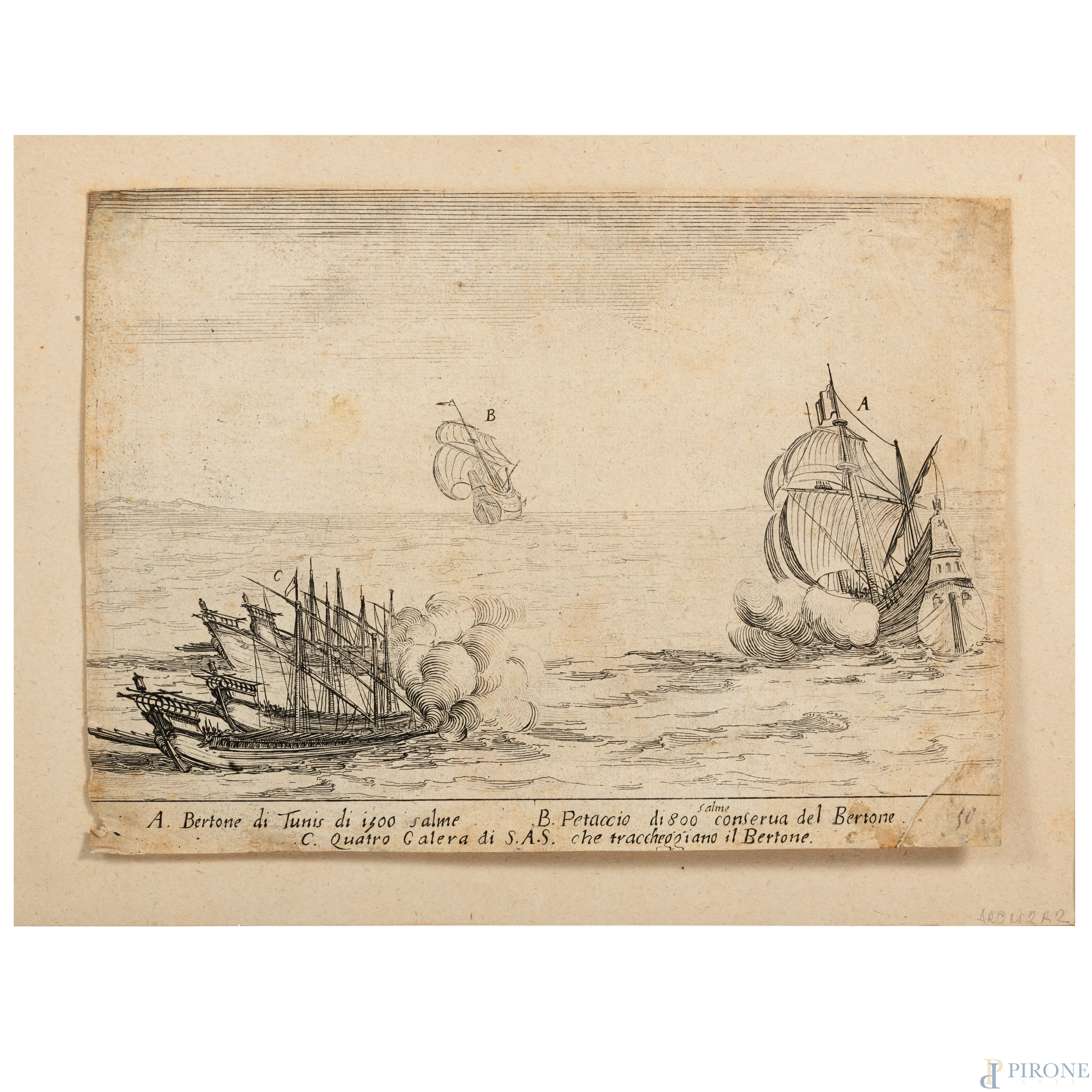 Jacques Callot (1592-1635) A. Bertone di Tunis, Acquaforte, foglio cm 14x19,5, iscizione al retro, (segni di usura, foxing, strappi)