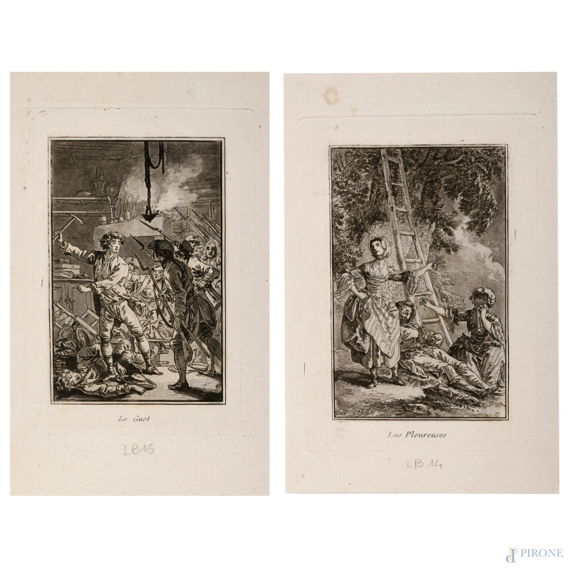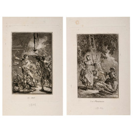 Jean-Baptiste Nicolas Le Prince (1734 – 1781), Coppia di incisioni dalla serie "Femmes de Moscovie", foglio cm 24x14,5, (lievi segni di usura)