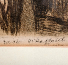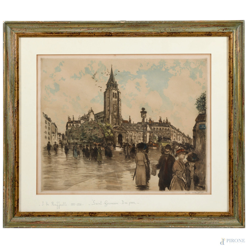Jean Francois Rafafelli, Place Saint-Germain des prés, acquaforte a colori, cm 50x60 compreso passepartout, firmata in basso a destra, entro cornice, (lieve foxing e ondulazioni della carta)