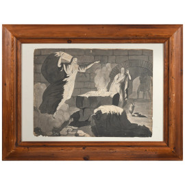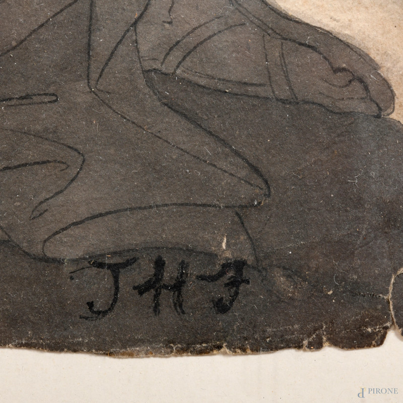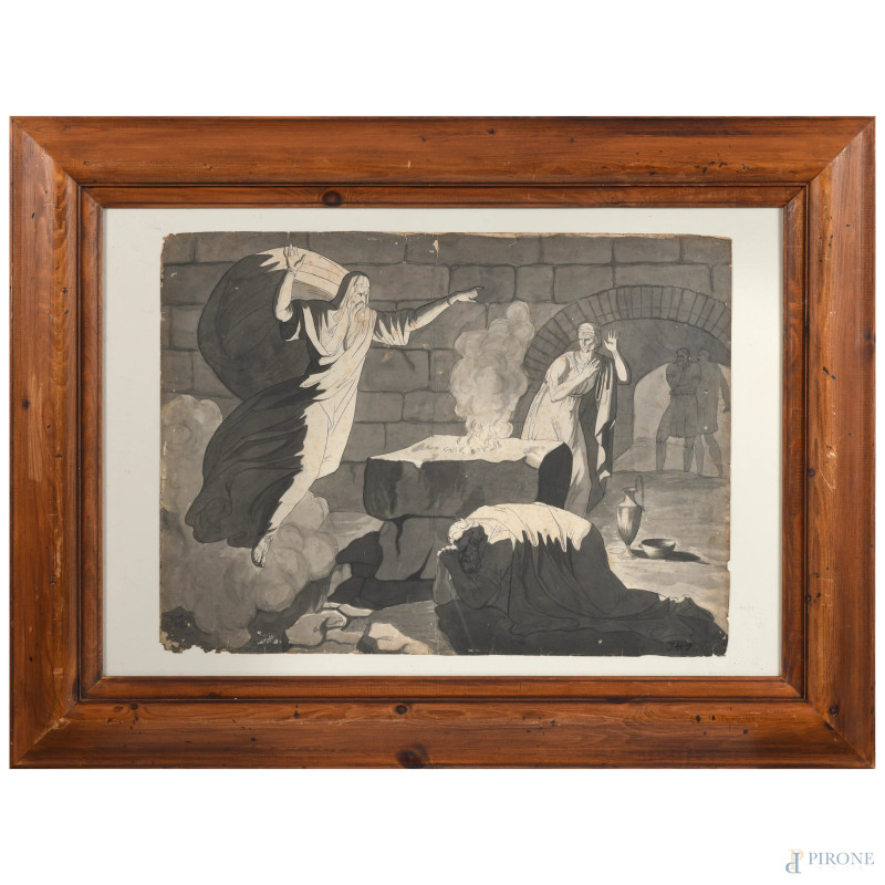 La supplica, XIX-XX secolo, tecnica mista su carta, cm 43x58, firmato in basso a sinistra, entro cornice, (segni di piegatura, strappi, piccole cadute di colore, abrasioni, segni di usura)