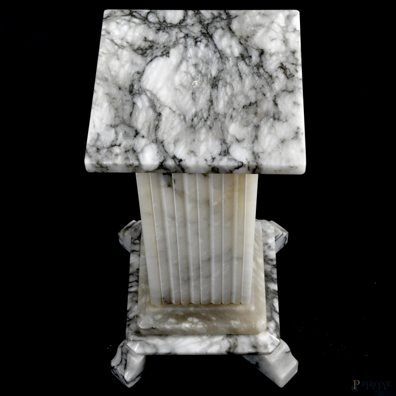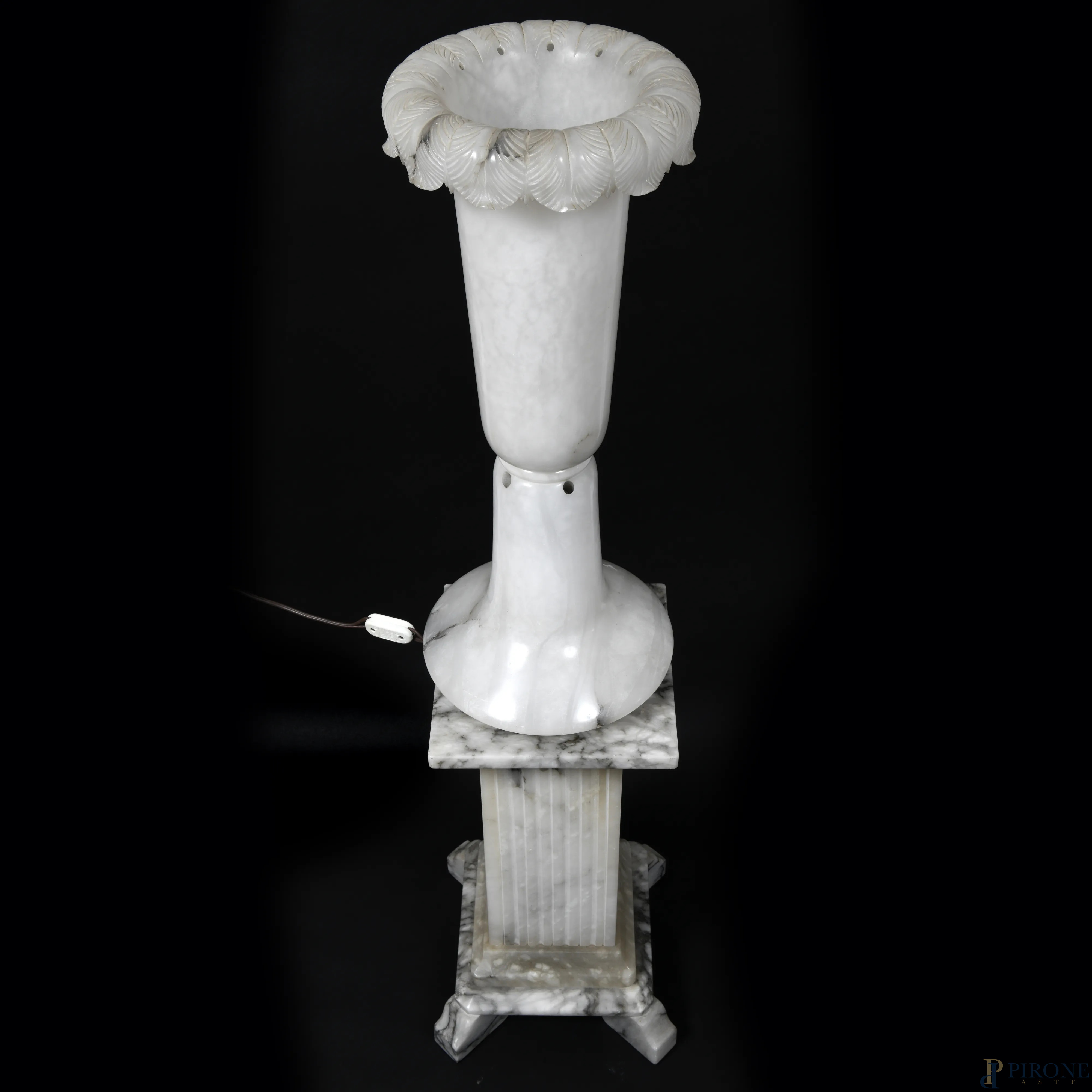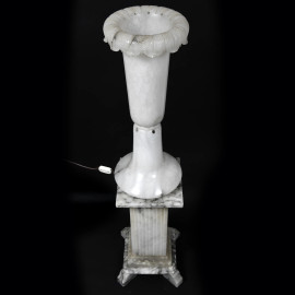 Lampada con struttura in alabastro e profilo superiore fogliato poggiante su colonna rastremata di sezione quadrata. XX secolo, altezza complessiva cm 120,(lievi segni di usura, da revisionare)
