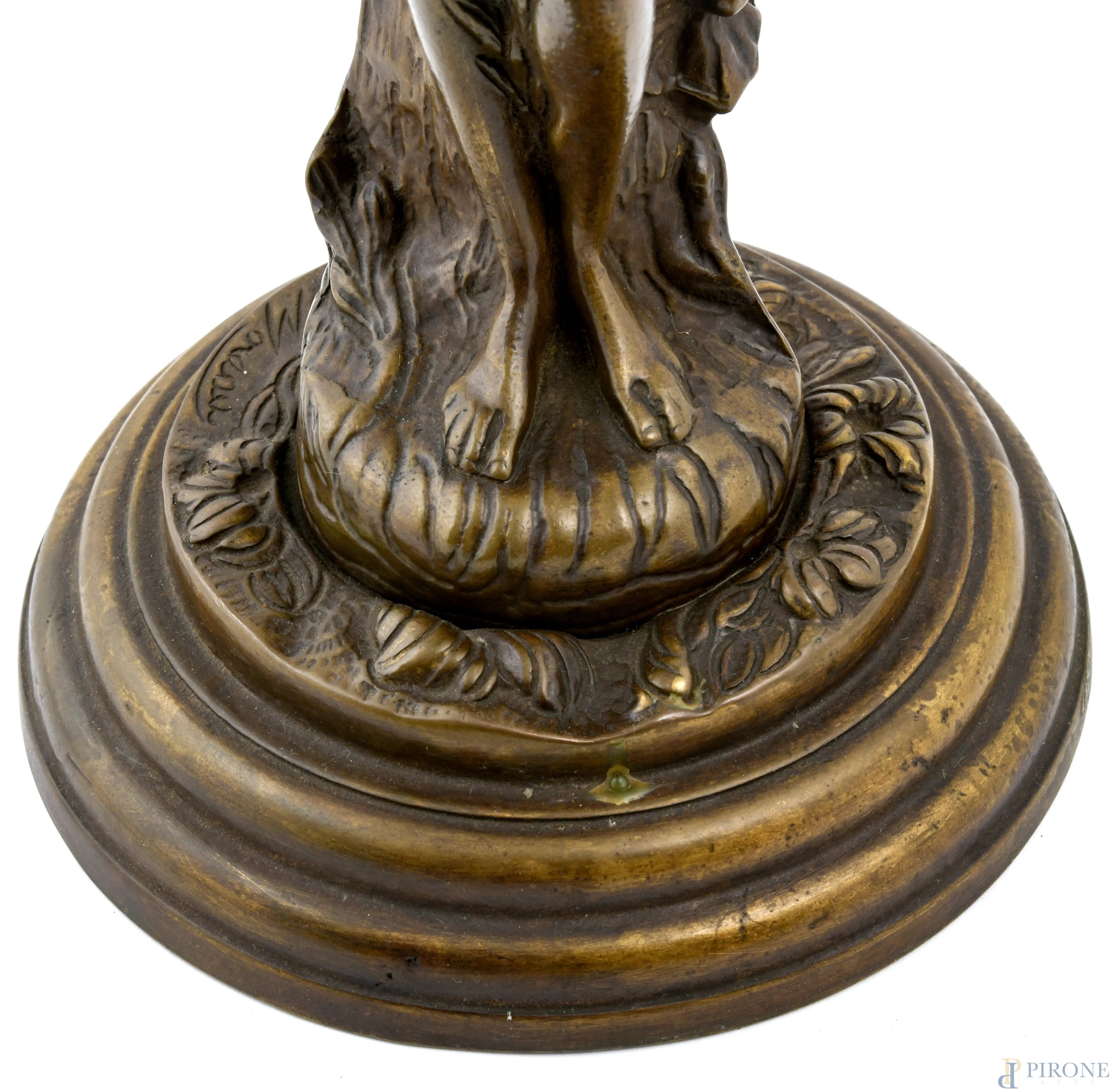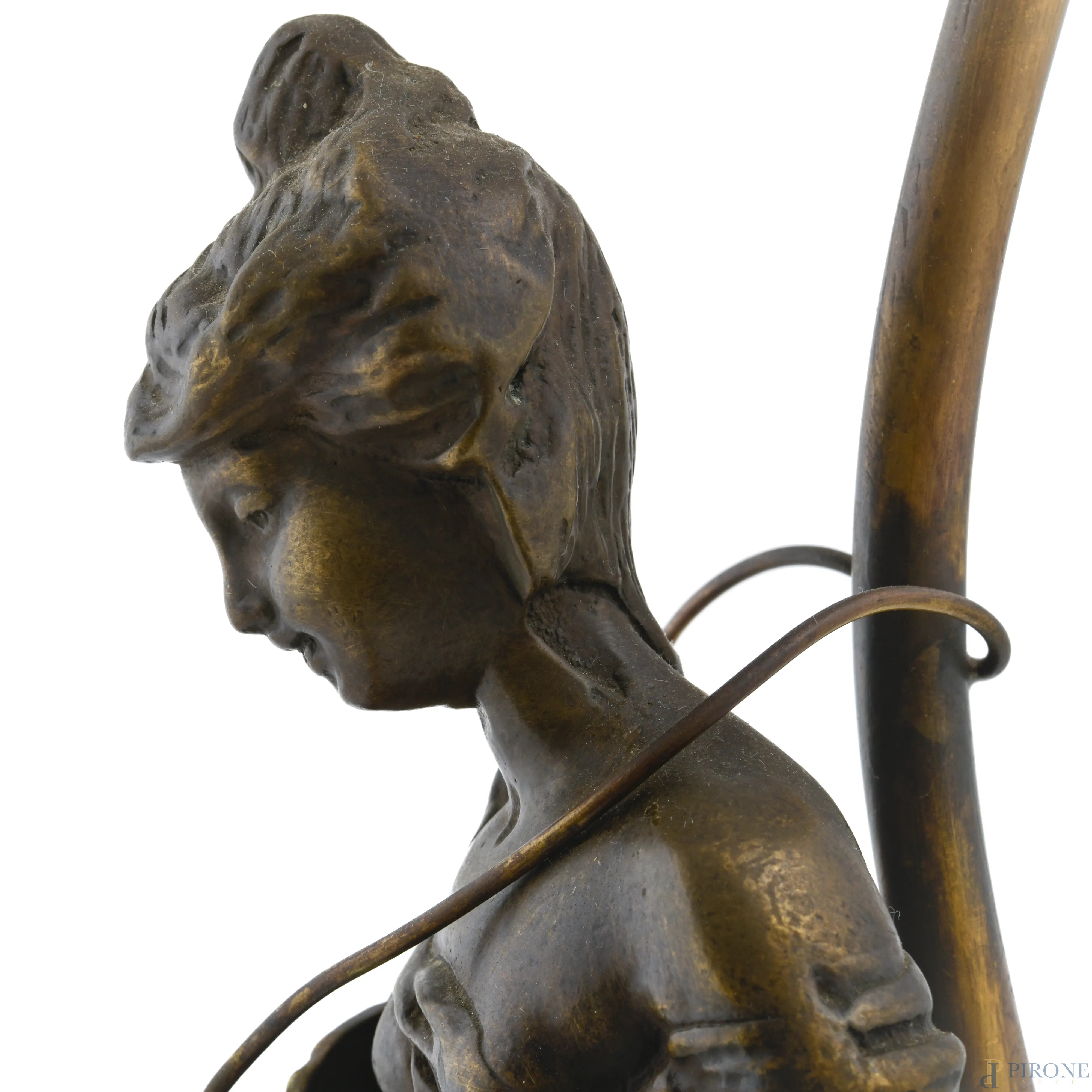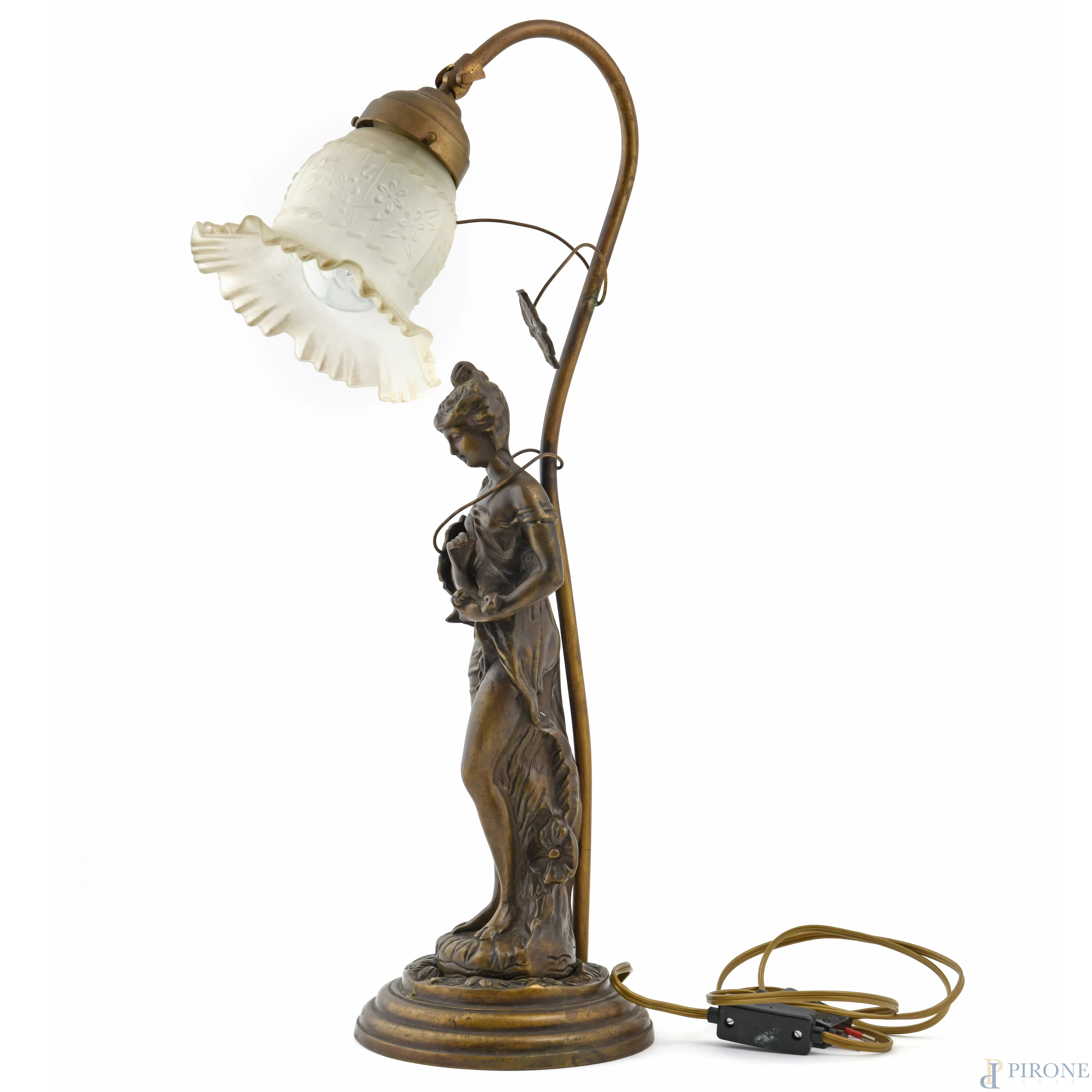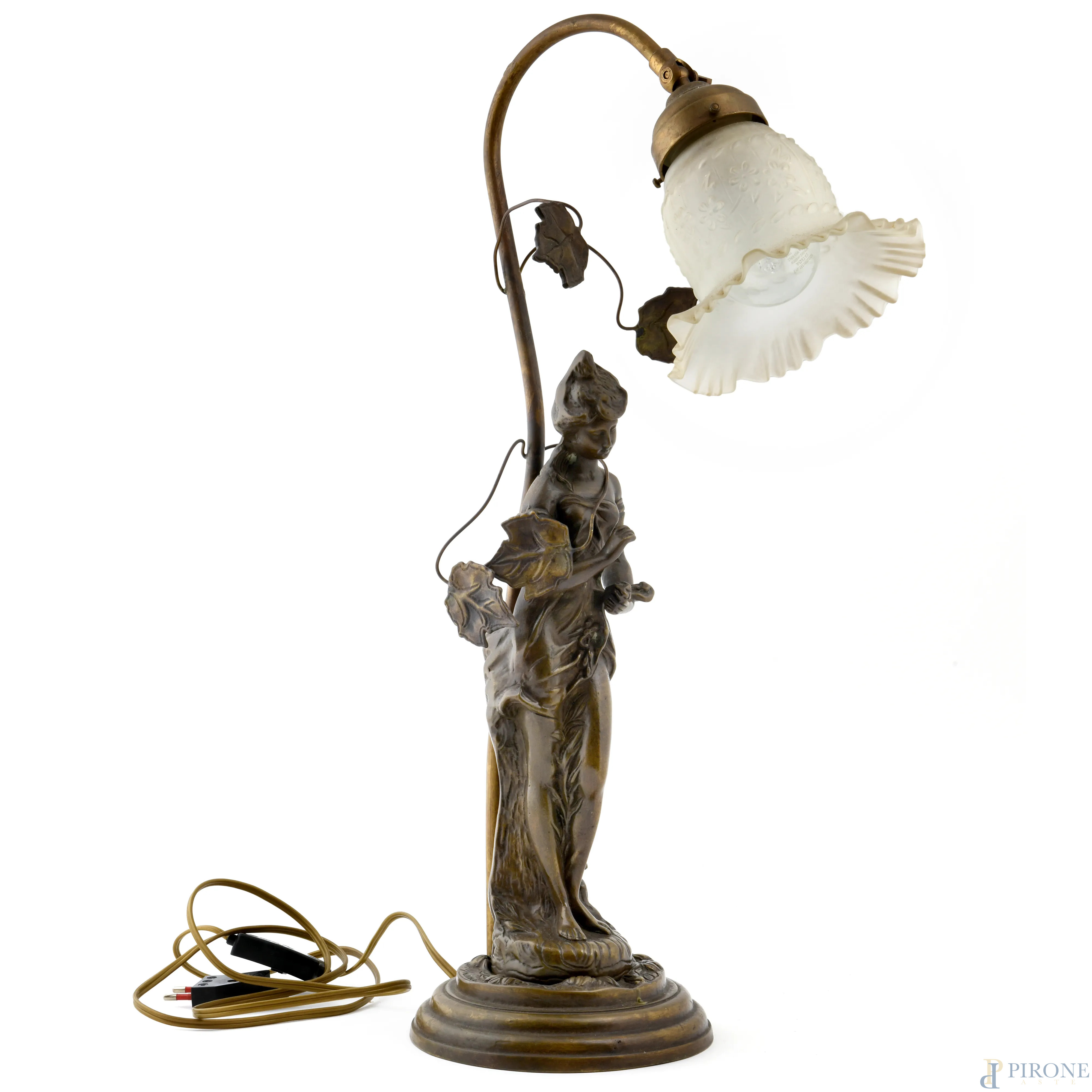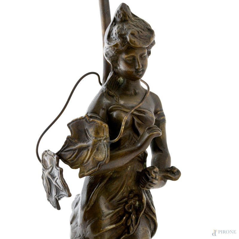 Lampada da tavolo con struttura in bronzo a guisa di figura femminile e tralci di vite, XX secolo, altezza cm 56, (segni di usura, da revisionare)