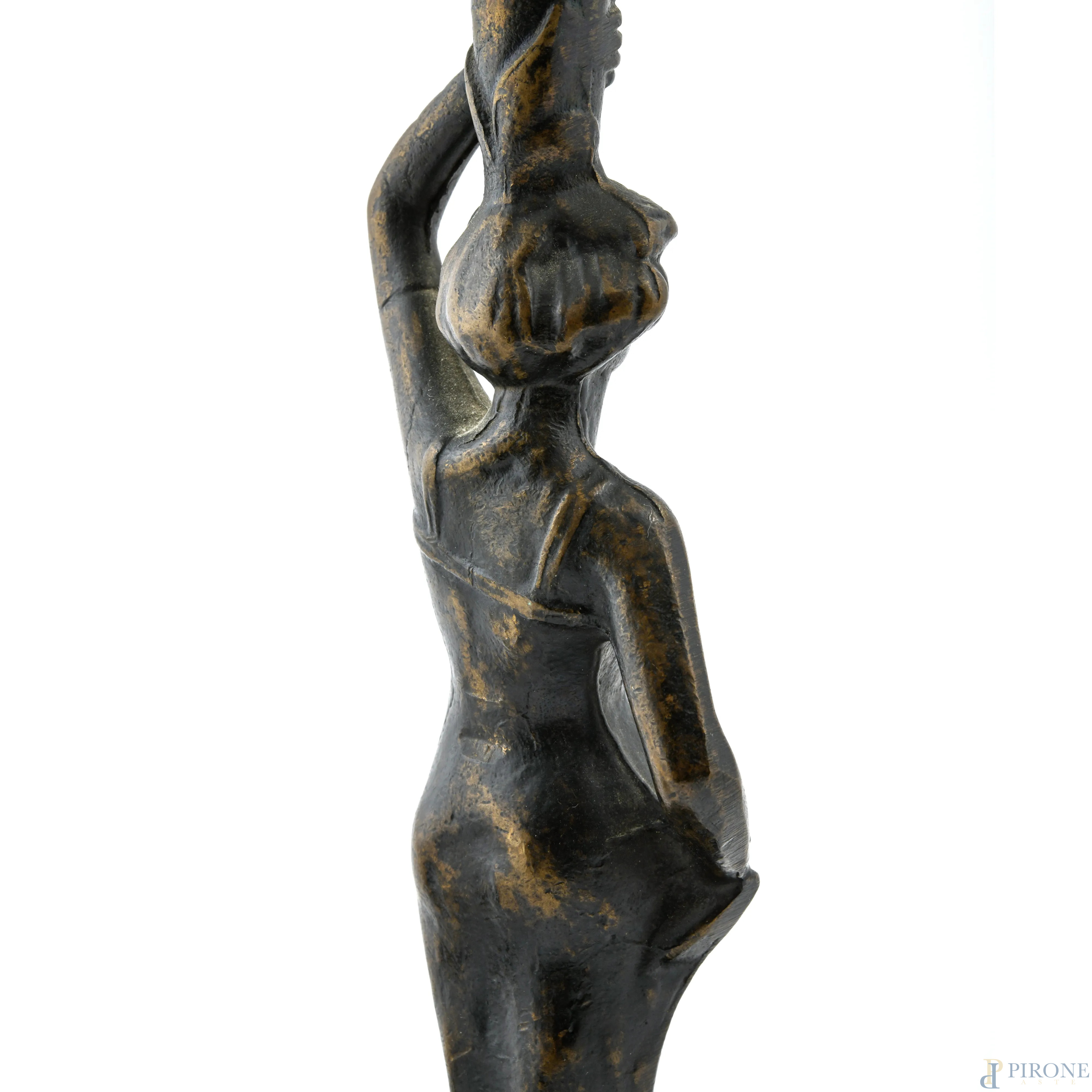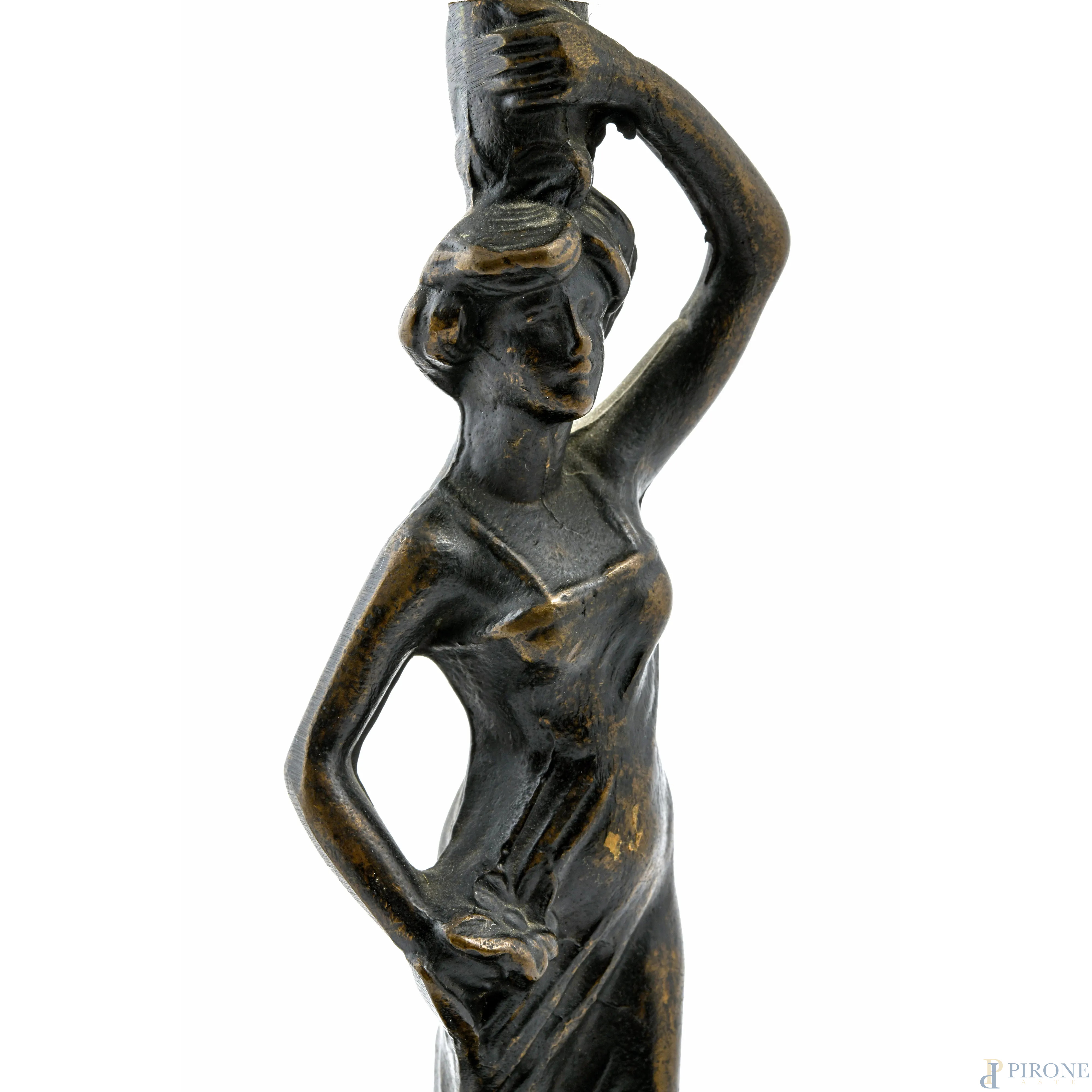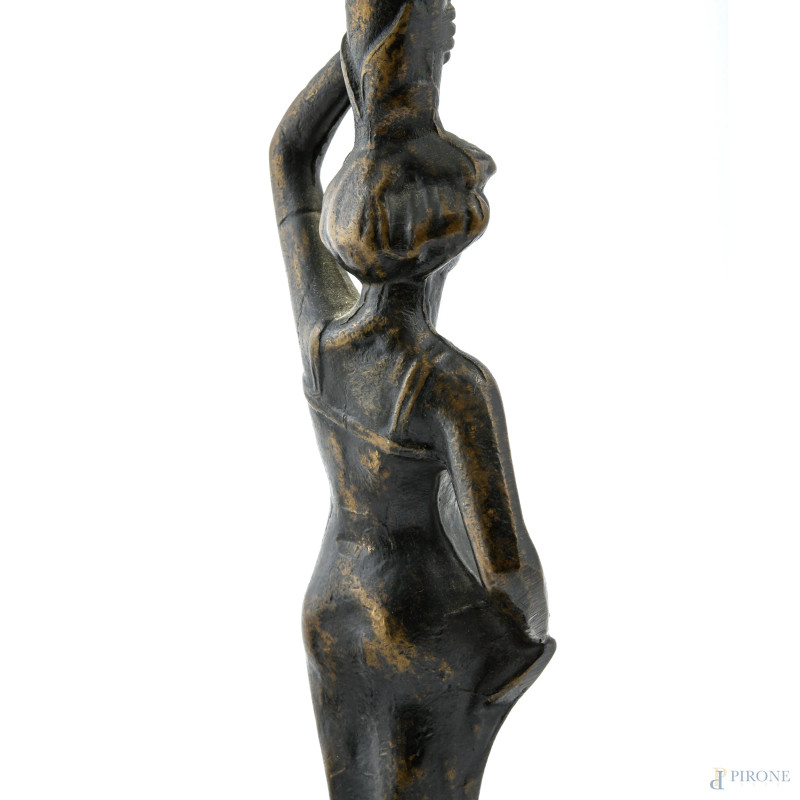 Lampada da tavolo con struttura in bronzo a guisa di figura femminile, XX secolo, altezza cm 45, (segni di usura, da revisionare)
