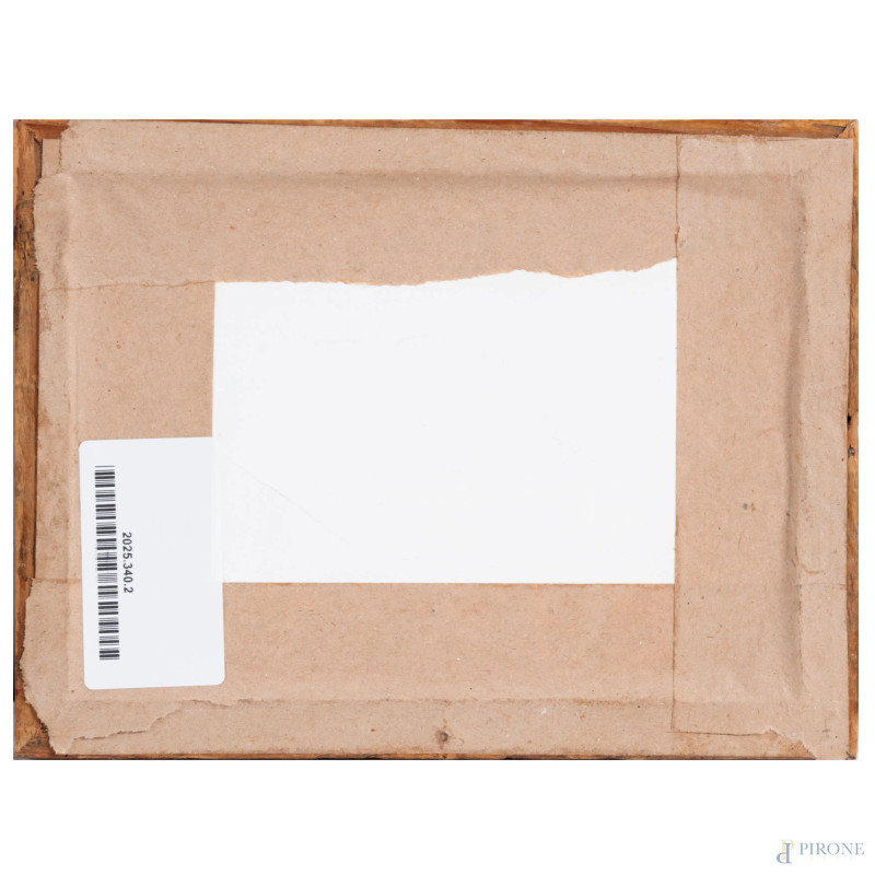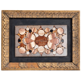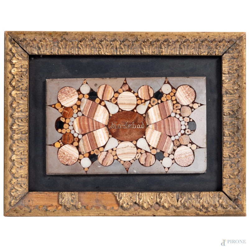 Lastra in pietra con commessi a vari marmi, primo XX secolo, cm 7,5x13, entro cornice