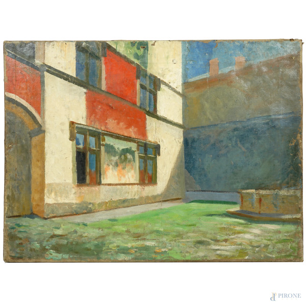 Lo studio, XX secolo, olio su masonite, cm 80x70, entro cornice, (piccoli sollevamenti di colore)