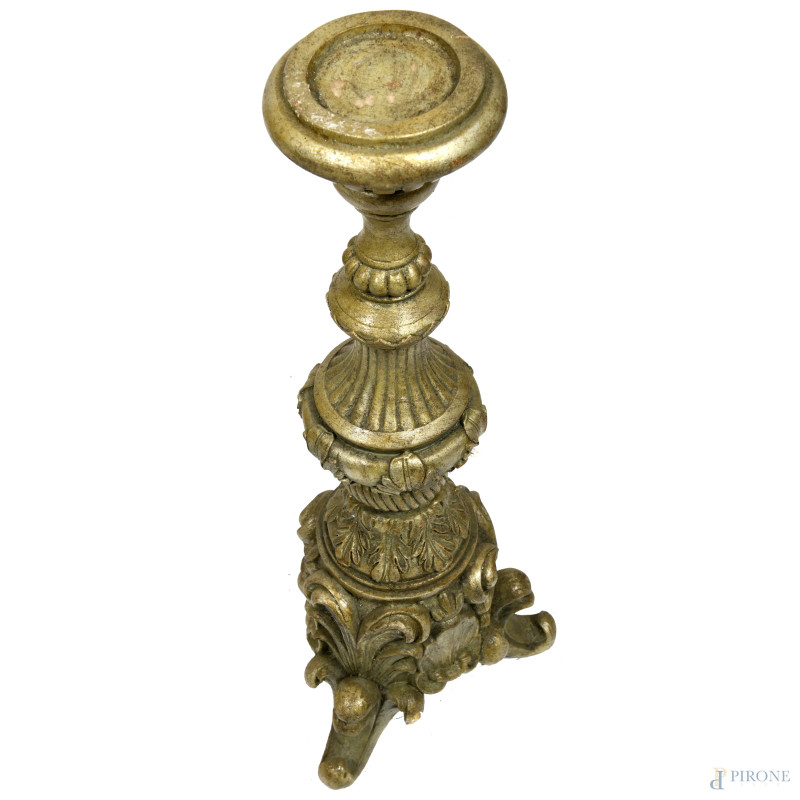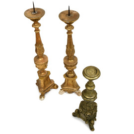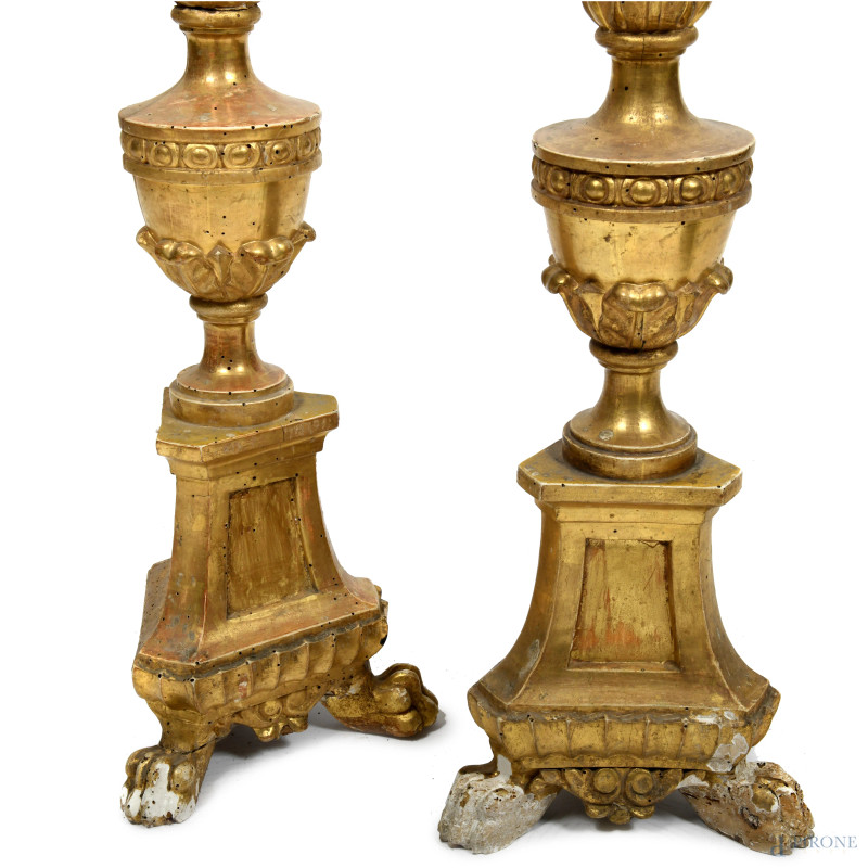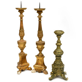 Lotto composta da una coppia di portaceri e da un portacero montati a lampada da terra in legno intagliato, dipinto e dorato, XX secolo, altezza massima cm 93, (segni di usura, fori di tarlo, scalfiture)
