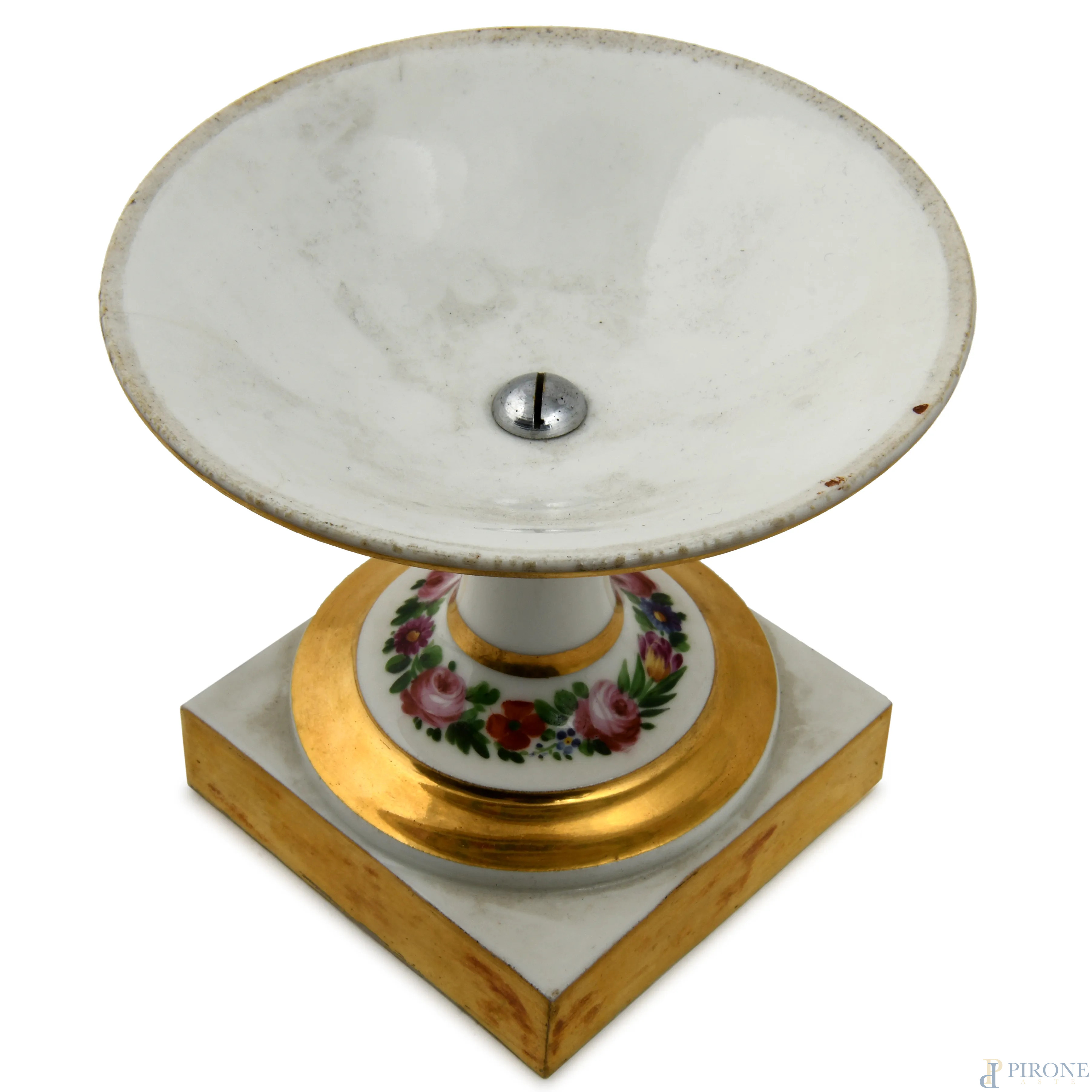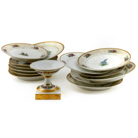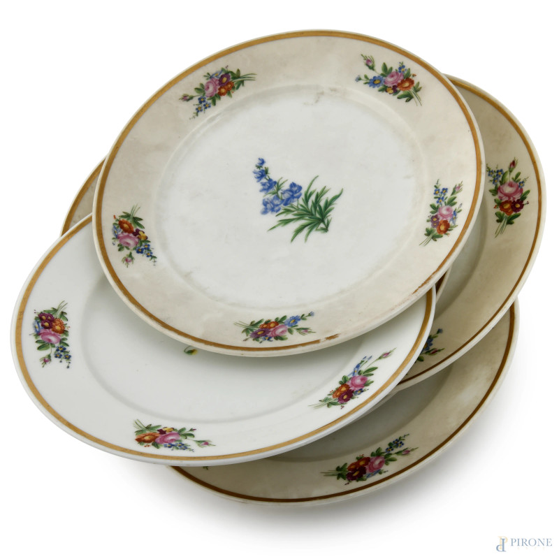 Lotto composto da 13 piatti e un'alzatina di diversa manifattura con motivi floreali, XX secolo, diametro massimo cm 23, (segni di usura, scoloriture, difetti)