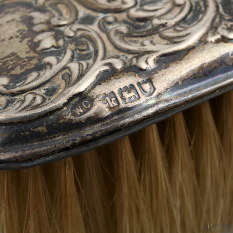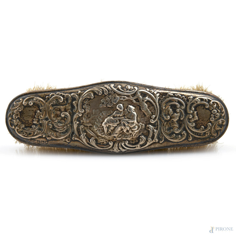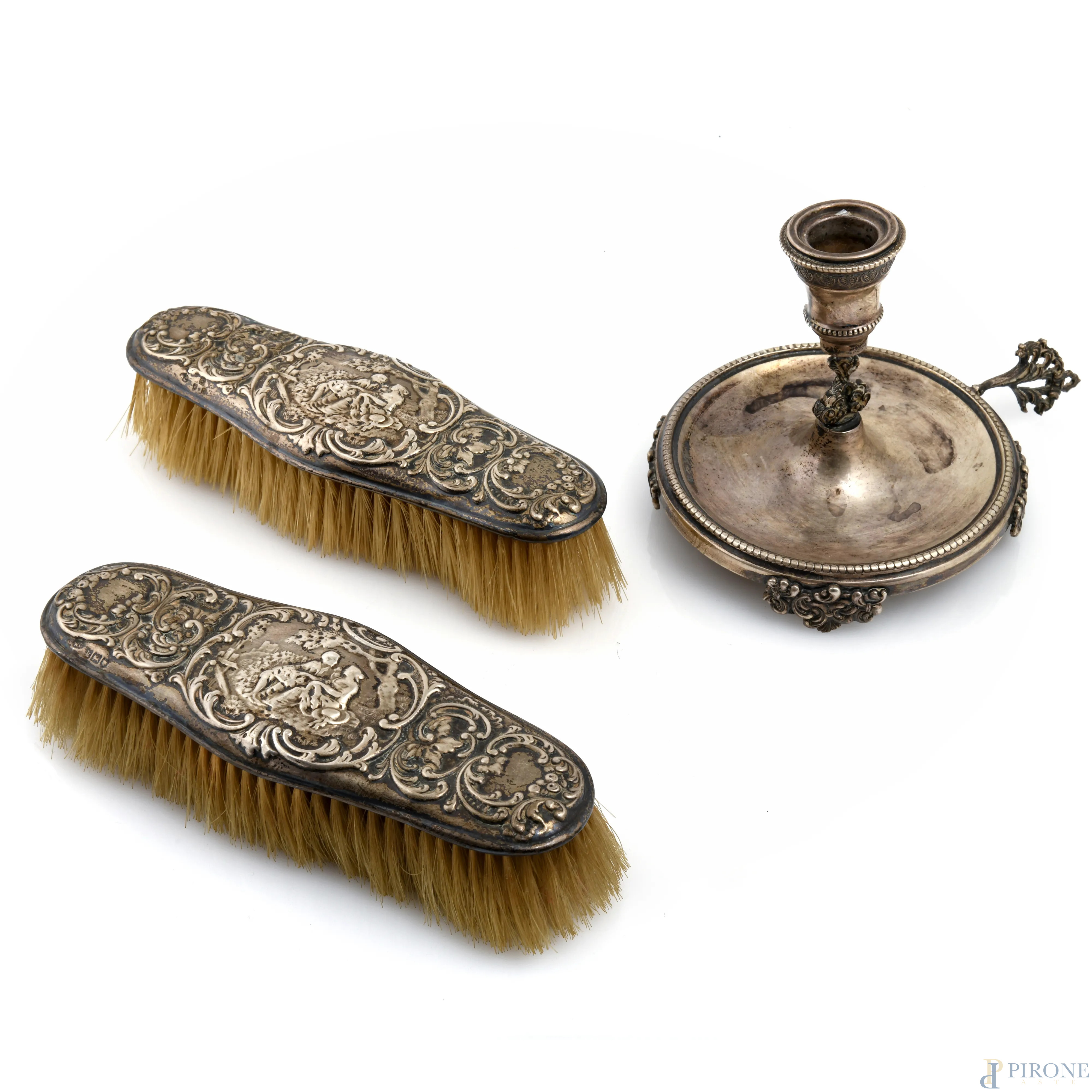 Lotto composto da due spazzole e una bugia in argento 800/000, XX secolo, misura massima cm 17, peso lordo gr 380