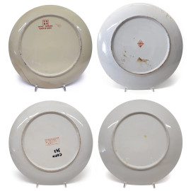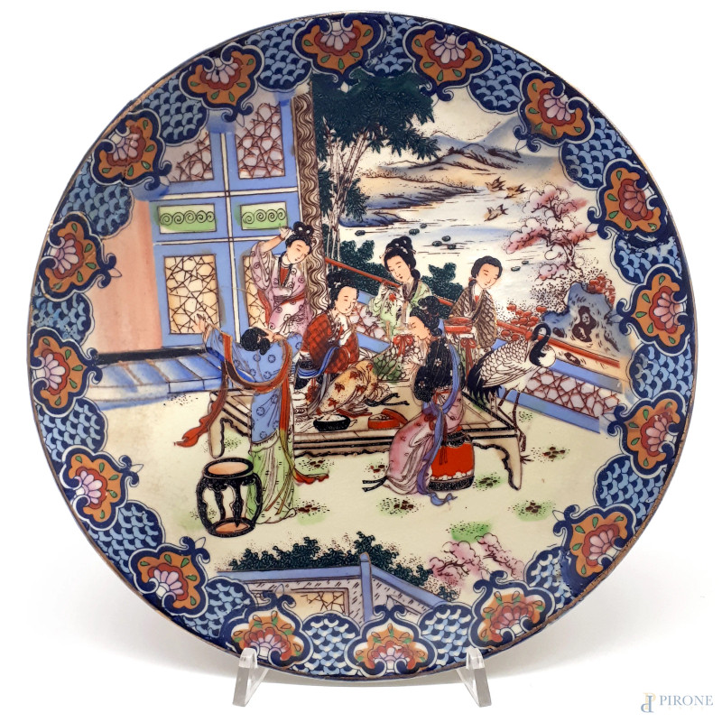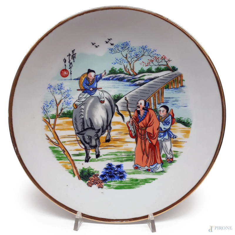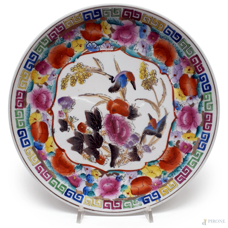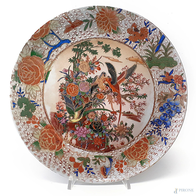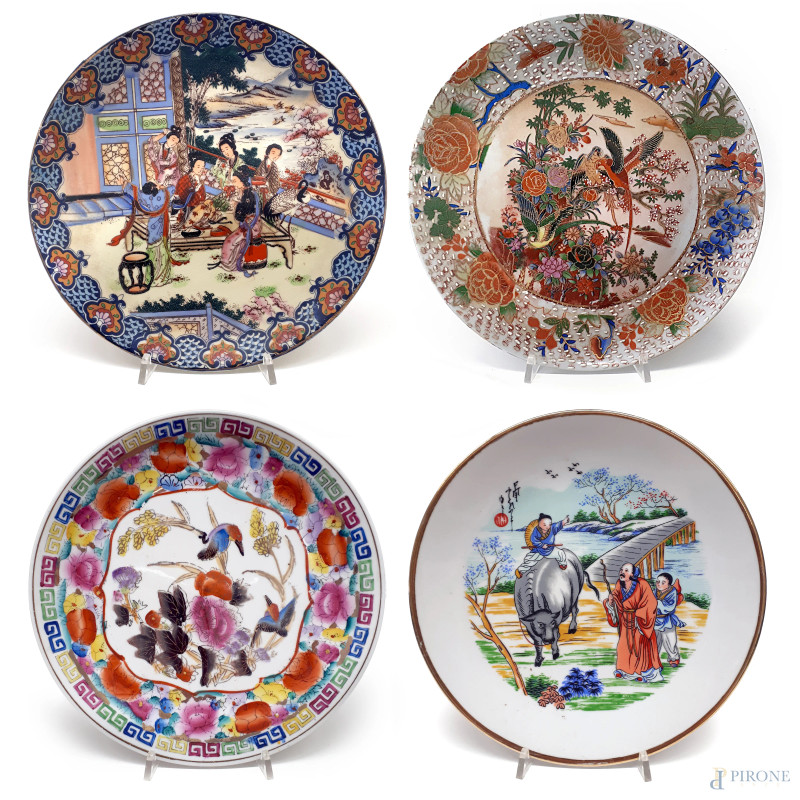 Lotto composto da quattro piatti in porcellana di tarda Dinastia Repubblica Popolare Cinese (XX sec.), finemente dipinti a mano, Cina Popolare e un piatto in porcellana giapponese della provincia di Satsuma dei primi del Novecento, periodo Meiji Jidai/Showa, ciascuno diametro cm 26
