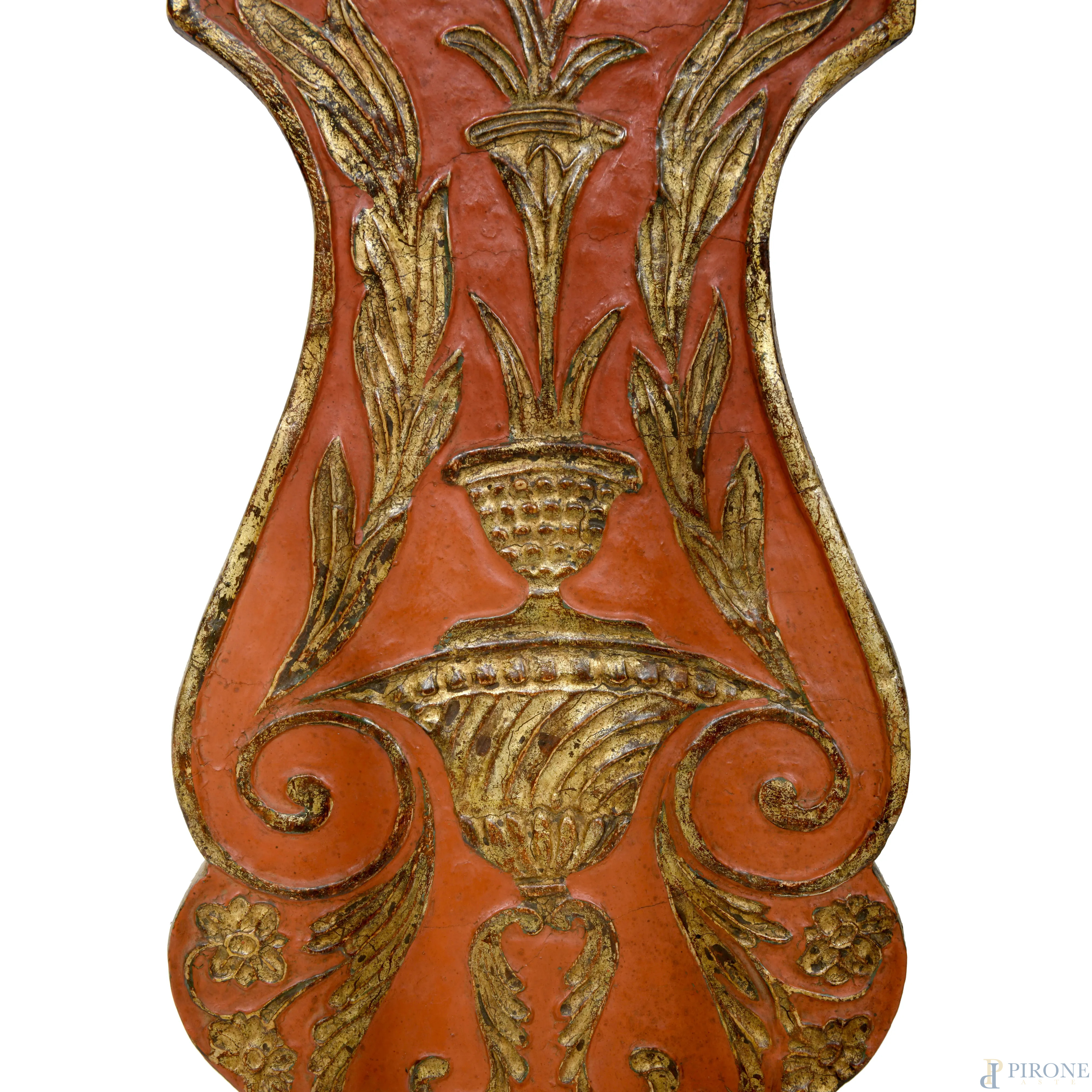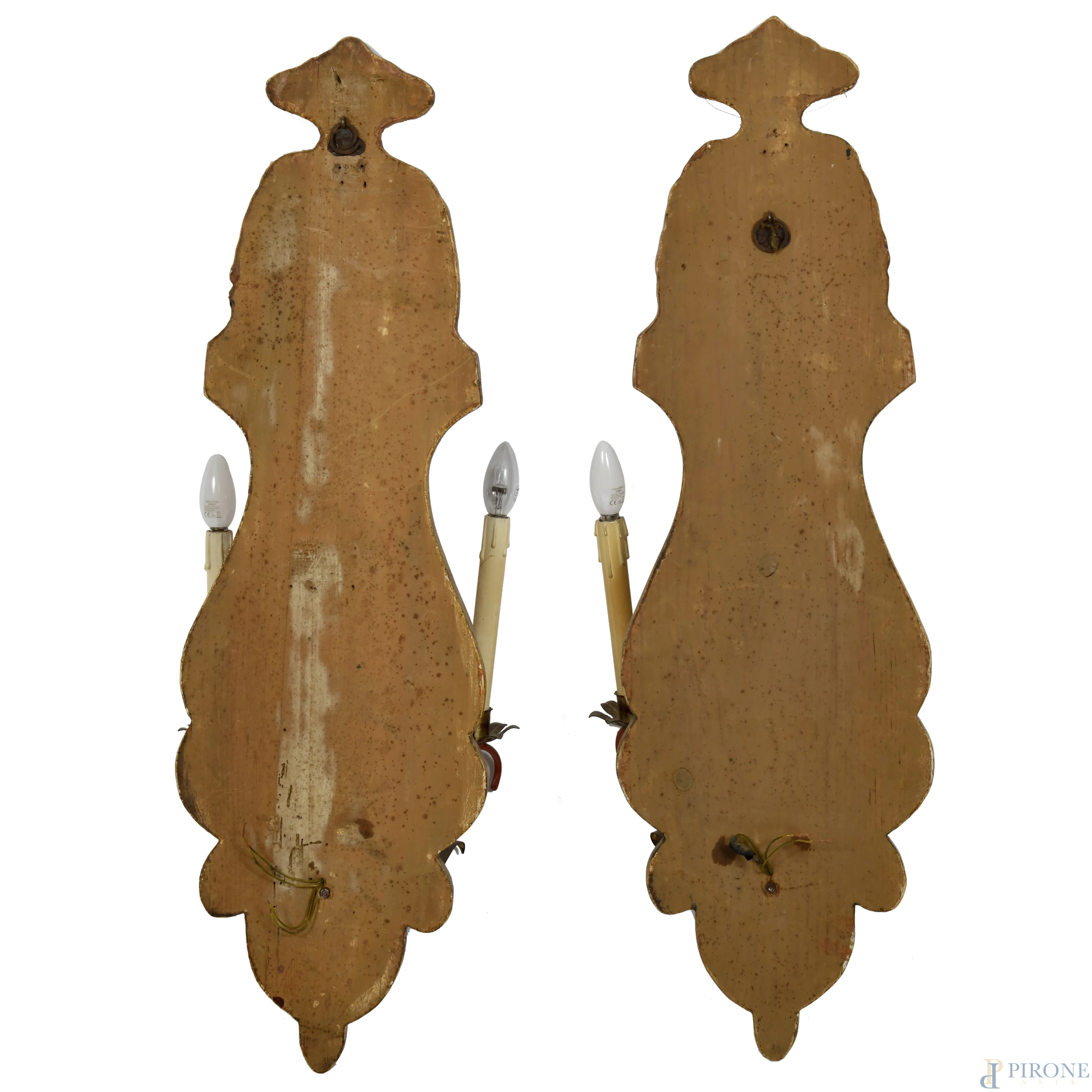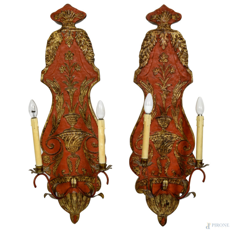 Lotto di due appliques a due fuochi con struttura in legno e metallo dipinto e dorato, XX secolo, cm 93x29, (segni di usura, graffi, scalfiture, difetti)