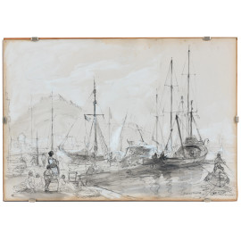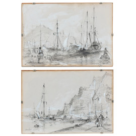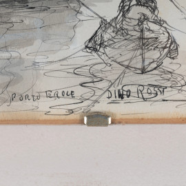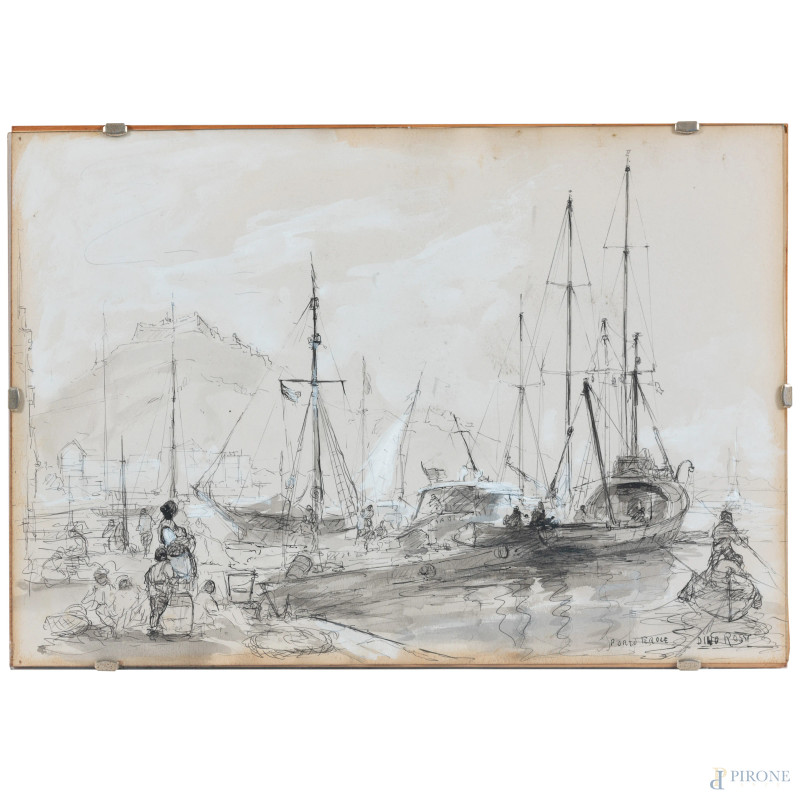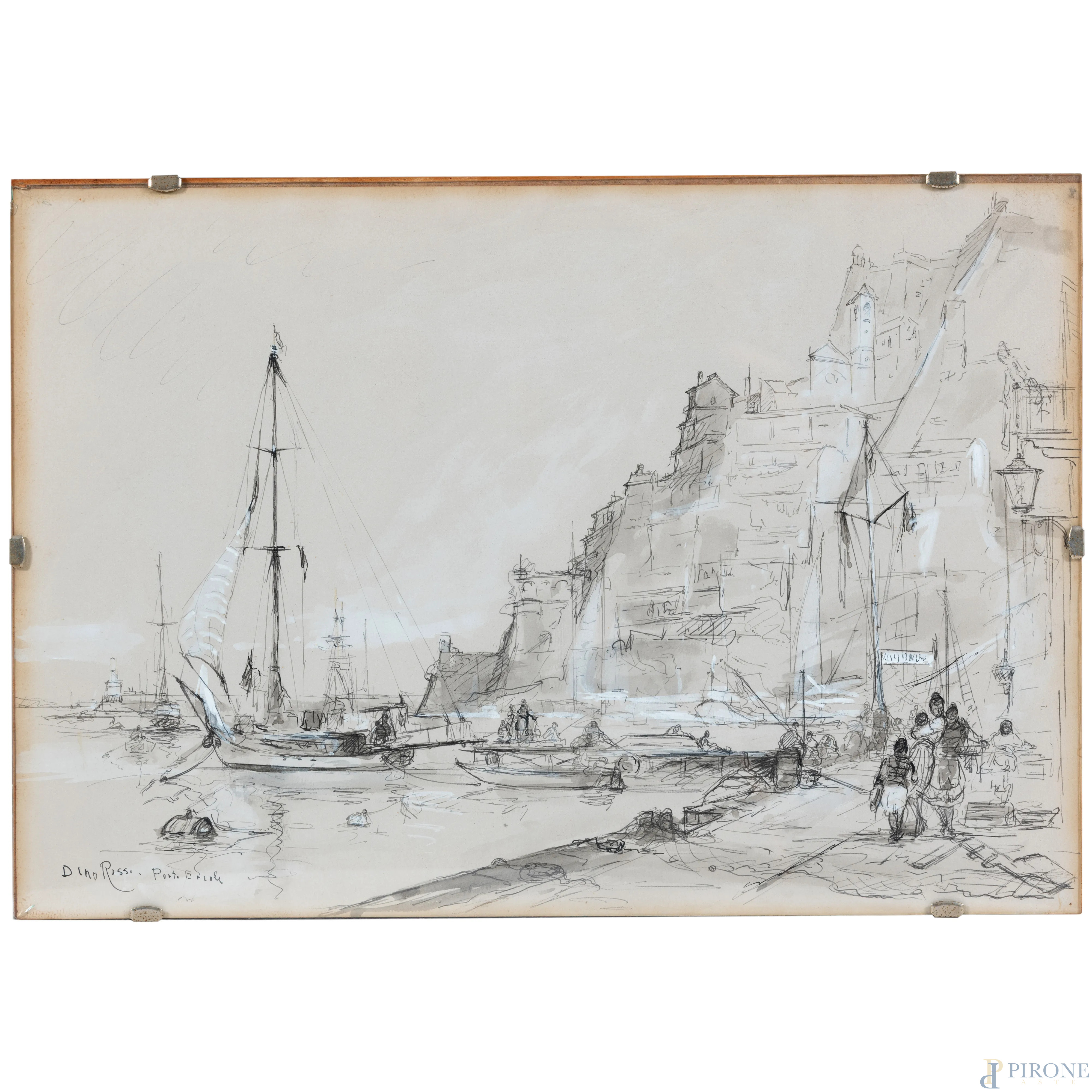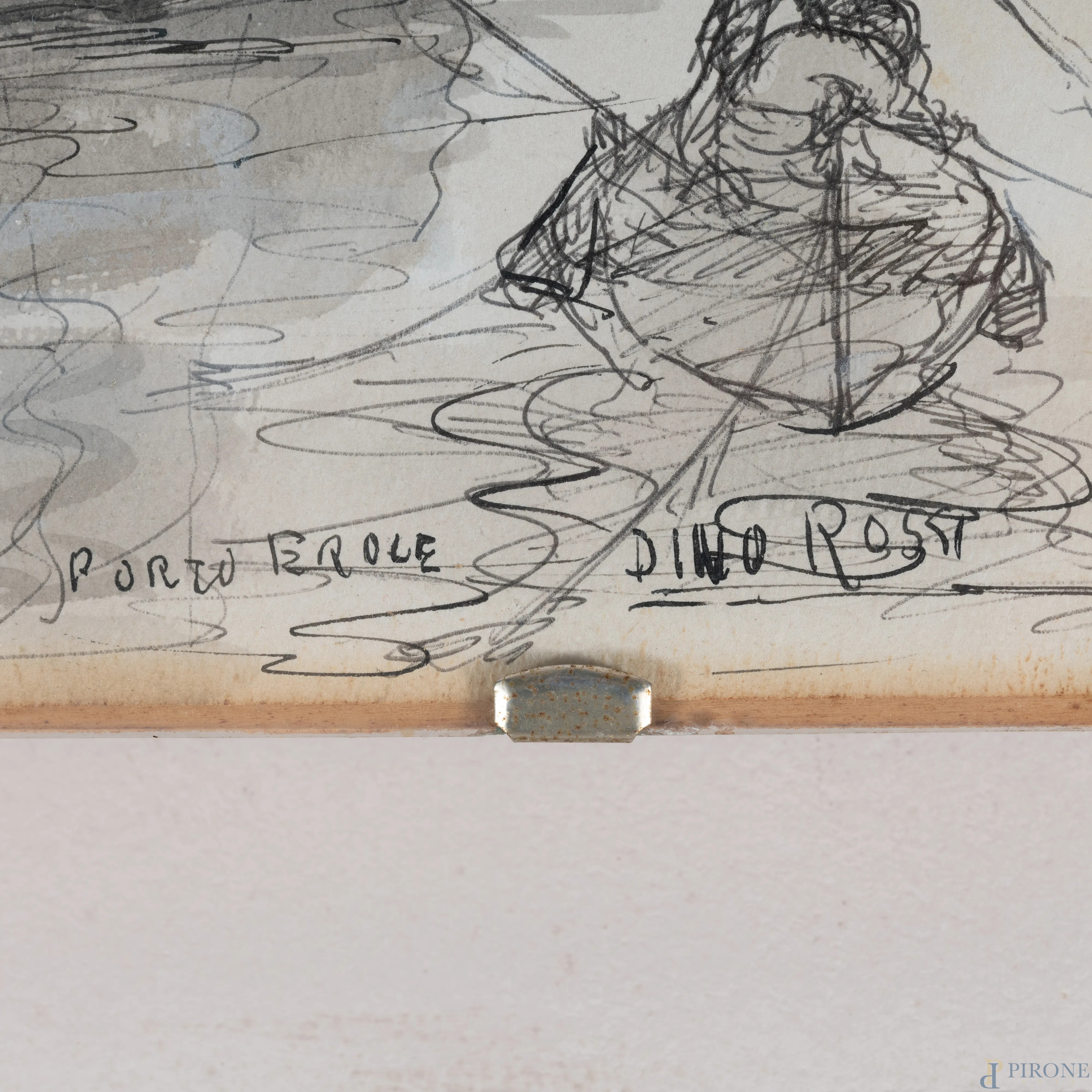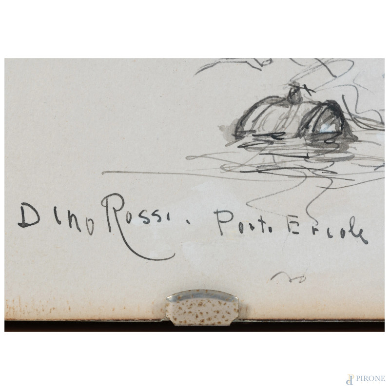 Lotto di due disegni a tecnica mista di Dino Rossi (1904 - 1982) raffiguranti porto Ercole, cm 33x49, firmati e titolati in basso, entro cornice
