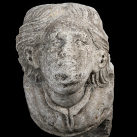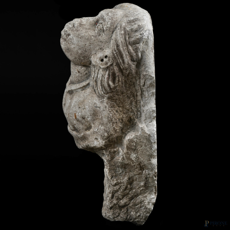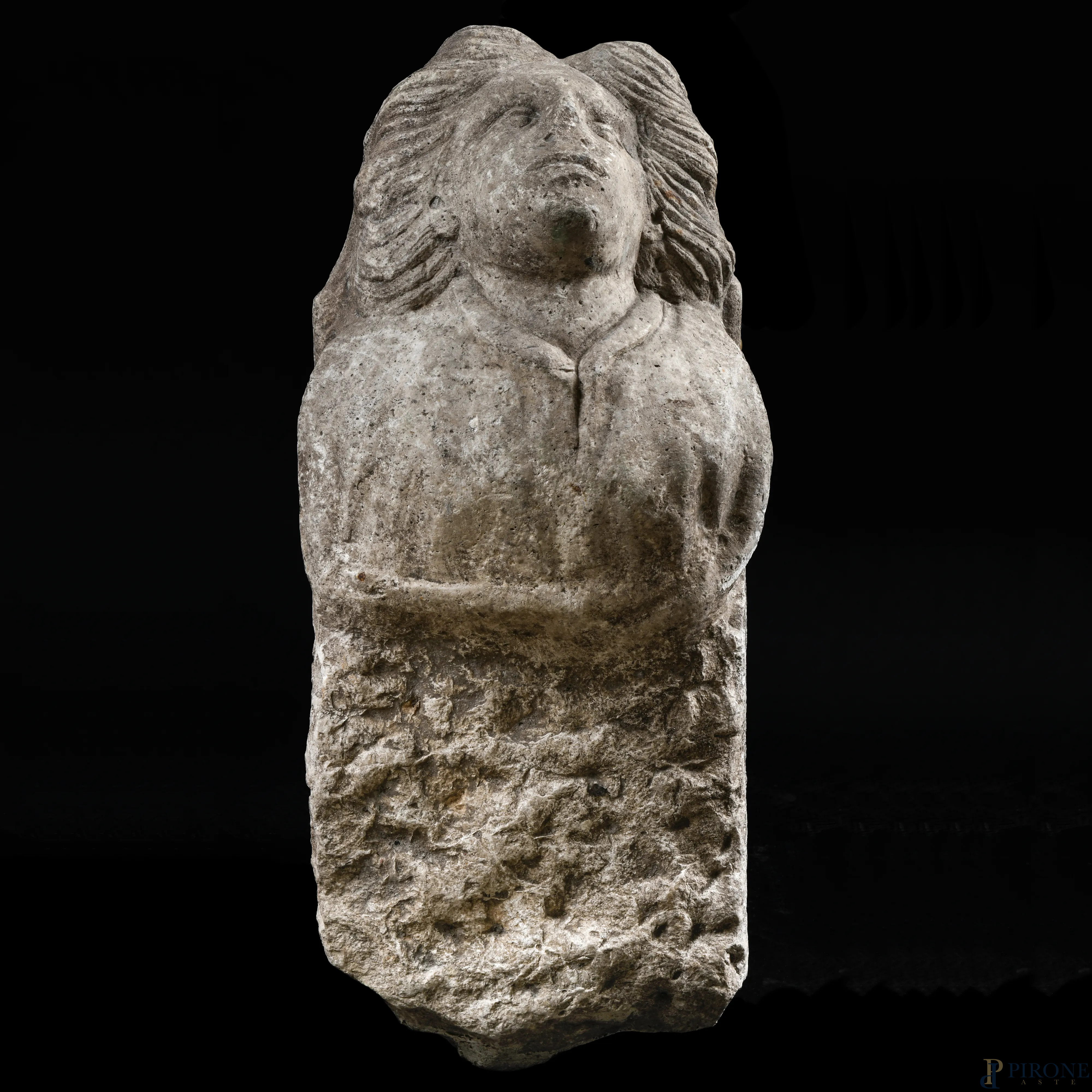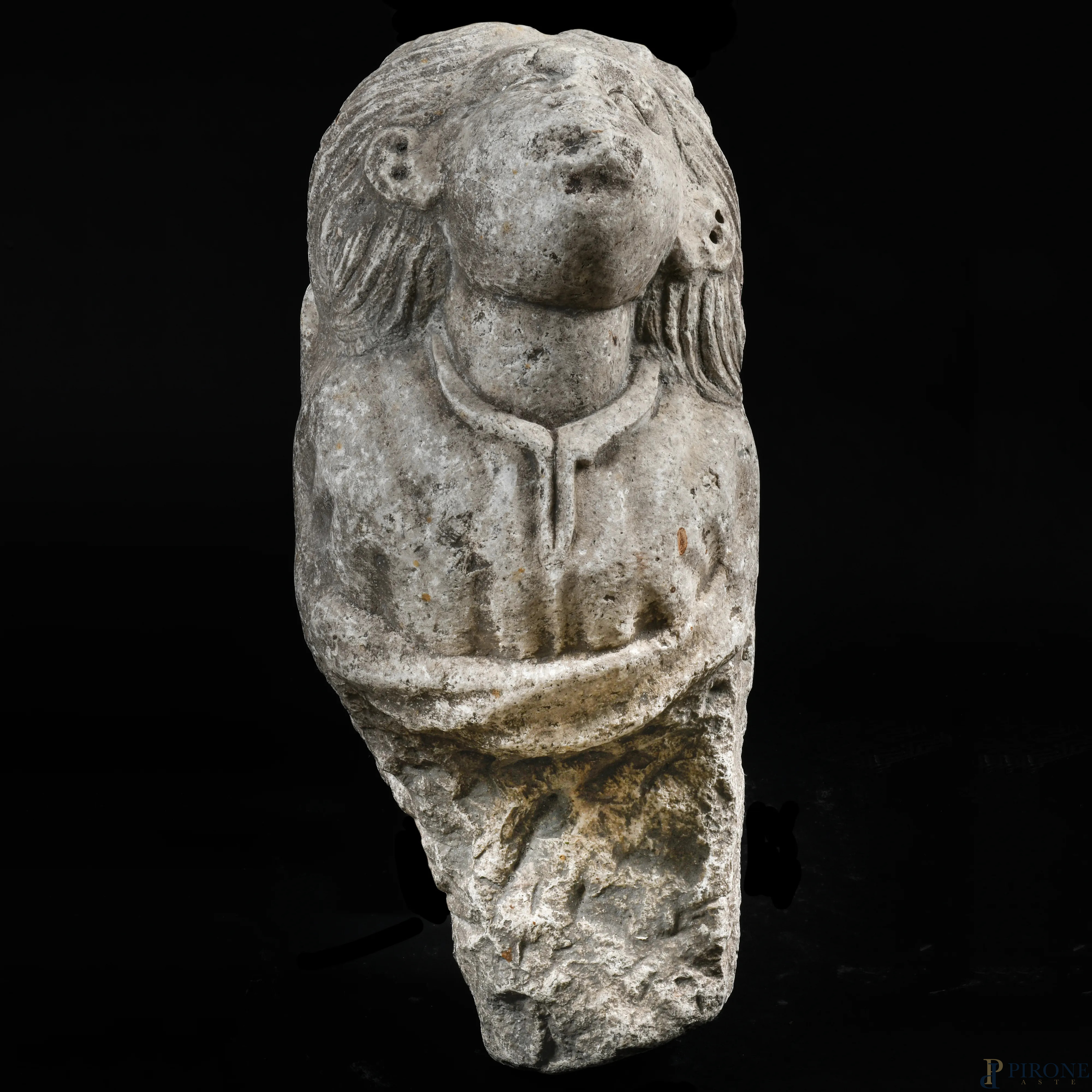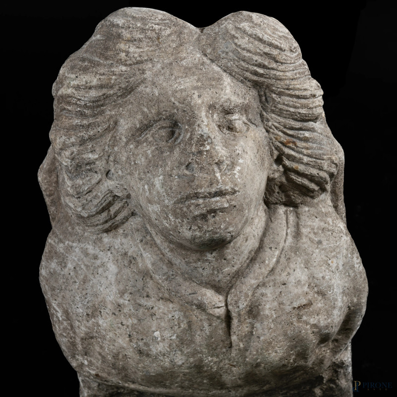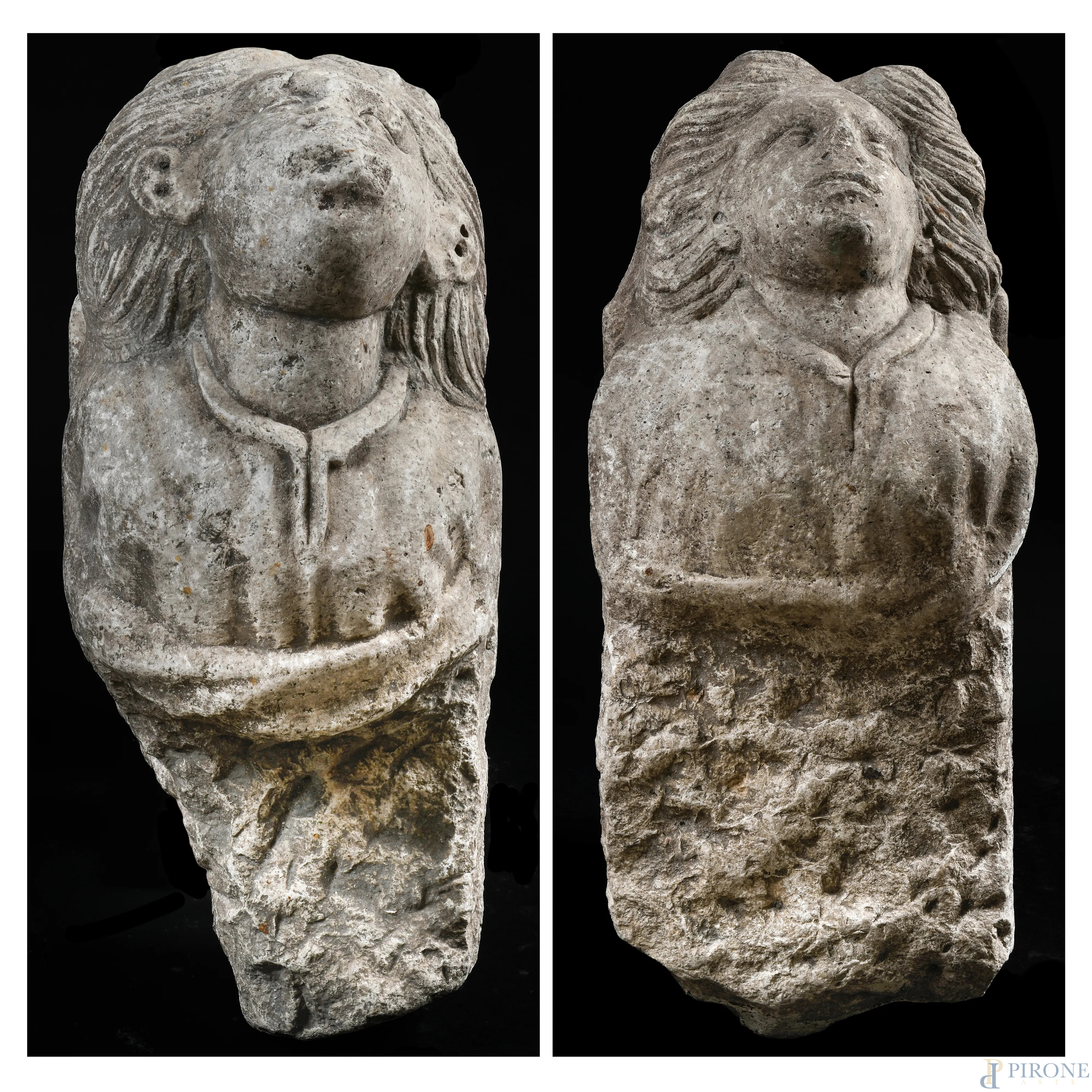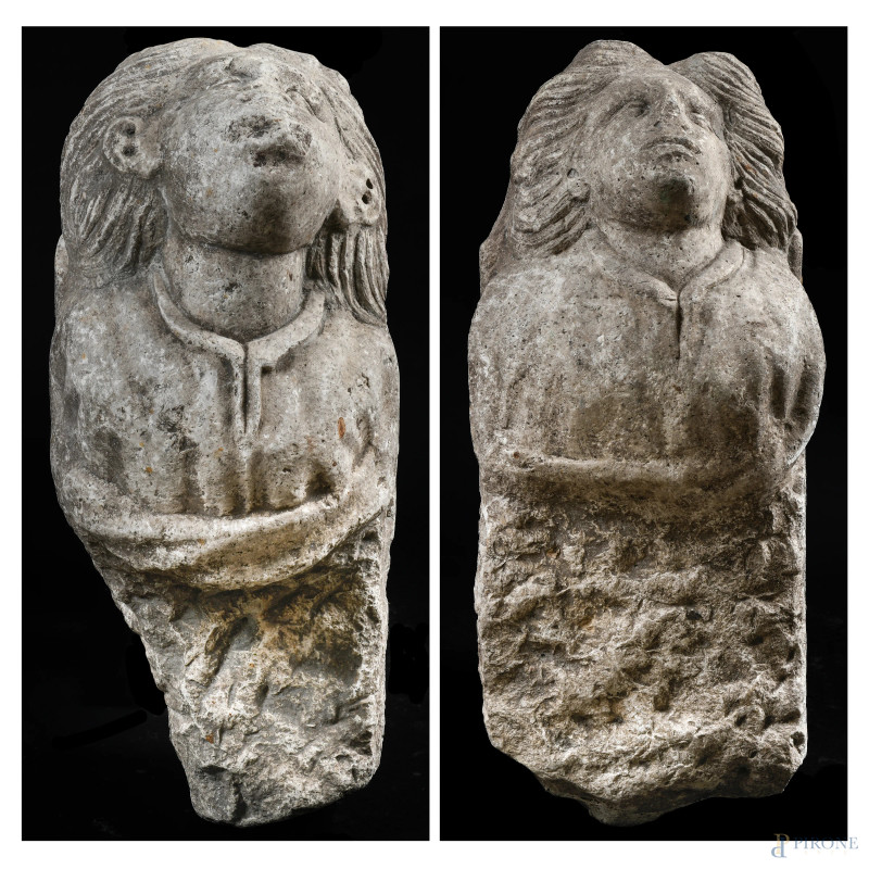 Lotto di due frammenti scultorei in pietra raffiguranti busti femminili, XVII-XVIII secolo, cm 68x28x29 ca., (segni di usura, scalfiture, mancanze)
